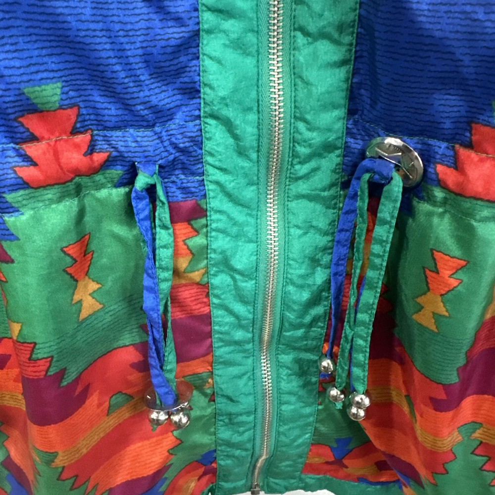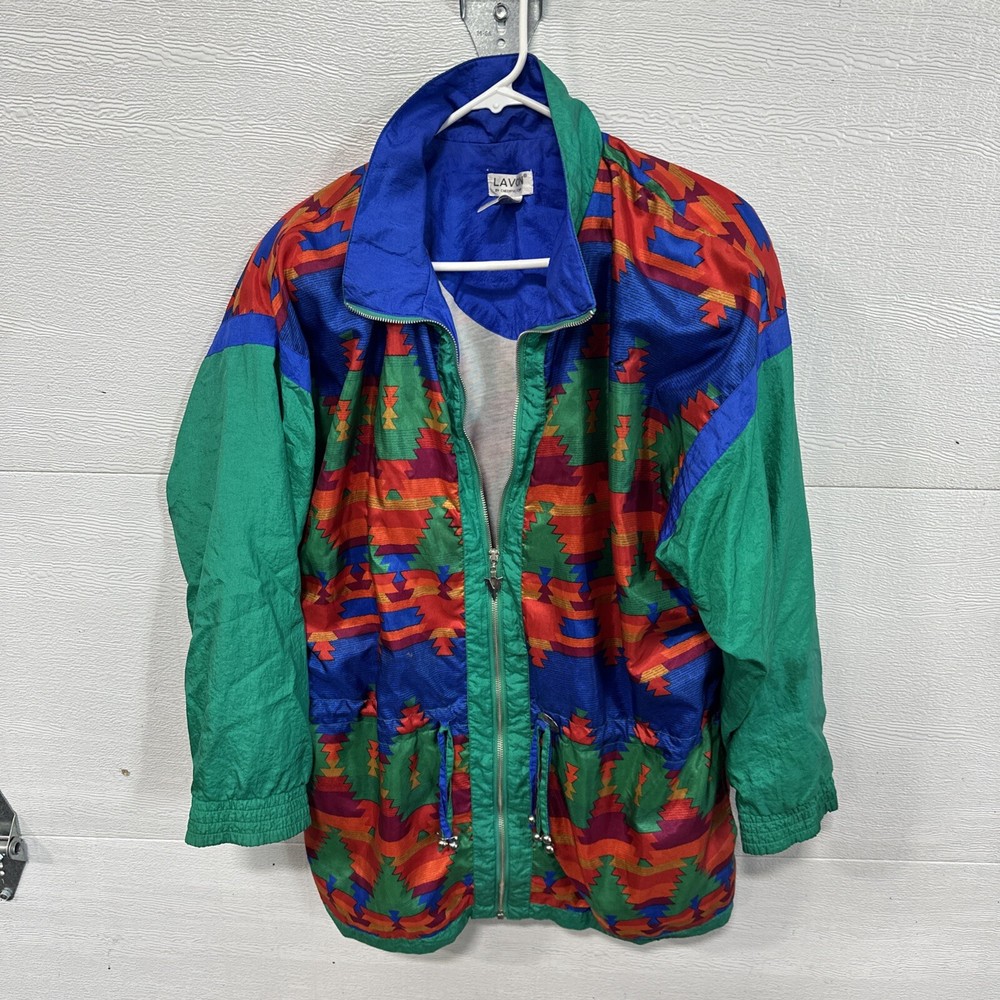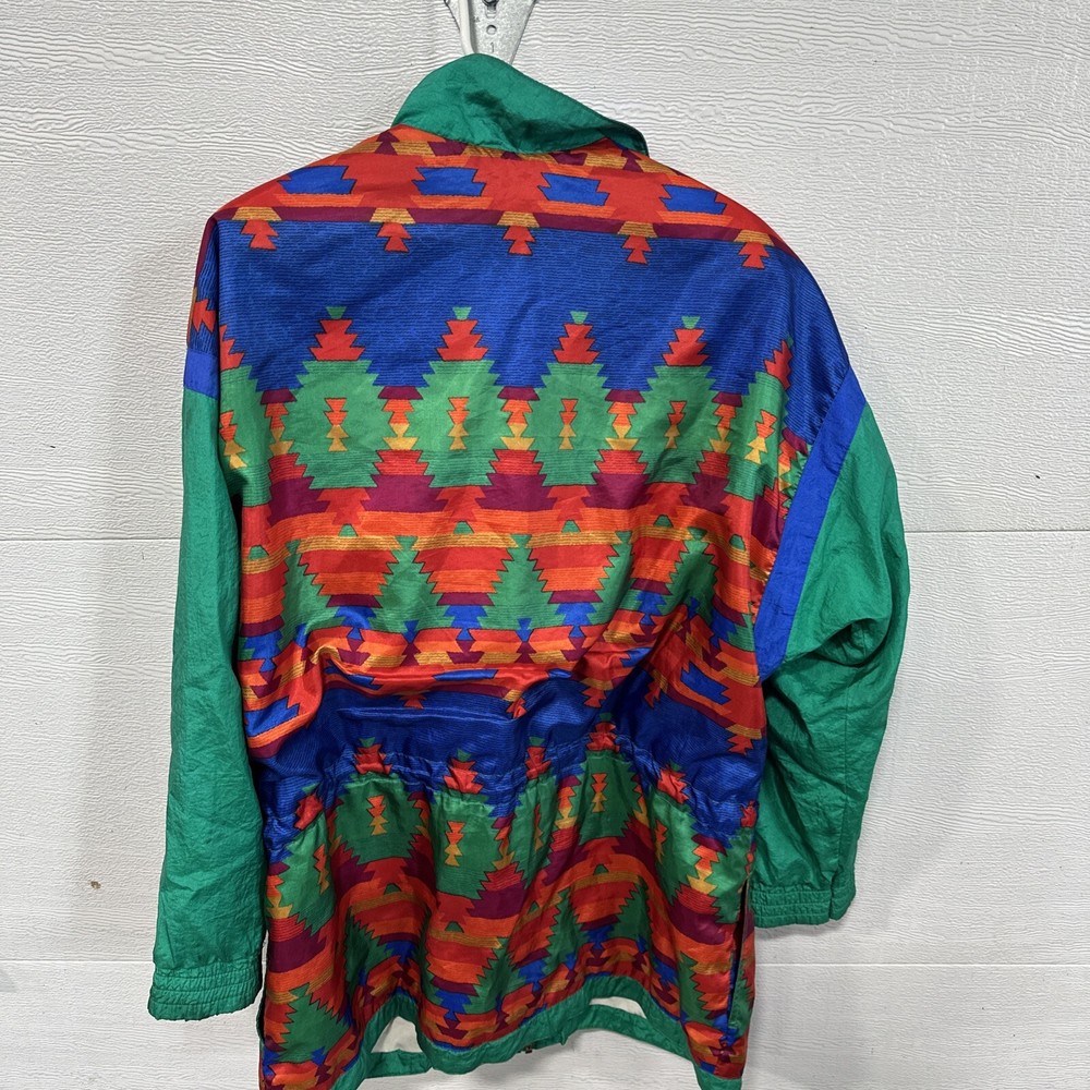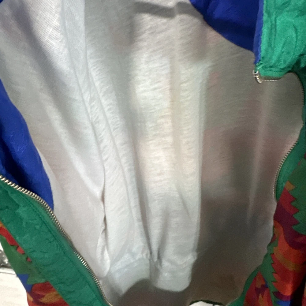 Great looking wind breaker with vibrant colors. This has no know defects and the zipper works great Full length is 33inches Sleeve length from under arm is 18.5 Width at under arm is 25...