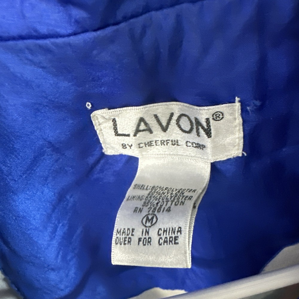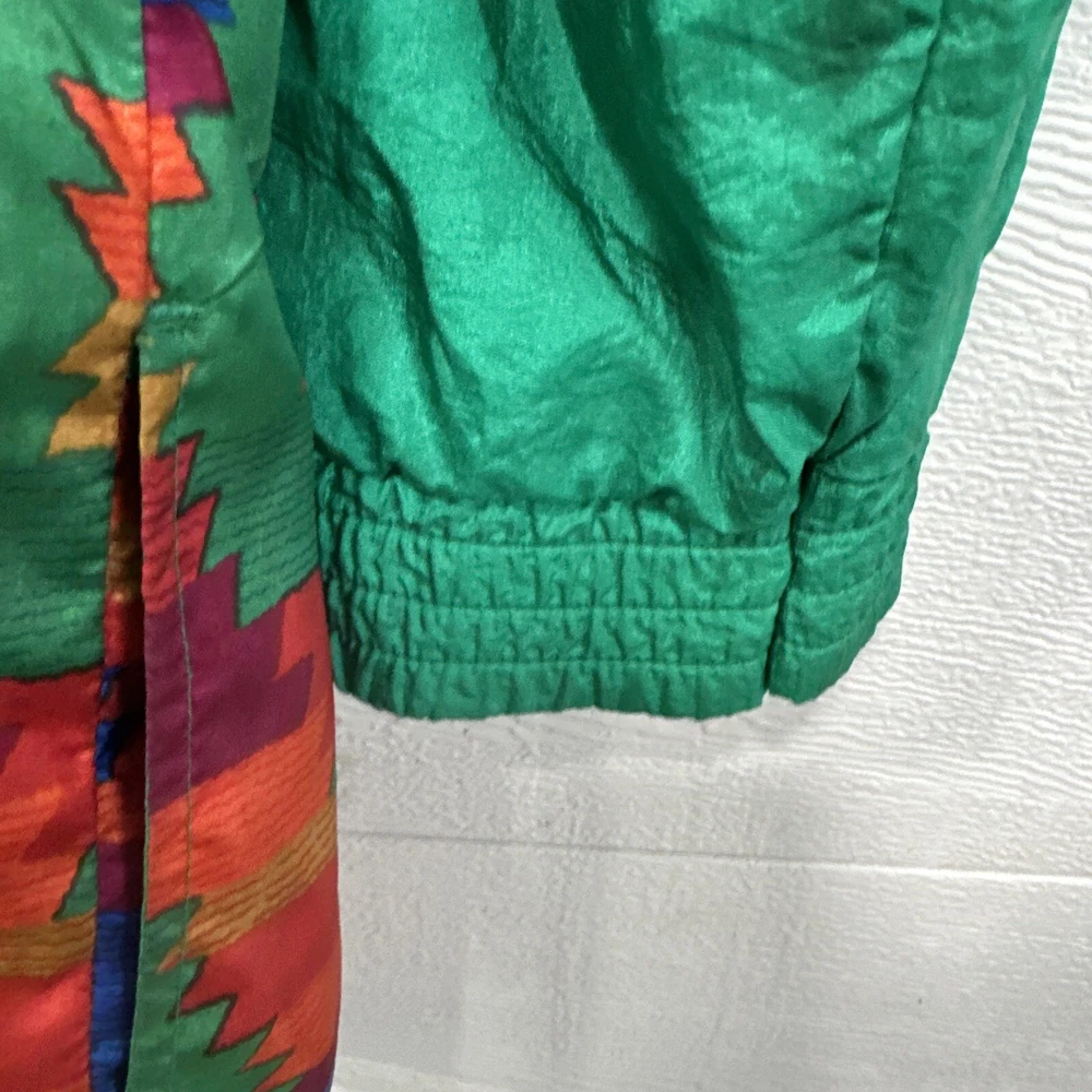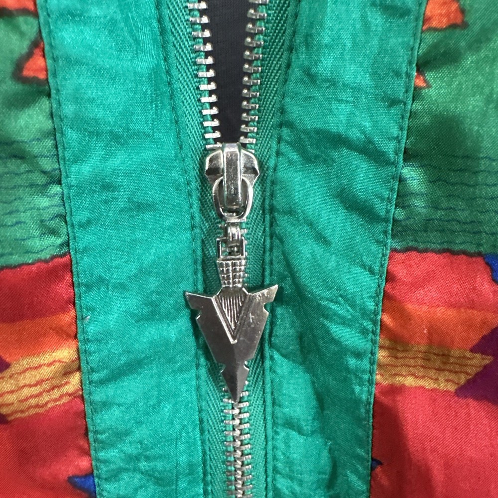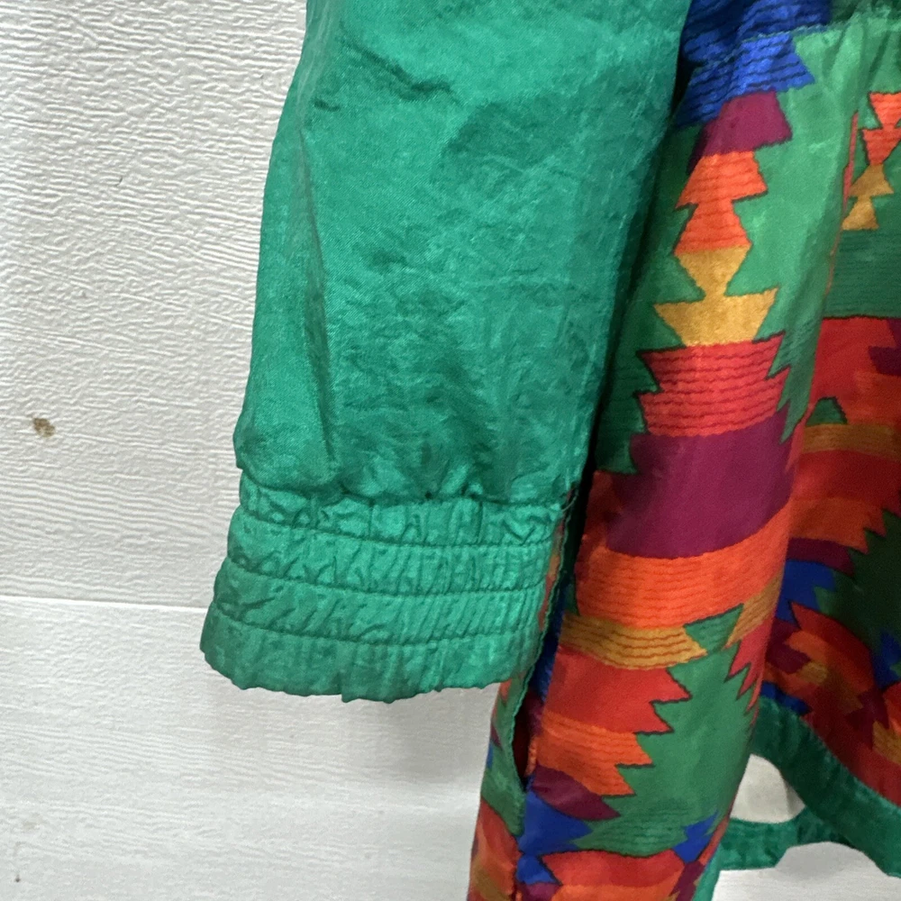 Great looking wind breaker with vibrant colors. This has no know defects and the zipper works great Full length is 33inches Sleeve length from under arm is 18.5 Width at under arm is 25...