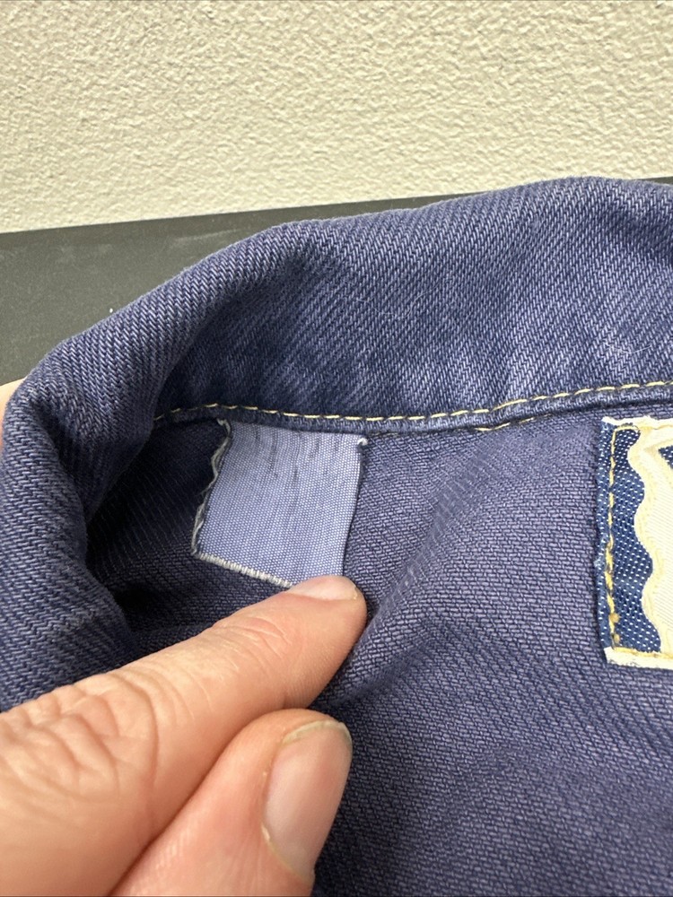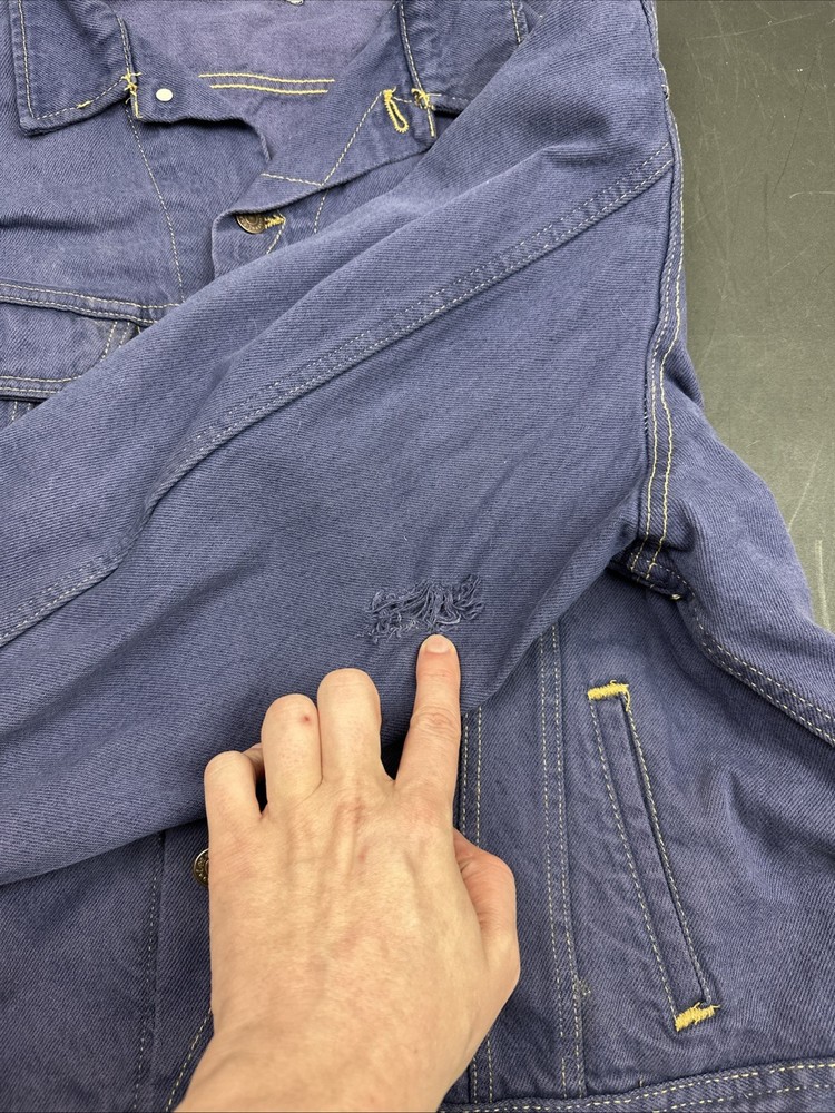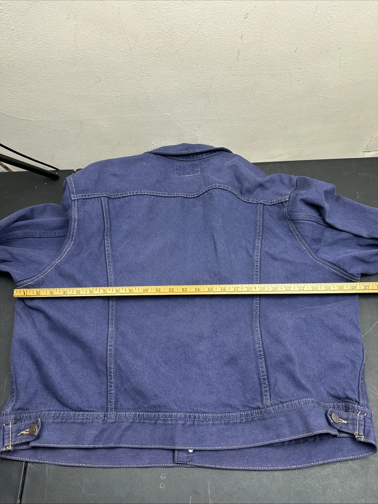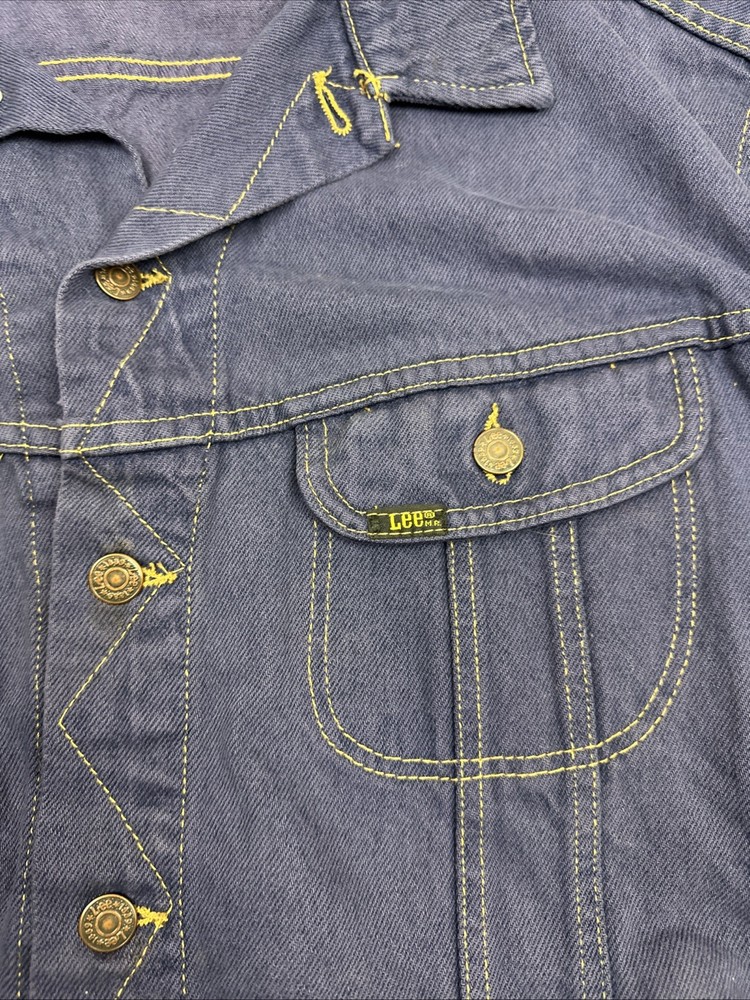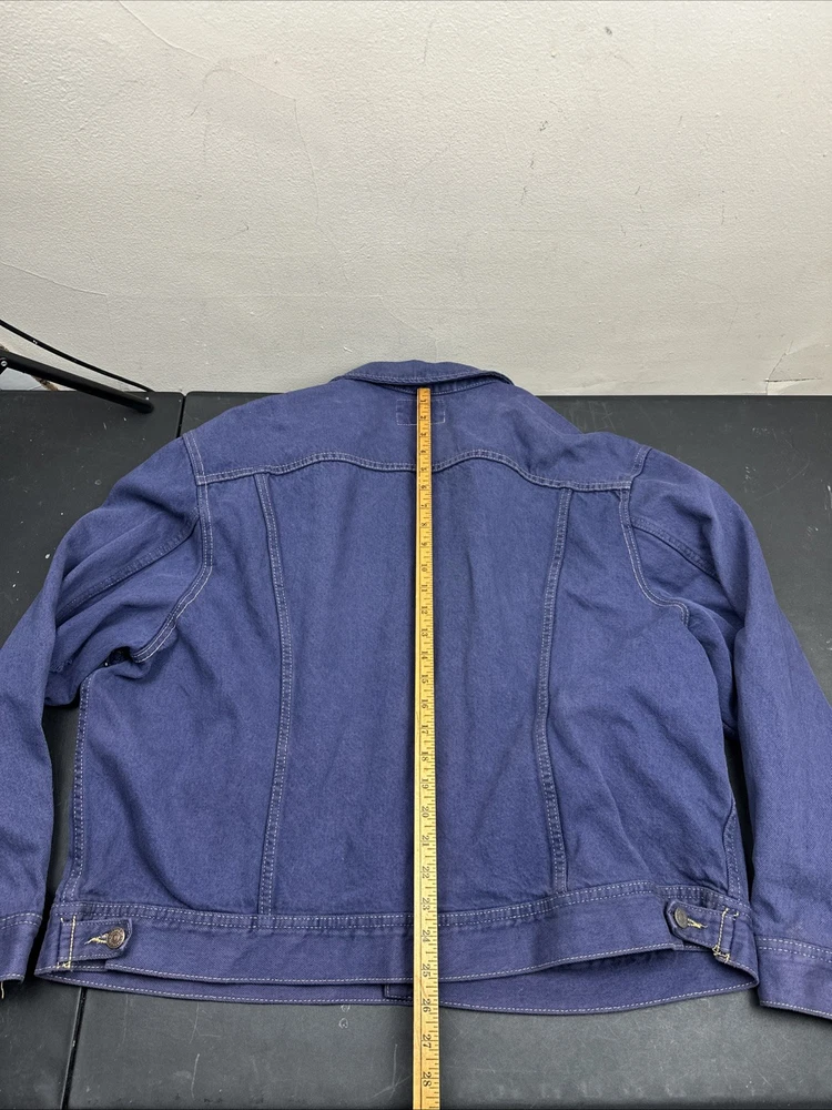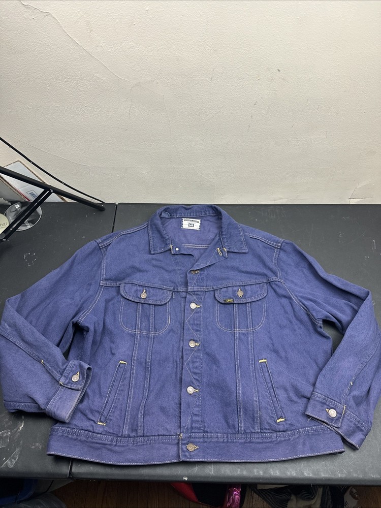 MISSING SIZE TAG SEE pictures for measurements For all the vintage lovers out there, we present a stunning Lee Jean Jacket in a beautiful shade of blue. This classic piece is a size XL and has a button-down closure with a button collar style. The jacket is a mid-length biker style that is perfect for all seasons, including winter, summer, fall, and spring. This denim jacket has a unique retro touch with a punk, colorful, and grunge design. It has a Western, cowboy, and biker theme with a classic fit and feel. The jacket has several features, including being lightweight, wind-resistant, and having bodywarmer and all-season capabilities. It also comes with pockets and is organic and handmade.
