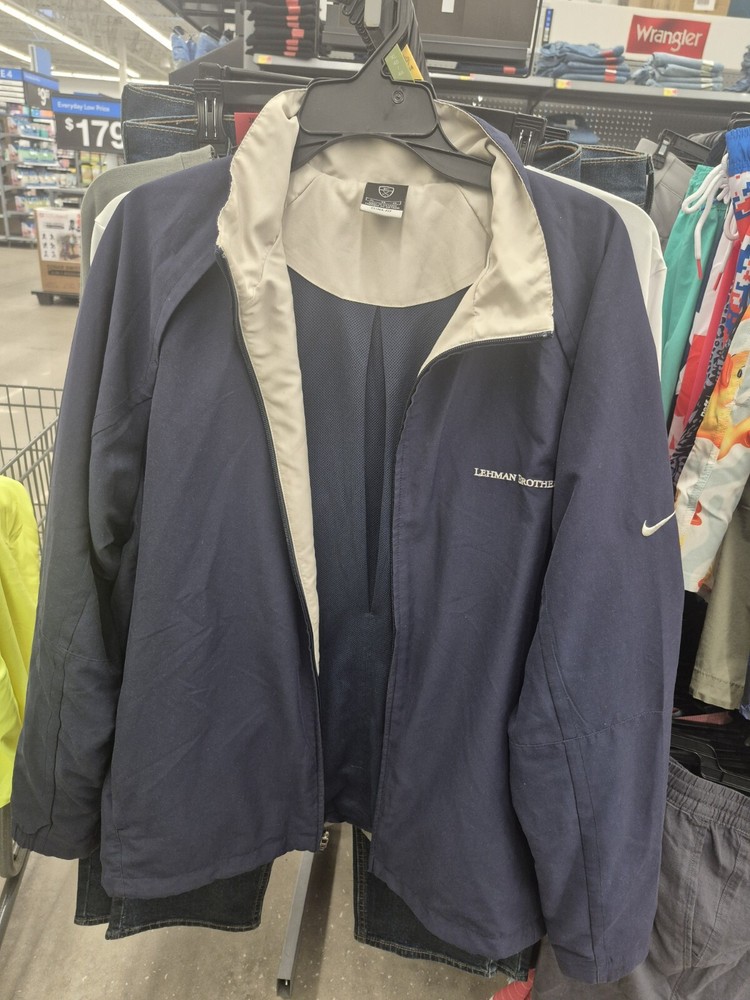 This vintage Lehman Brothers branded Nike men's windcheater golf jacket is a must-have for any fan of the venerable investment bank Lehman Brothers or of Golf. I was a client and received this for participating in one of Lehman's Golf Outings. I have worn it occassionally while playing. Made of lightweight nylon material, it features a full frontal zippee, collared style, and multiple pockets for convenience. The jacket is water-resistant and wind-resistant, making it perfect for all seasons. In addition to its practical features, this XL-sized jacket also boasts a stylish blue color and the brand's logo on the chest. Whether you're playing golf or just running errands, this jacket is a versatile addition to your wardrobe.