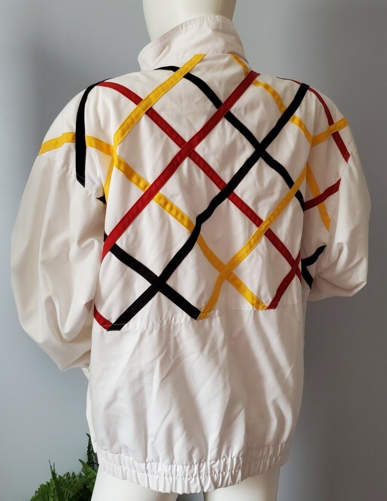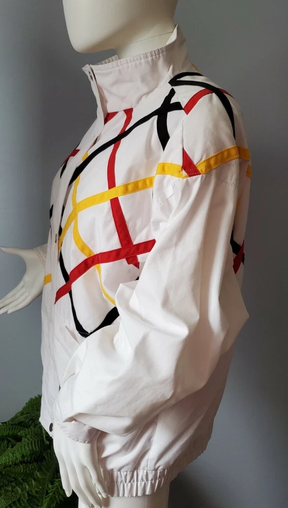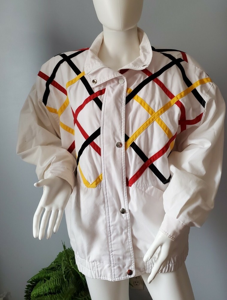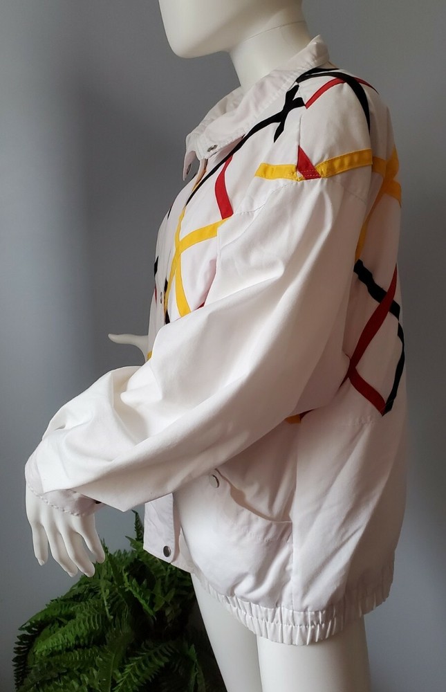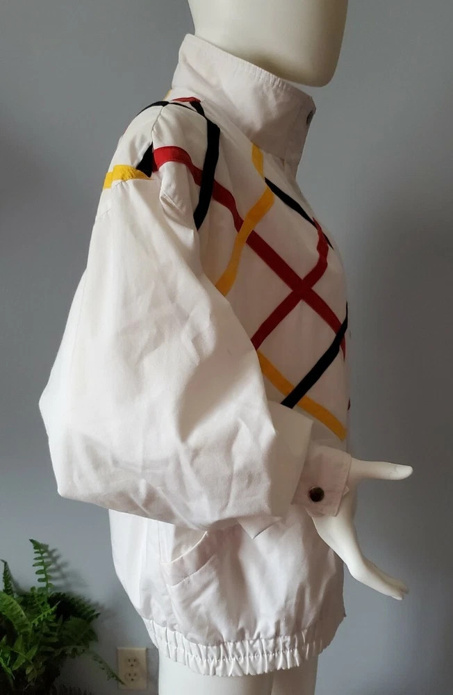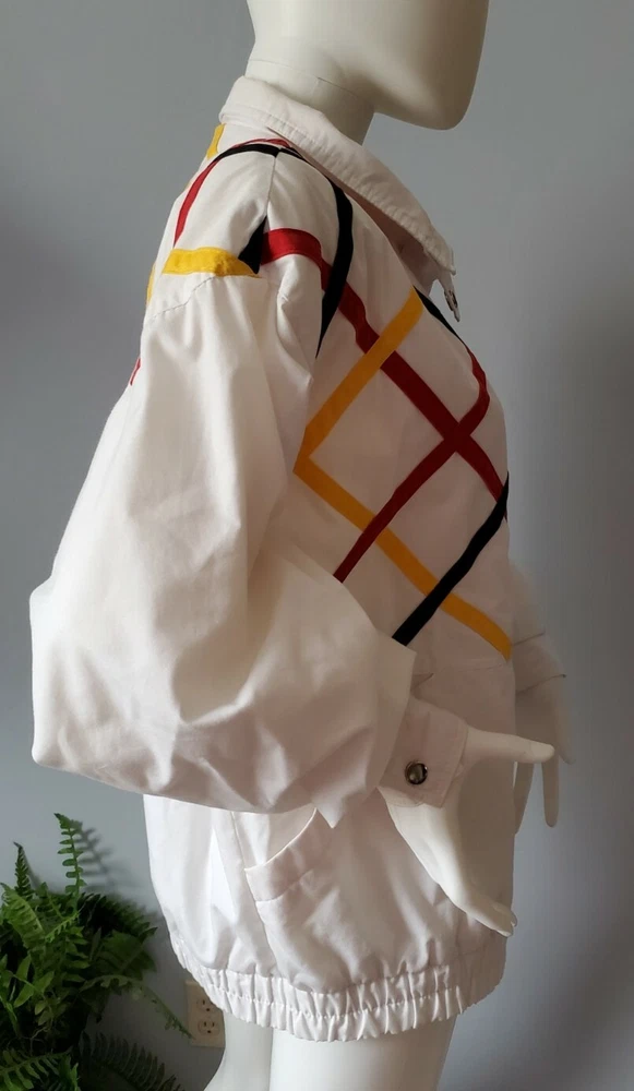 Vintage London Fog White W/ Red, Yellow & Black Stripes Rain Wind Jacket in good condition with no holes, rips or tears! Comes from a smoke free environment! Size: Medium Approx. Measurement: 23" across chest and 26" length Thanks for Looking!