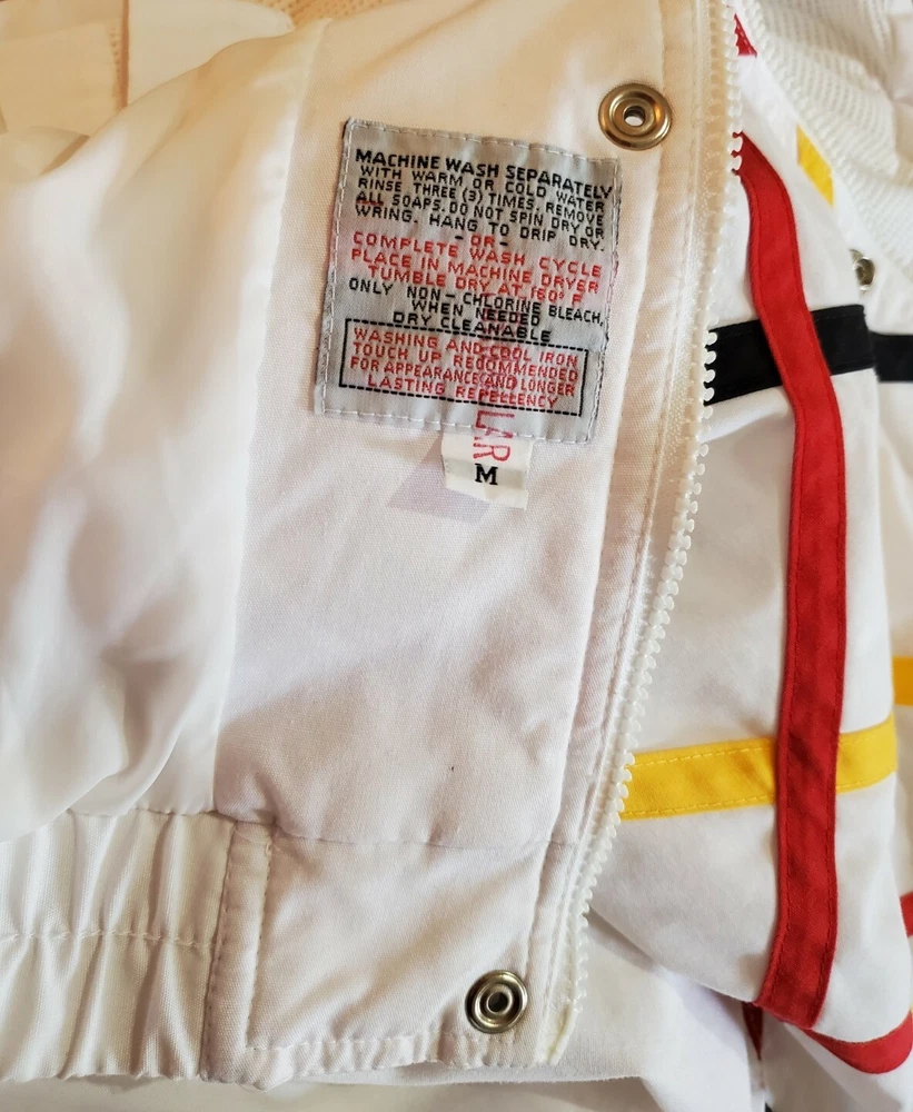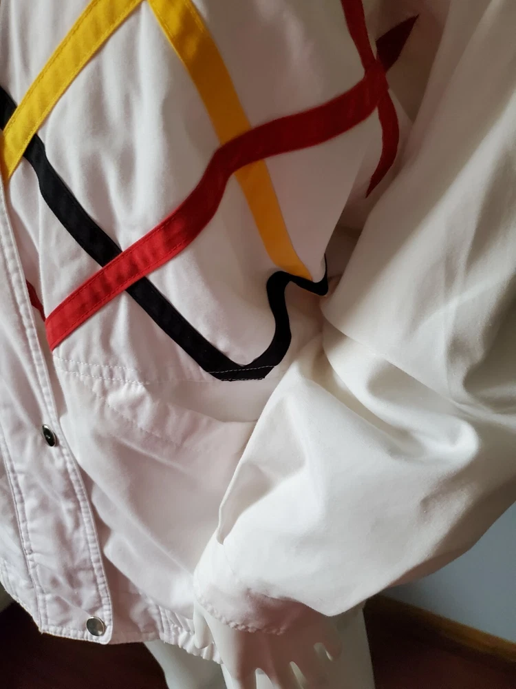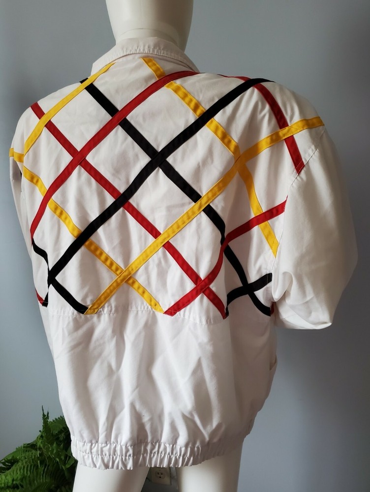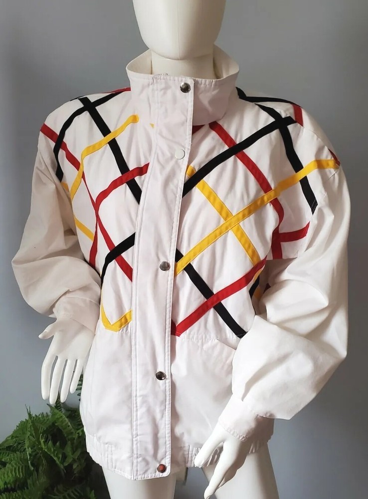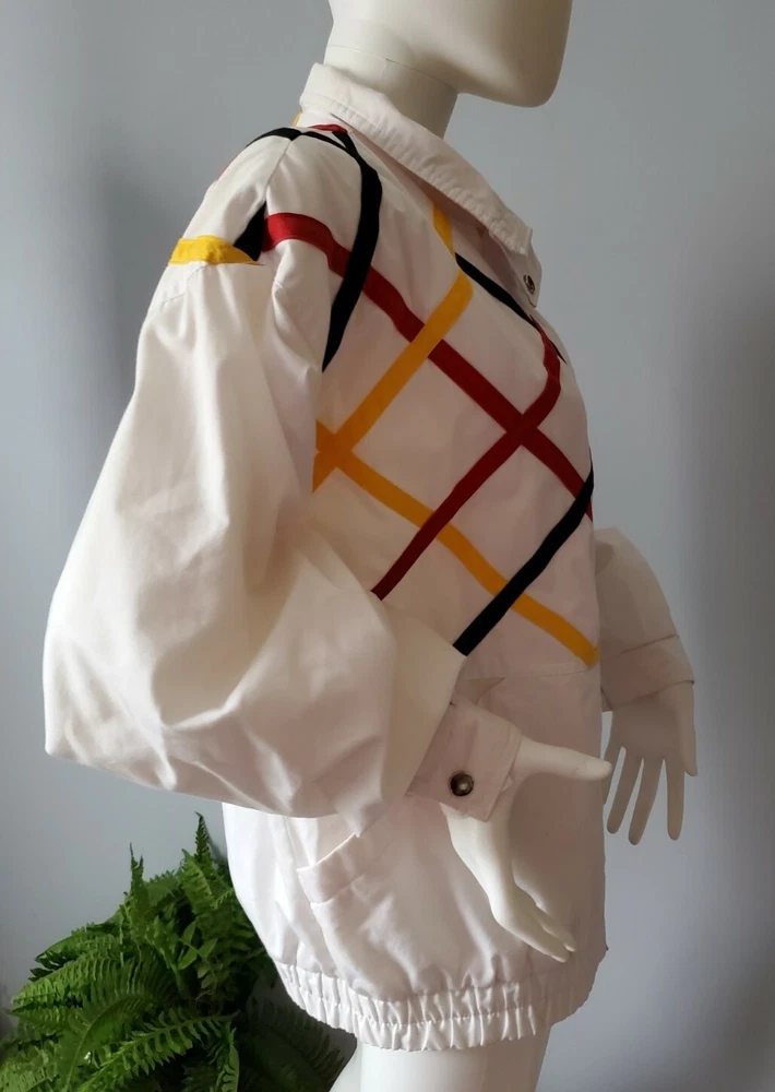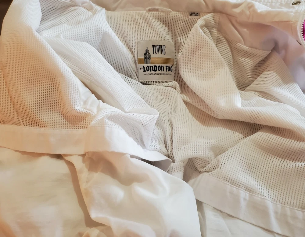 Vintage London Fog White W/ Red, Yellow & Black Stripes Rain Wind Jacket in good condition with no holes, rips or tears! Comes from a smoke free environment! Size: Medium Approx. Measurement: 23" across chest and 26" length Thanks for Looking!