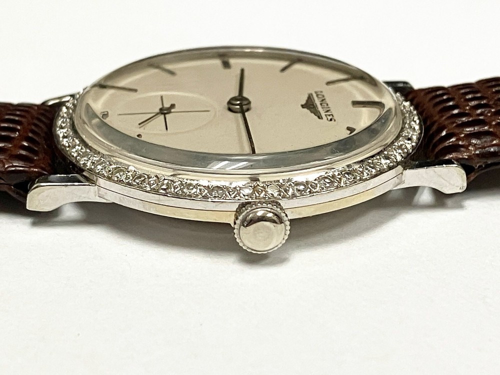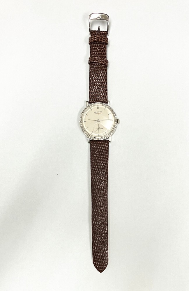 Longines wind up manual watch with diamond bezel. Keeps time. Very lovely and elegant. Brand new leather band. If you would like a different color, just let me know.