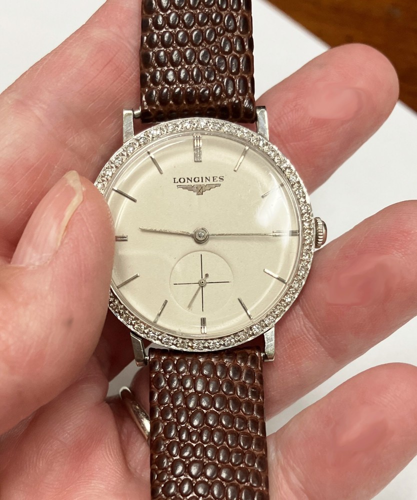 Longines wind up manual watch with diamond bezel. Keeps time. Very lovely and elegant. Brand new leather band. If you would like a different color, just let me know....