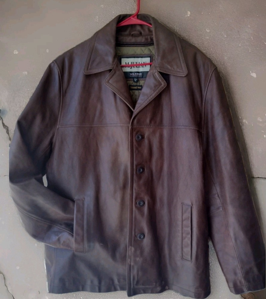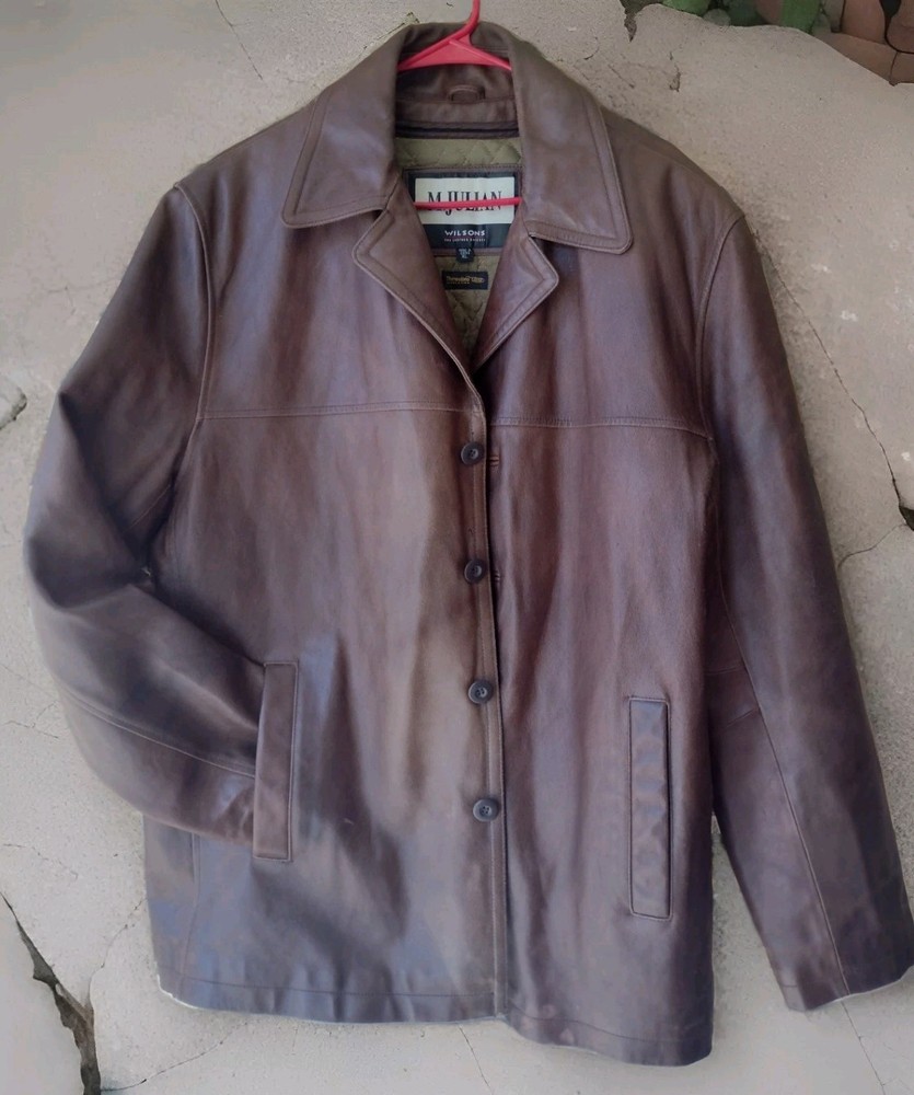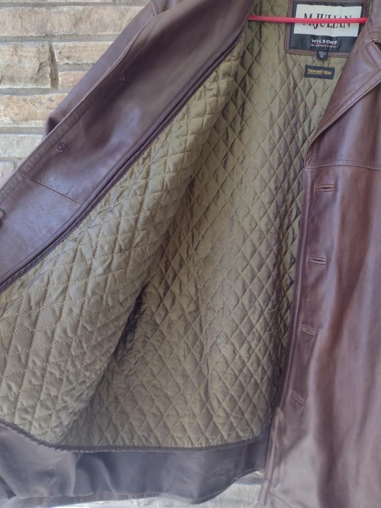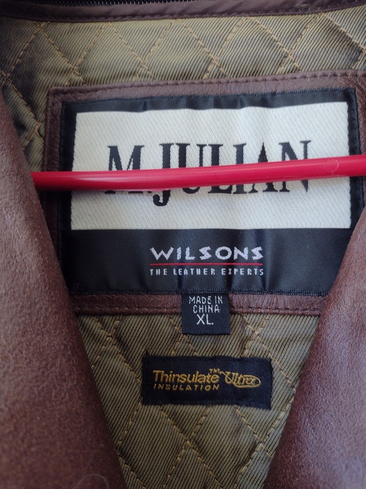 Vintage M. Julian Wilsons Leather Jacket in brown features a zip-out nylon quilted lining, pockets, and a collared neckline with a spread collar style. The jacket is made of leather with a solid pattern and has a hip-length jacket/coat length. It is accented with buttons and has a regular fit. The jacket is thermal, wind-resistant, and has features for all seasons, making it suitable for winter, fall, and spring. The chest size is 46 inches, the sleeve length is 26 in shoulder to shoulder measures 20 in, the overall length is 32 in and it is a size XL. This jacket is in excellent condition. The lining and the structure of the leather are both excellent. There are some wear and distress Marks here and there as shown in the photos. Please see photos for condition details.
