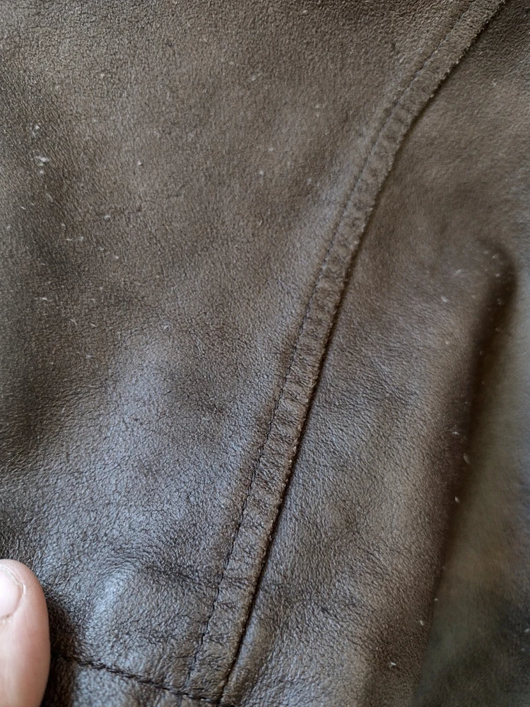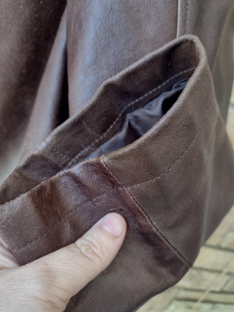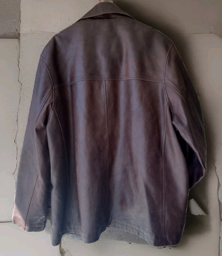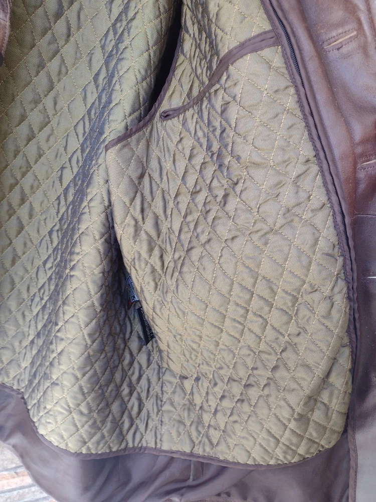 Vintage M. Julian Wilsons Leather Jacket in brown features a zip-out nylon quilted lining, pockets, and a collared neckline with a spread collar style. The jacket is made of leather with a solid pattern and has a hip-length jacket/coat length. It is accented with buttons and has a regular fit. The jacket is thermal, wind-resistant, and has features for all seasons, making it suitable for winter, fall, and spring. The chest size is 46 inches, the sleeve length is 26 in shoulder to shoulder measures 20 in, the overall length is 32 in and it is a size XL. This jacket is in excellent condition. The lining and the structure of the leather are both excellent. There are some wear and distress Marks here and there as shown in the photos. Please see photos for condition details.
