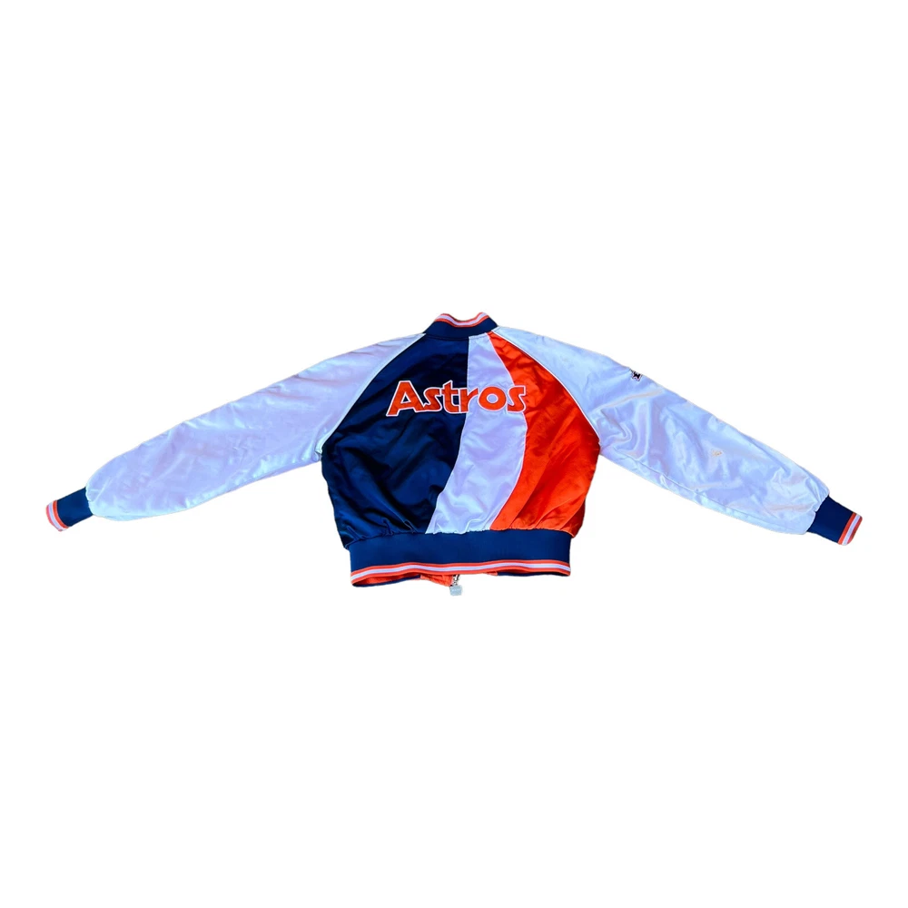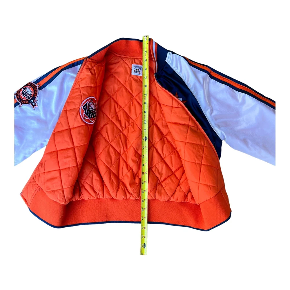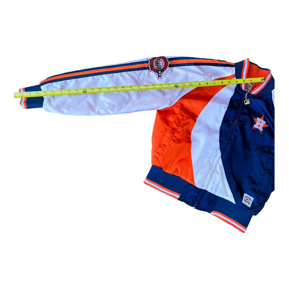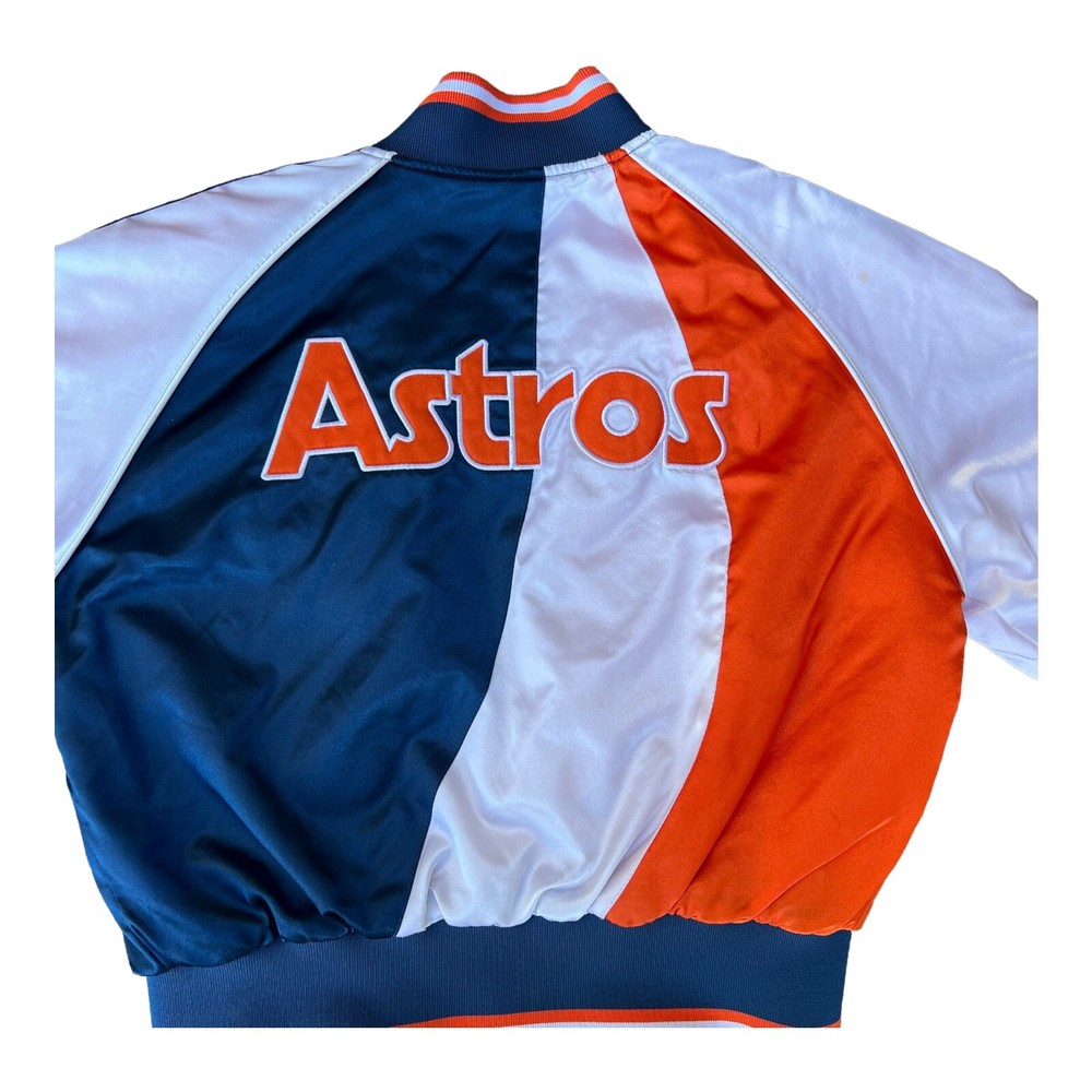 Vintage MLB Baseball Houston Astros Astrodome Reversible Bomber Wind Jacket 1986. This jacket is reversible! Classic retro astros colors on one side. There is some discoloration here and there on the jacket. The white is not true white anymore (more like white tan brown). The reverse side is Astro orange with a circle patch on it. Zipper closure that is still smooth. I can’t find any fabric tears or snags. The patches are curling up on the very tips a little (nothing extreme just the very tips) See pictures