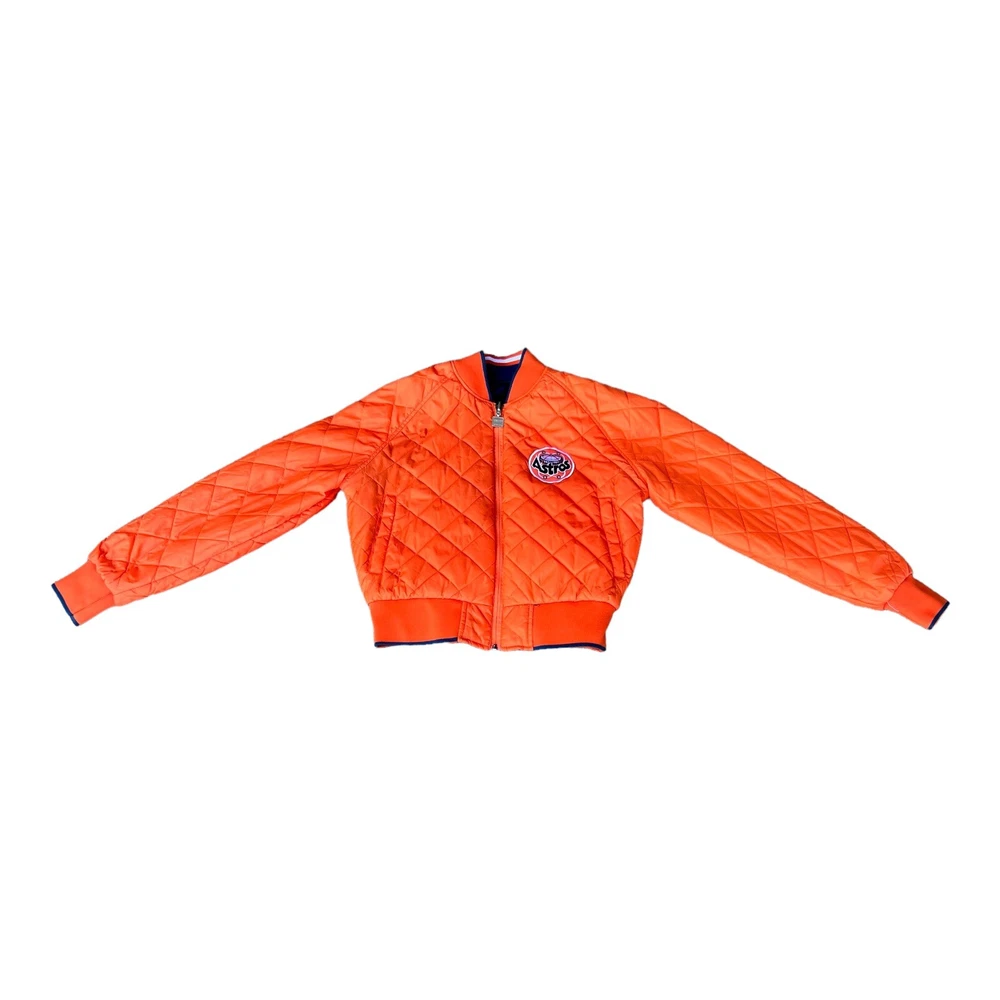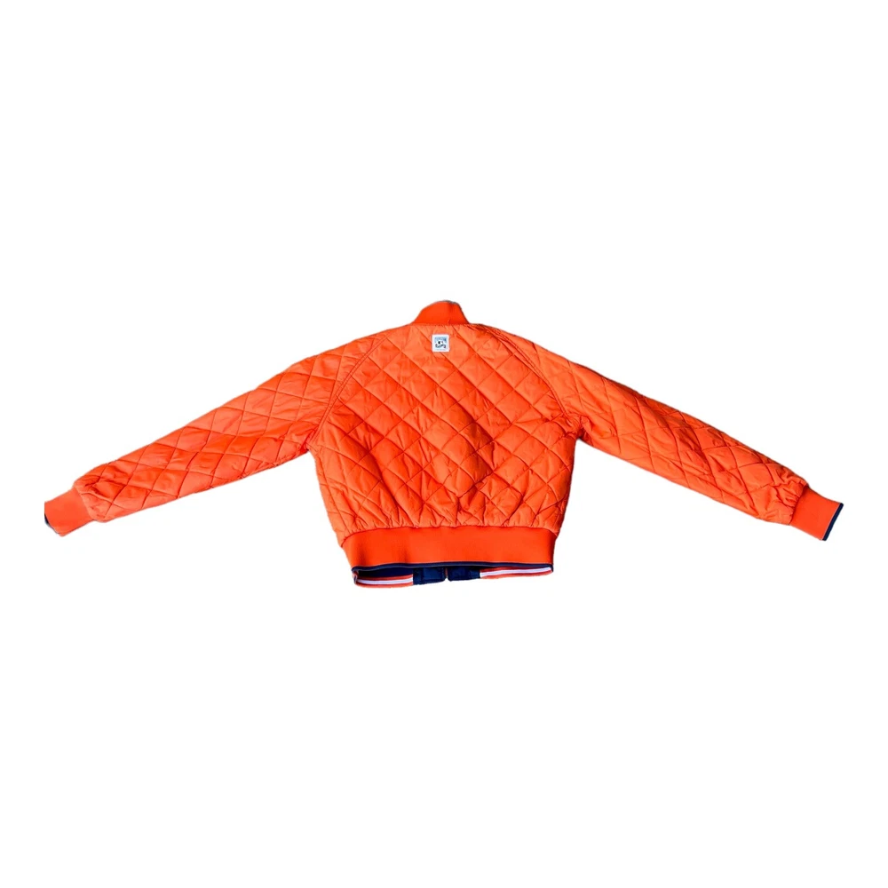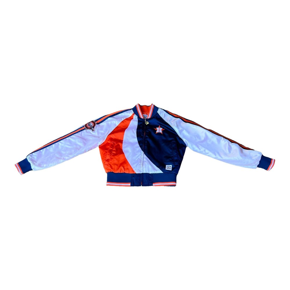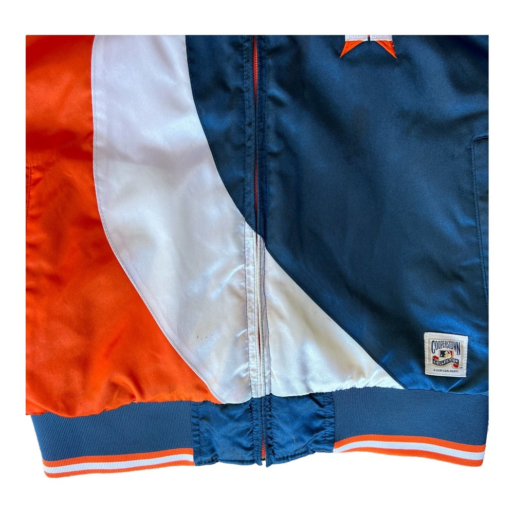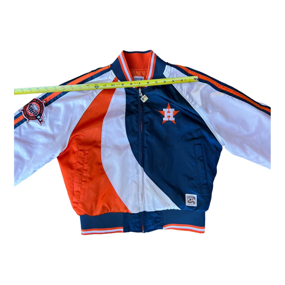 Vintage MLB Baseball Houston Astros Astrodome Reversible Bomber Wind Jacket 1986. This jacket is reversible! Classic retro astros colors on one side. There is some discoloration here and there on the jacket. The white is not true white anymore (more like white tan brown). The reverse side is Astro orange with a circle patch on it. Zipper closure that is still smooth. I can’t find any fabric tears or snags. The patches are curling up on the very tips a little (nothing extreme just the very tips) See pictures