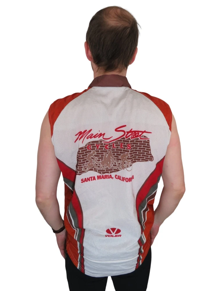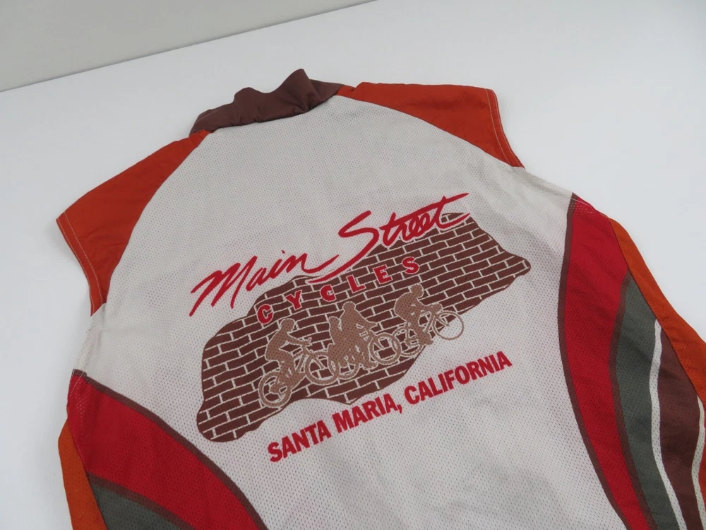 Stunning main street cycles wind shelled vest sleeveless bike jersey. As summer approaches its time to grab some new jerseys to hit the road or trial. This jersey has tons of awesome features including silky comfy polyester, full zip front, and wind water resistant shell. Show this off on race day or your next group ride to turn heads. Comes professionally washed, ready to wear and ships within 24 hours! Model is 5' 8" 140 pounds medium build and the jersey fits a little big on model. Measurements: Tagged large, confirm fit below Pit to pit across 21.5 inches Top to bottom in front 24 inches Top to bottom in back 28 inches Excellent condition with no rips, holes or stains. Please check out my store & continue shopping!