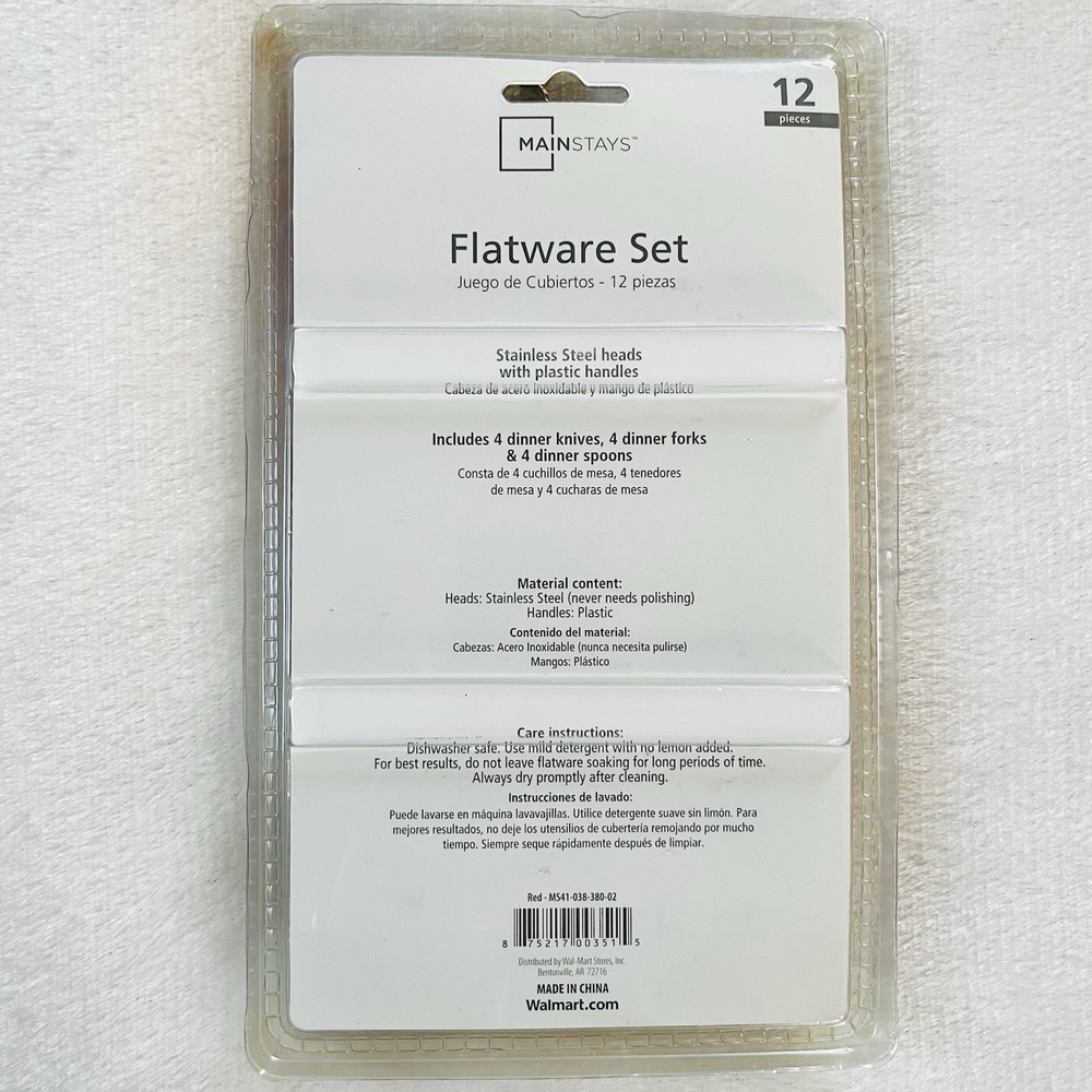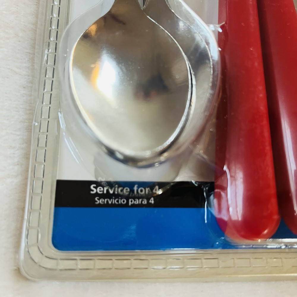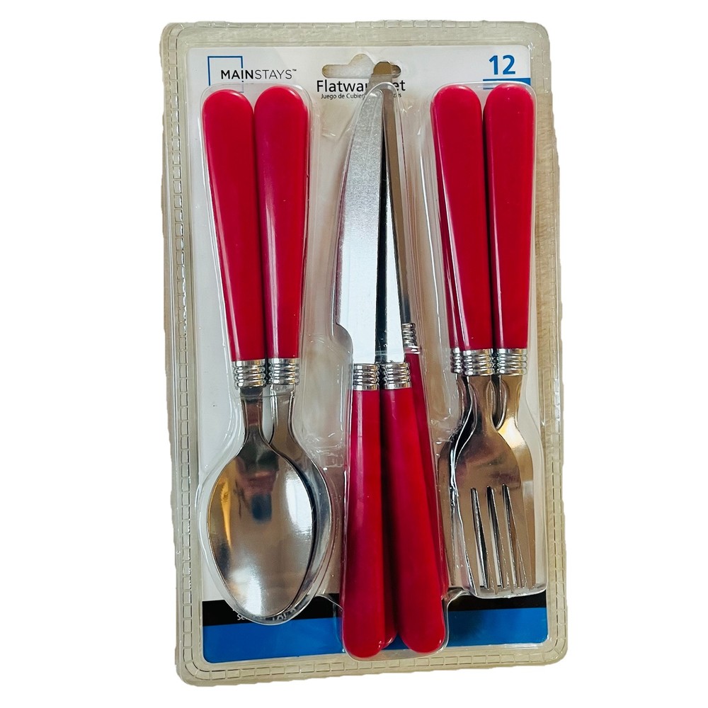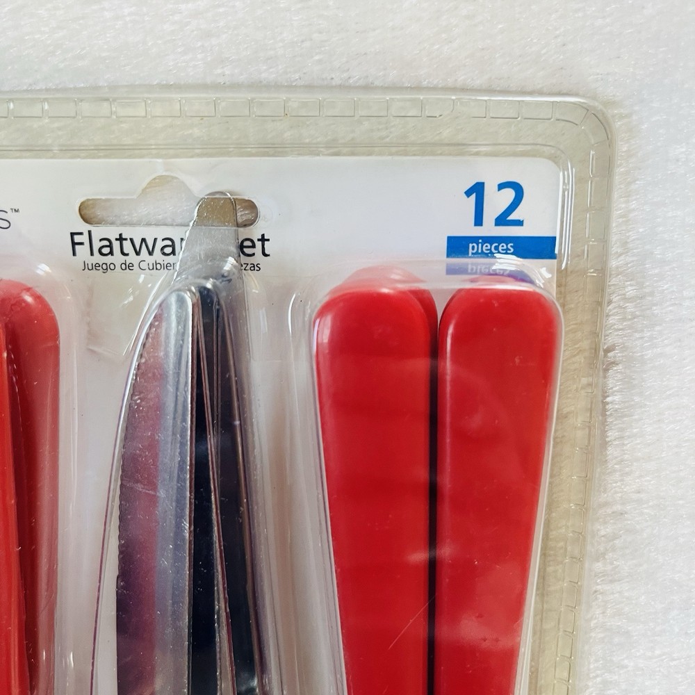 Vintage Mainstays 12 Piece Stainless Steel Red Handle Plastic Flatware Set New in unopened packaging. The packaging is old and has some yellowing. Great for mid-century modern vibe, camping, picnic.