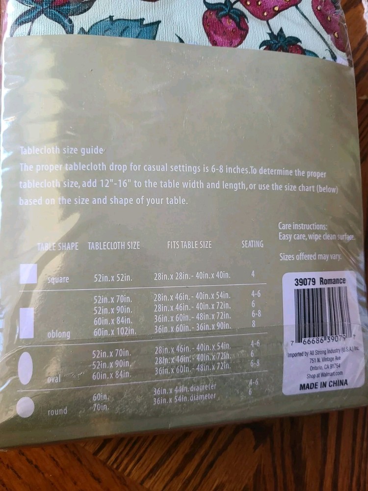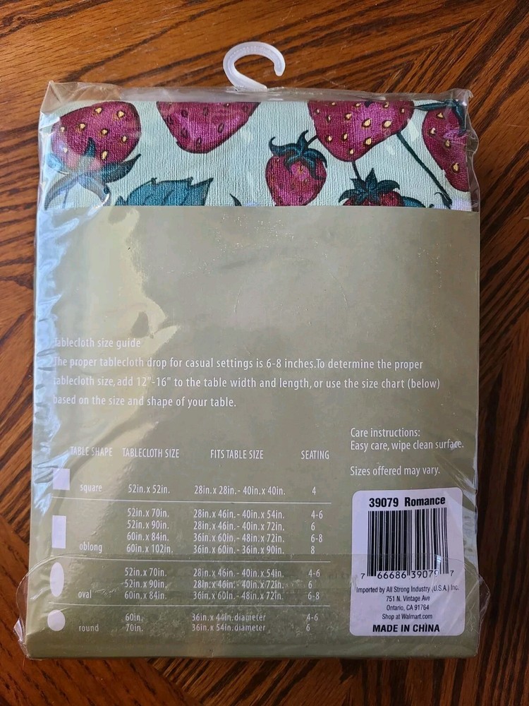 This vintage vinyl tablecloth features strawberries and blooms and a green background. It measure 60 inches by 84 inches. Brand new in the package!