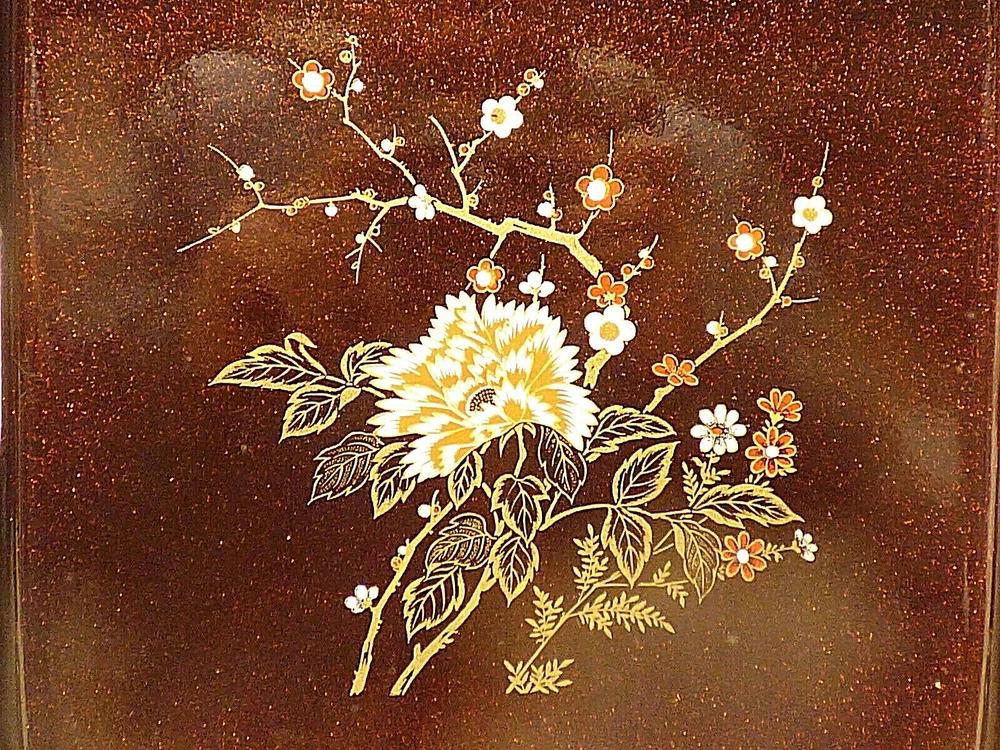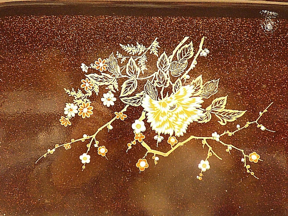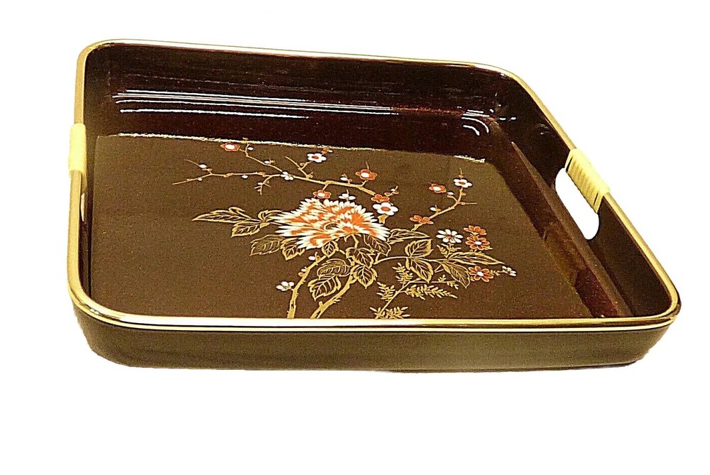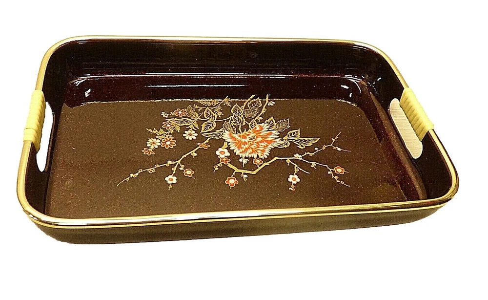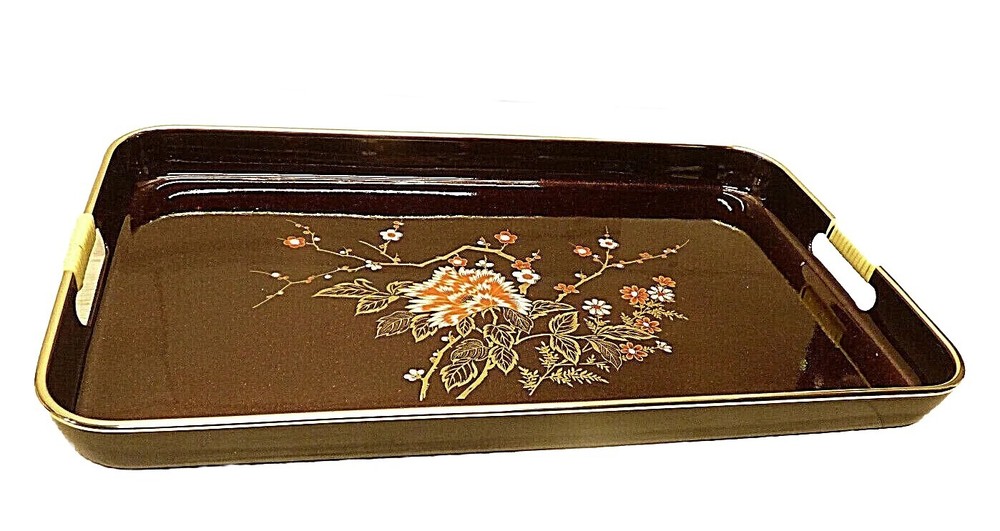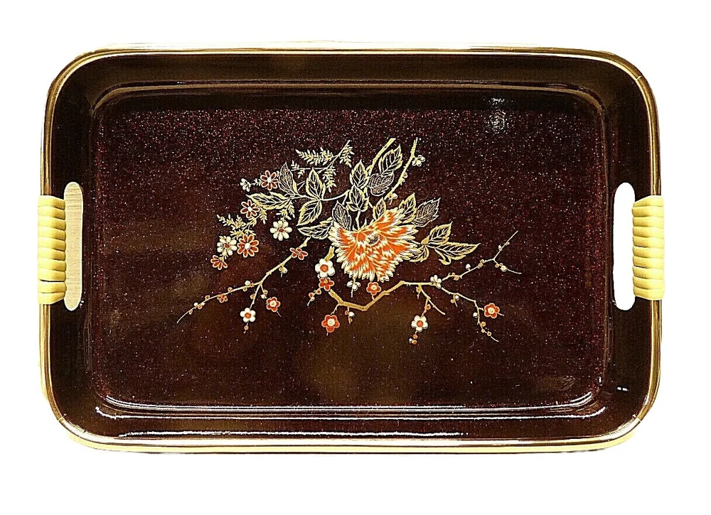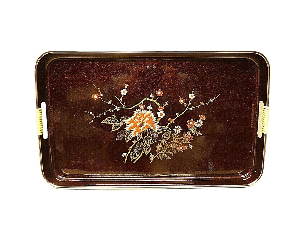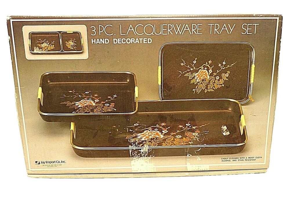 Vintage Black Floral Lacquerware Tray Set 3-Piece Mandarin Design NOS