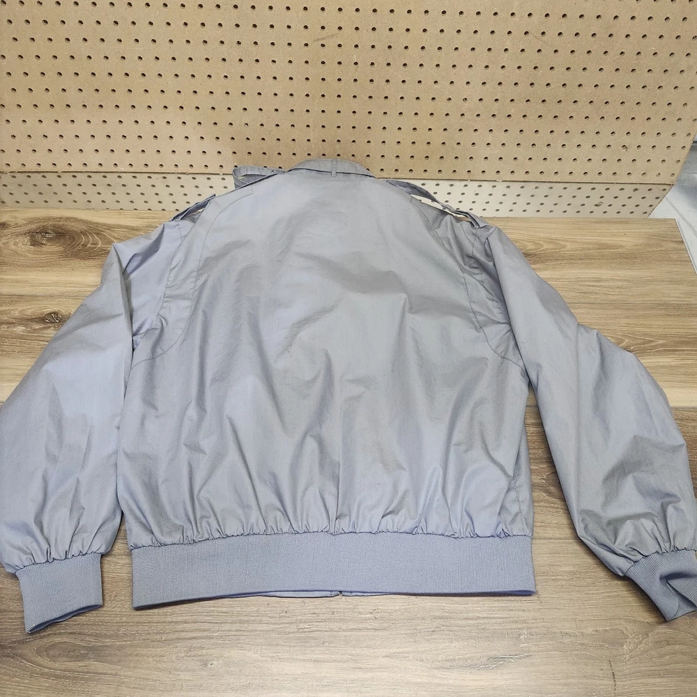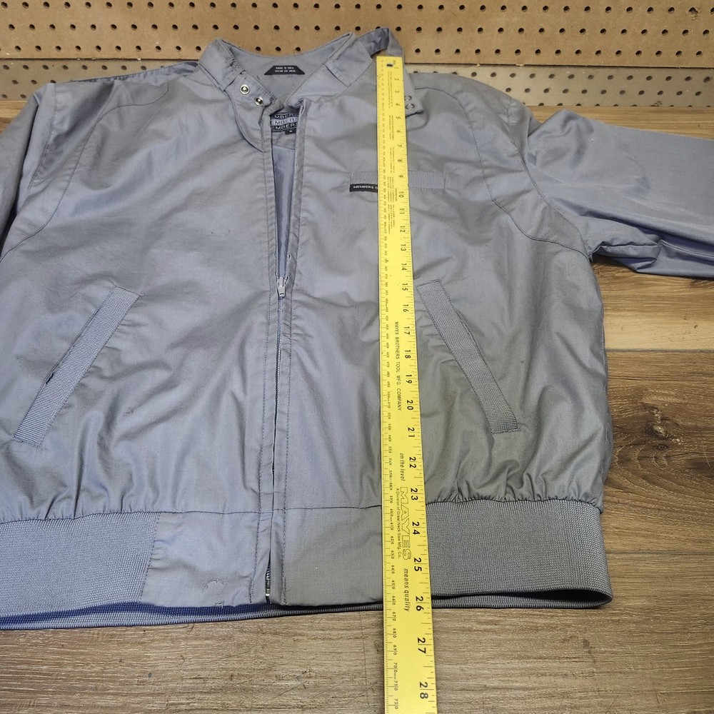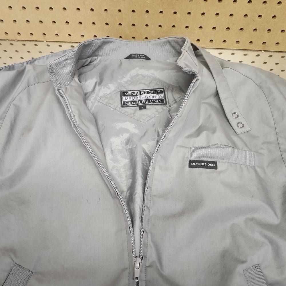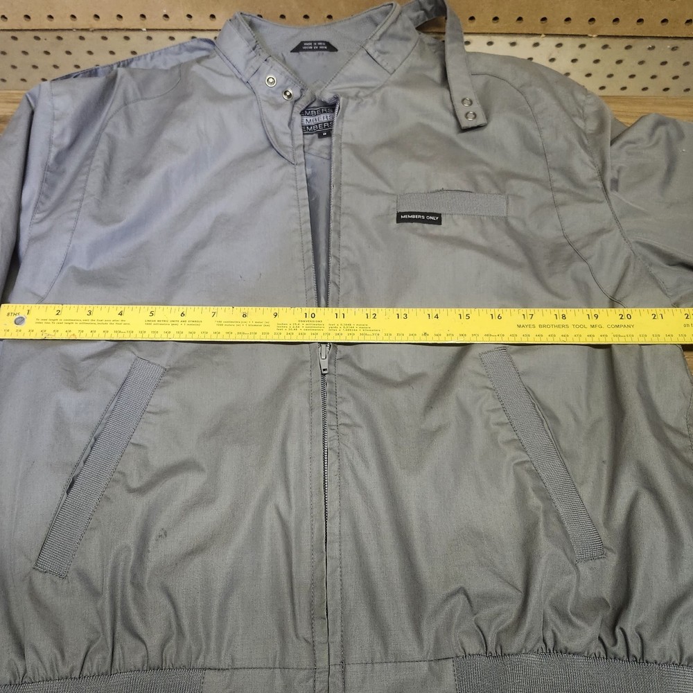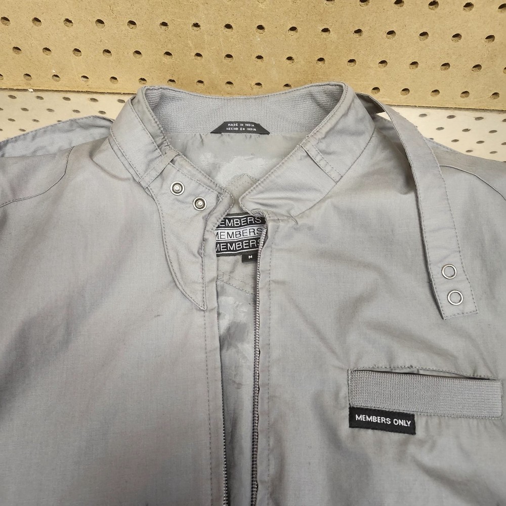 This vintage Members Only bomber jacket is a must-have for any 80s fan. The classic gray color and solid pattern make it a versatile addition to any wardrobe. The jacket features a microfiber outer shell and polyester lining, making it wind-resistant and suitable for all seasons. The jacket has a short length and elastic waist with knit cuffs, accented with the Members Only logo. It has a zip and snap closure and a band collar style. The jacket is perfect for travel, party/cocktail, casual, or business occasions. This Members Only Racer Jacket is a classic fit and is available in size M.