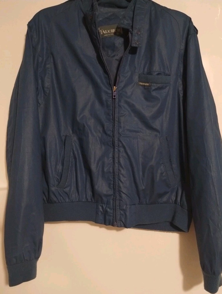 This is a vintage members only polyester mid-length bomber style jacket with a regular fit, suitable for various occasions like travel, casual wear, and work. The jacket features a zip closure, zipped pockets, and is wind-resistant. It is designed by the brand fauchon and has a classic designer theme, making it a versatile option for all seasons.