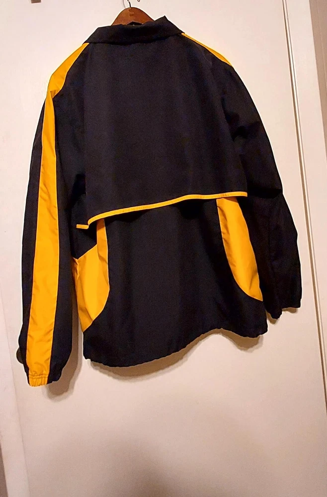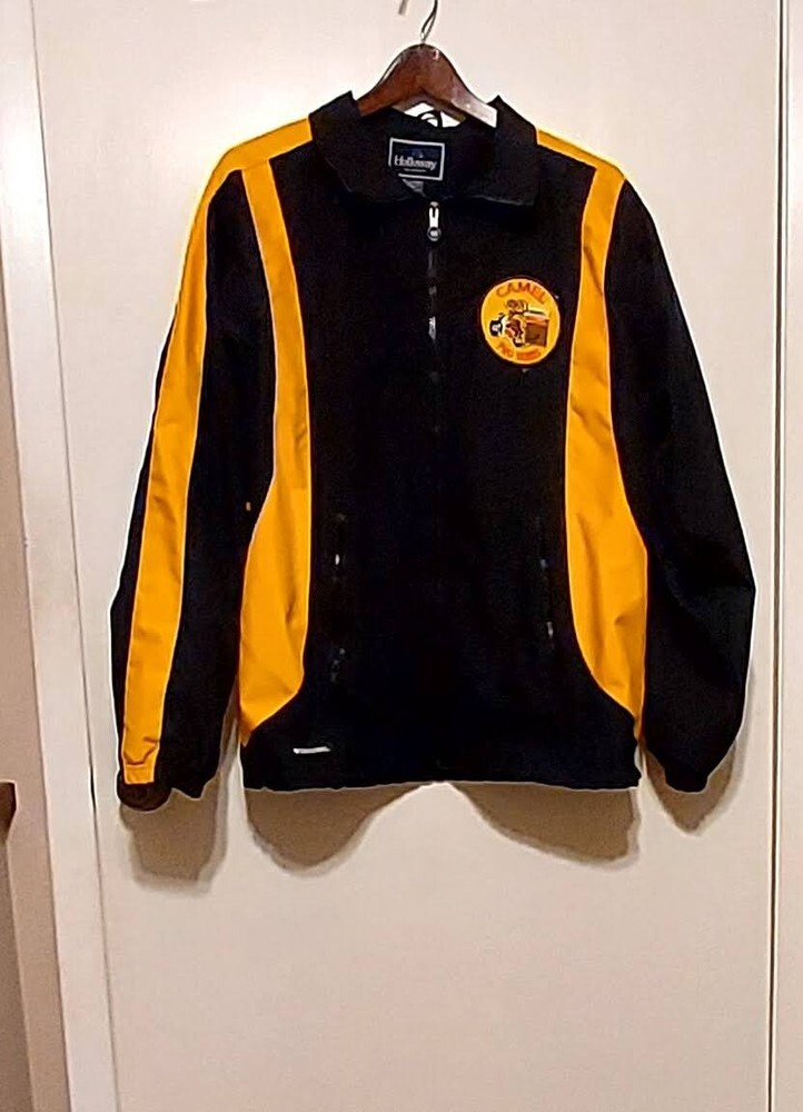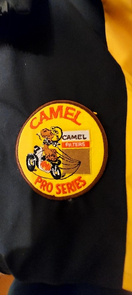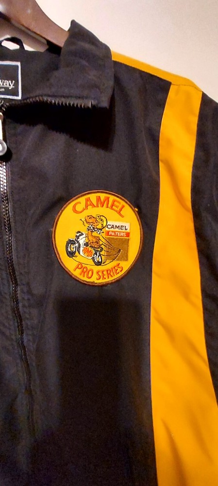 This is a very beauitful sharp, pro series Camel Logo full zip jacket. It is in great shape. It is lined with a polyester mesh. It has a cape like piece in the back. The logo is so cute it has a camel riding a motorcycle with the word AMA on it. Also the Logo says Camel Pro Series with a pack of Camel filters cig's. There is nothing wrong with the jacket no marks or rips. It is like new. Very different!