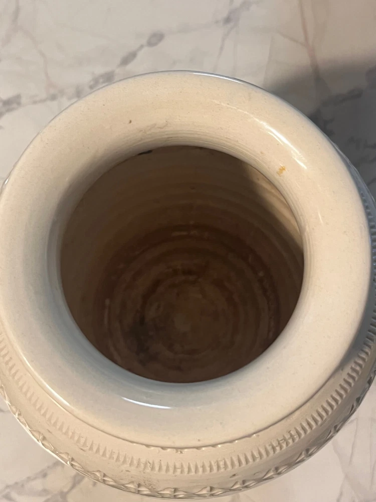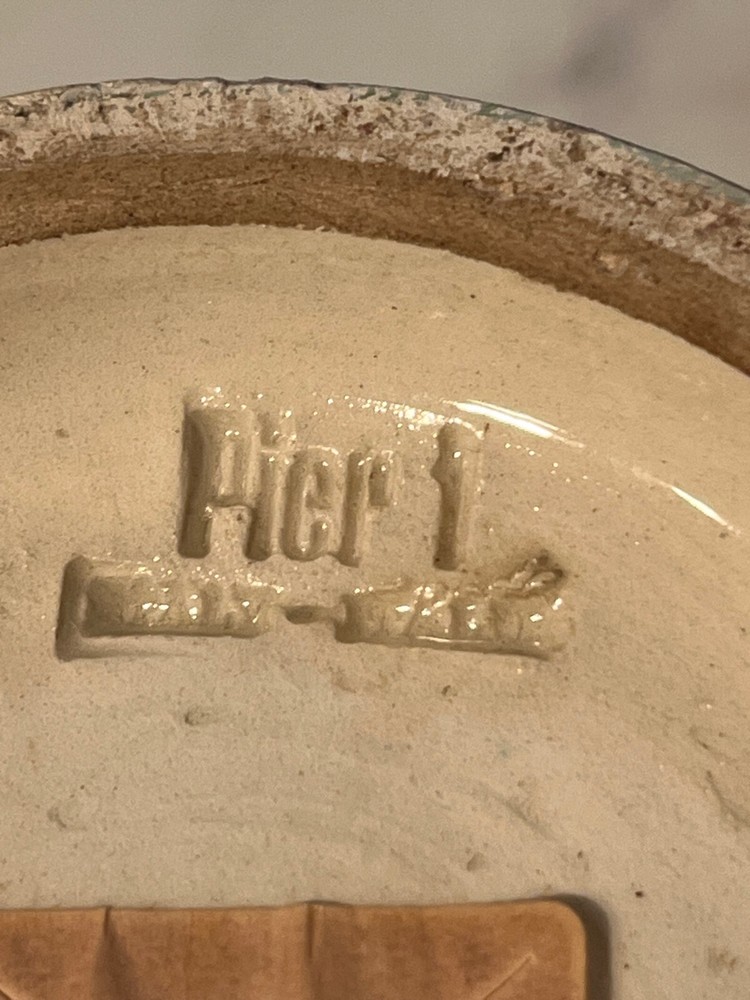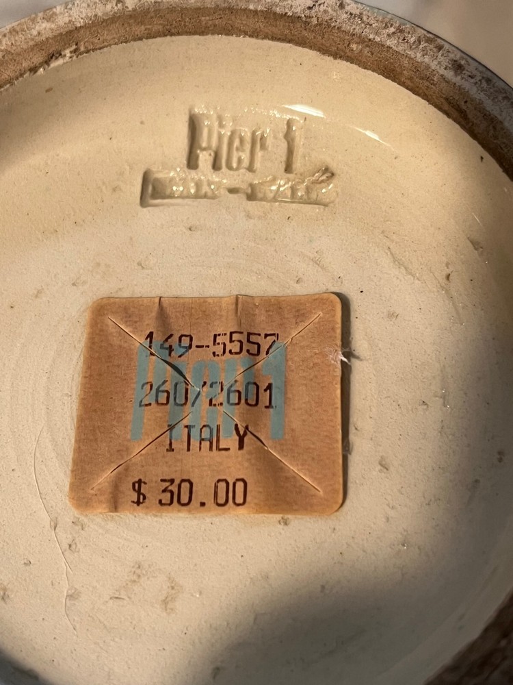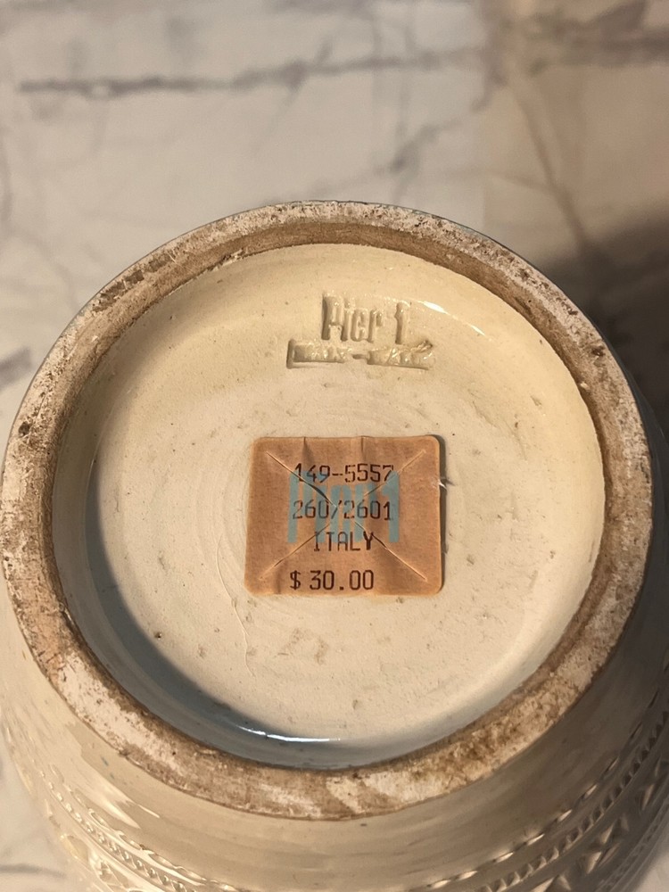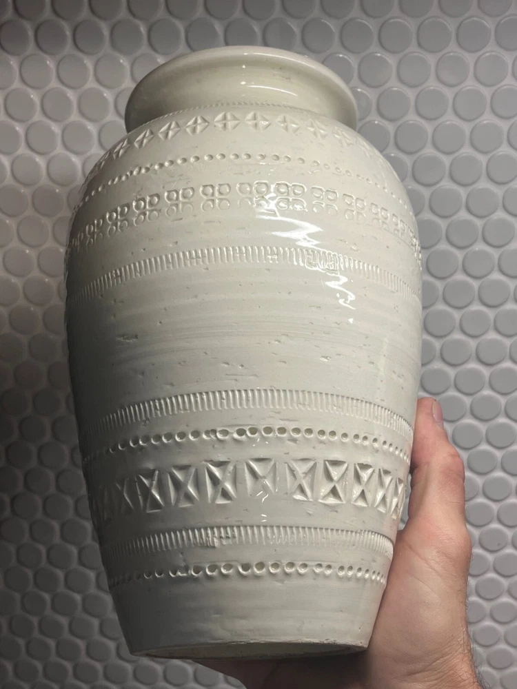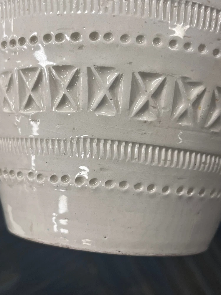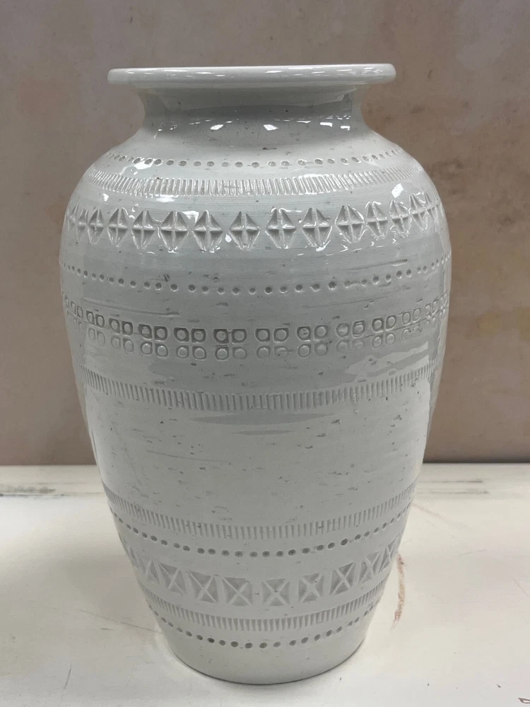 VINTAGE ITALIAN MID CENTURY MODERN CERAMIC VASE BITOSSI PIER ONE The featured item represents a made in Italy art pottery vase by Bitossi, designed by Aldo Londi and and retailed by Pier One Imports. The vase has a white/creamy finish and measures approximately 9 7/8" tall and 4 3/8" across the top. The exterior is decorated with stamped like bands with geometric elements. Original paper price tag on the bottom and impressed Pier 1 and Italy marks. The vase comes in overall good condition for its age with no major damages found but normal vintage wear like some scuffs, marks and scratches here and there as well as small production flaws and imperfections. The interior could use some cleaning. Please, take a look at all of the provided pictures as they are part of the description. SOLD "AS IS"