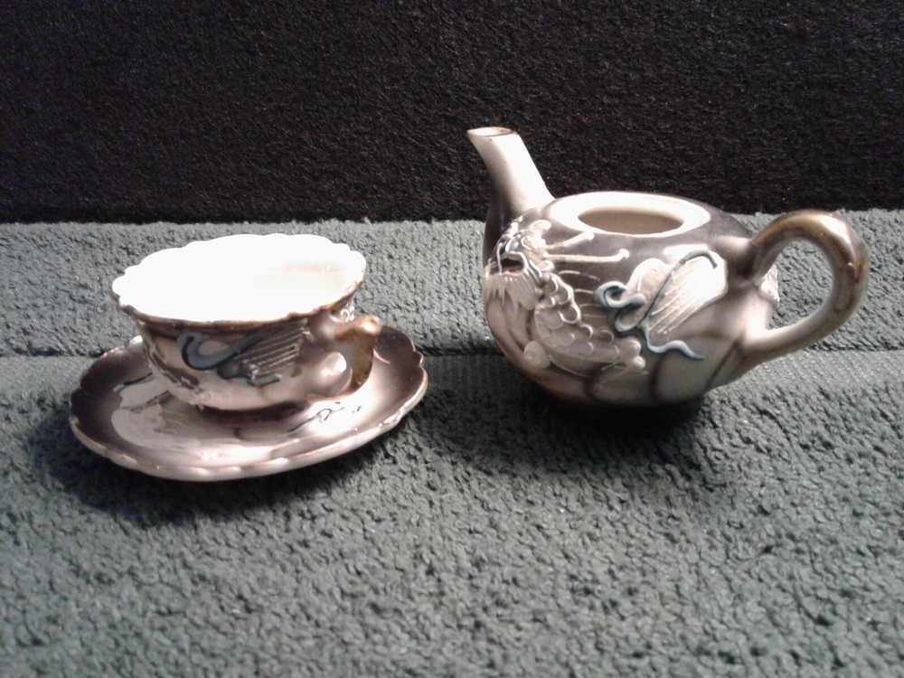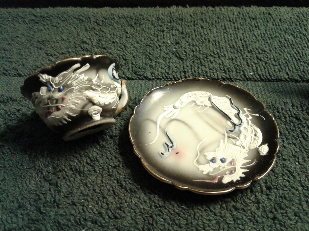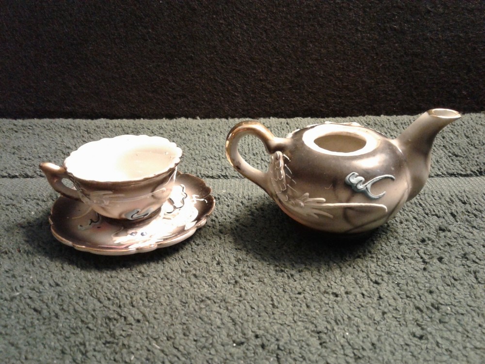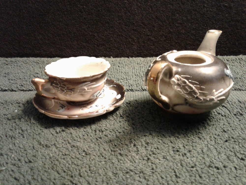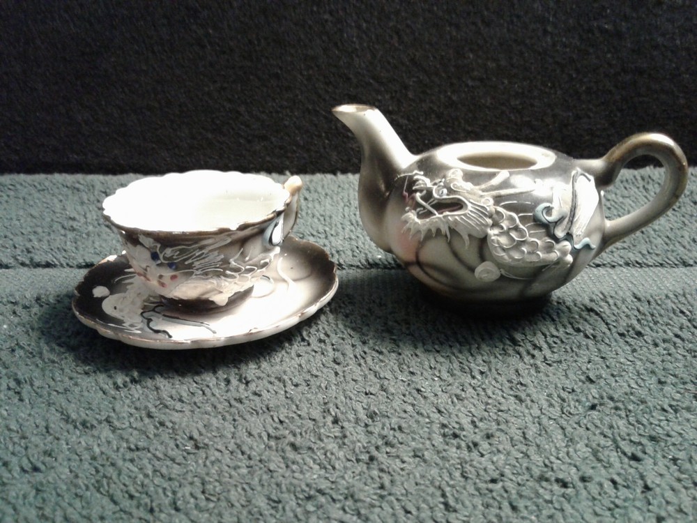 These are previously owned items. Vintage Dragon design 3 pcs of child's miniature tea set, including tea cup, saucer and tea pot with no lid. All three have paper label, Imports by ENESCO Japan. All pieces have no lines or damage. There are a few manufacturing paint flaws, including black spots in side of cup and also on saucer. There is a glaze flaw on outside edge of cup that was painted over in manufacturing (see picture). Gold around rims has worn spots on saucer, rim of cup and tea pot spout. Please look at pictures as they show more of the items discription. If you need more information please feel to e-mail me at least 2 days before end of the items listing. Return and Shipping Policy All items are sold "as is". Returns are accepted if item is not as described in the listing. Buyers must contact me within 3 days of receiving item. Items returned must be returned as shipped in original box with packaging. After 30 days all sales are final. I do not ship on Saturday or Sunday. No international shipping done. All items over $50.00 will be shipped with extra insurance coverage. All items over $200.00 will need a delivery signature. All eBay taxes are the responsibility of the buyer.