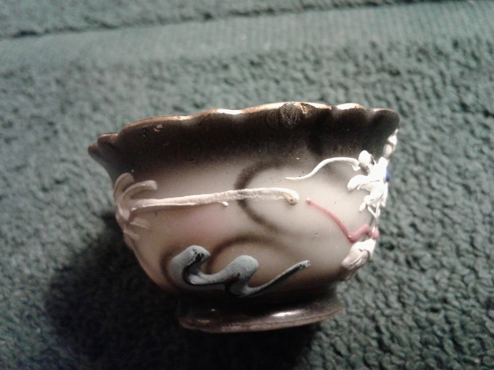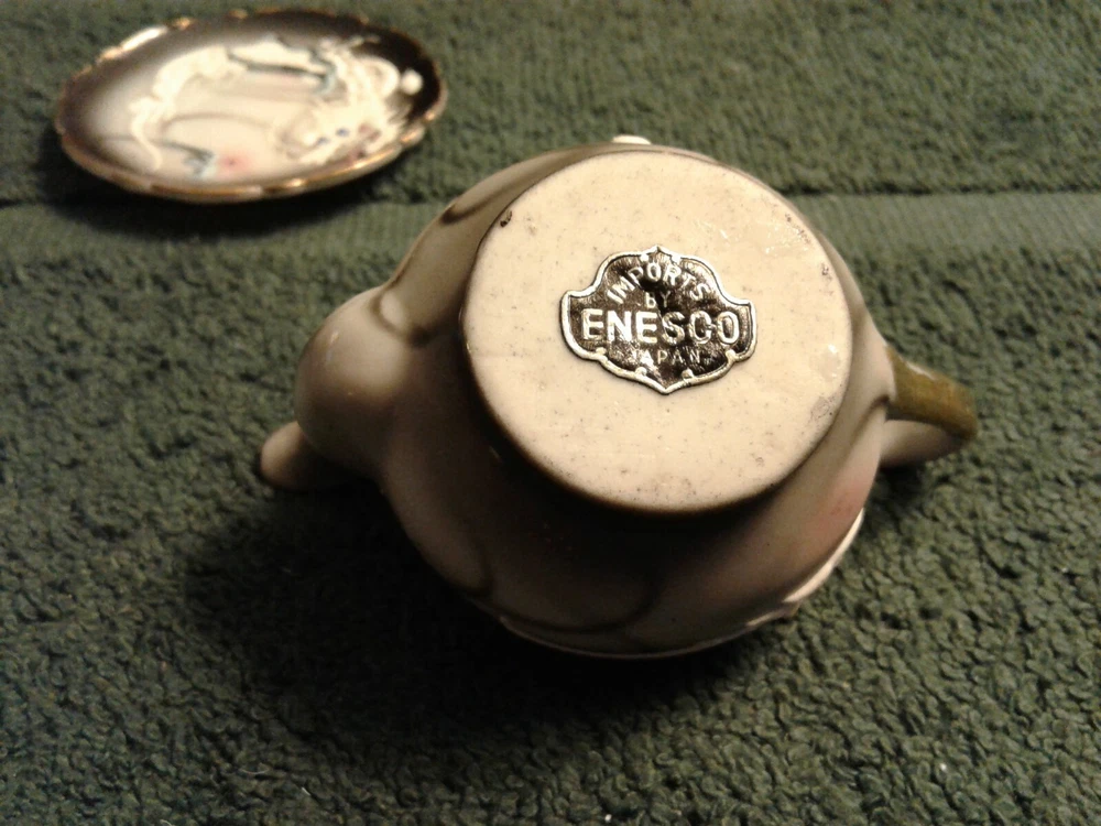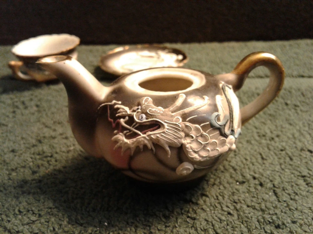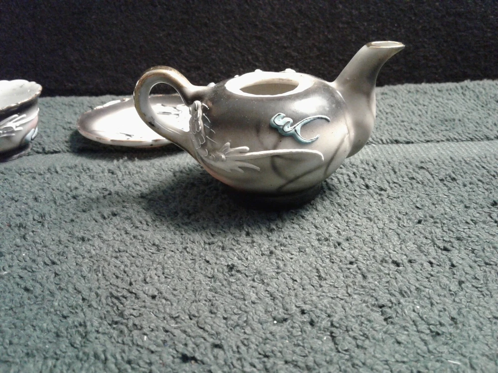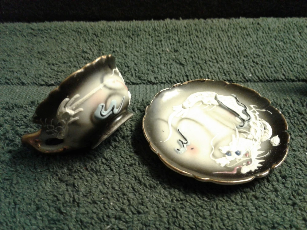 These are previously owned items. Vintage Dragon design 3 pcs of child's miniature tea set, including tea cup, saucer and tea pot with no lid. All three have paper label, Imports by ENESCO Japan. All pieces have no lines or damage. There are a few manufacturing paint flaws, including black spots in side of cup and also on saucer. There is a glaze flaw on outside edge of cup that was painted over in manufacturing (see picture). Gold around rims has worn spots on saucer, rim of cup and tea pot spout. Please look at pictures as they show more of the items discription. If you need more information please feel to e-mail me at least 2 days before end of the items listing. Return and Shipping Policy All items are sold "as is". Returns are accepted if item is not as described in the listing. Buyers must contact me within 3 days of receiving item. Items returned must be returned as shipped in original box with packaging. After 30 days all sales are final. I do not ship on Saturday or Sunday. No international shipping done. All items over $50.00 will be shipped with extra insurance coverage. All items over $200.00 will need a delivery signature. All eBay taxes are the responsibility of the buyer.