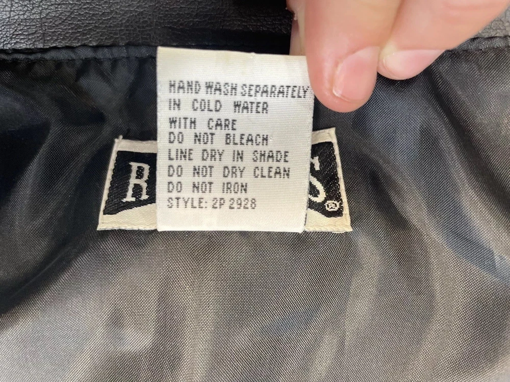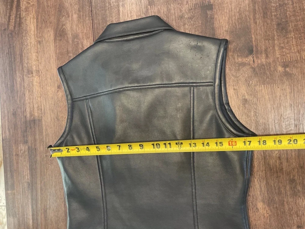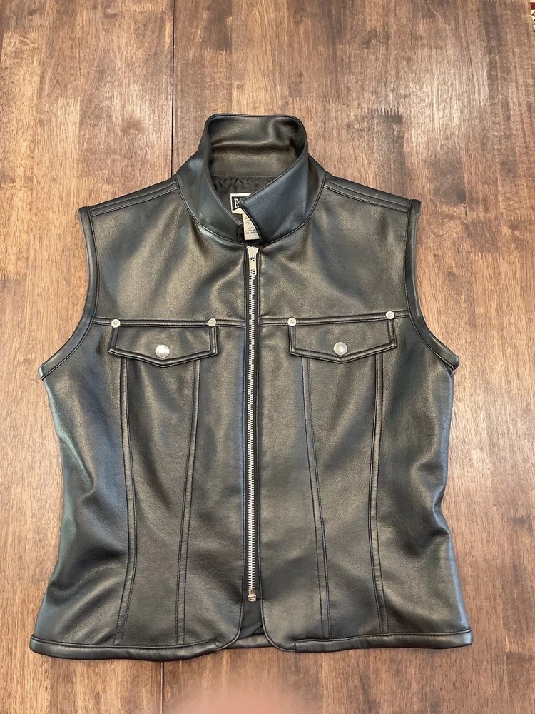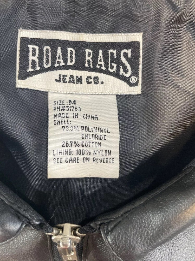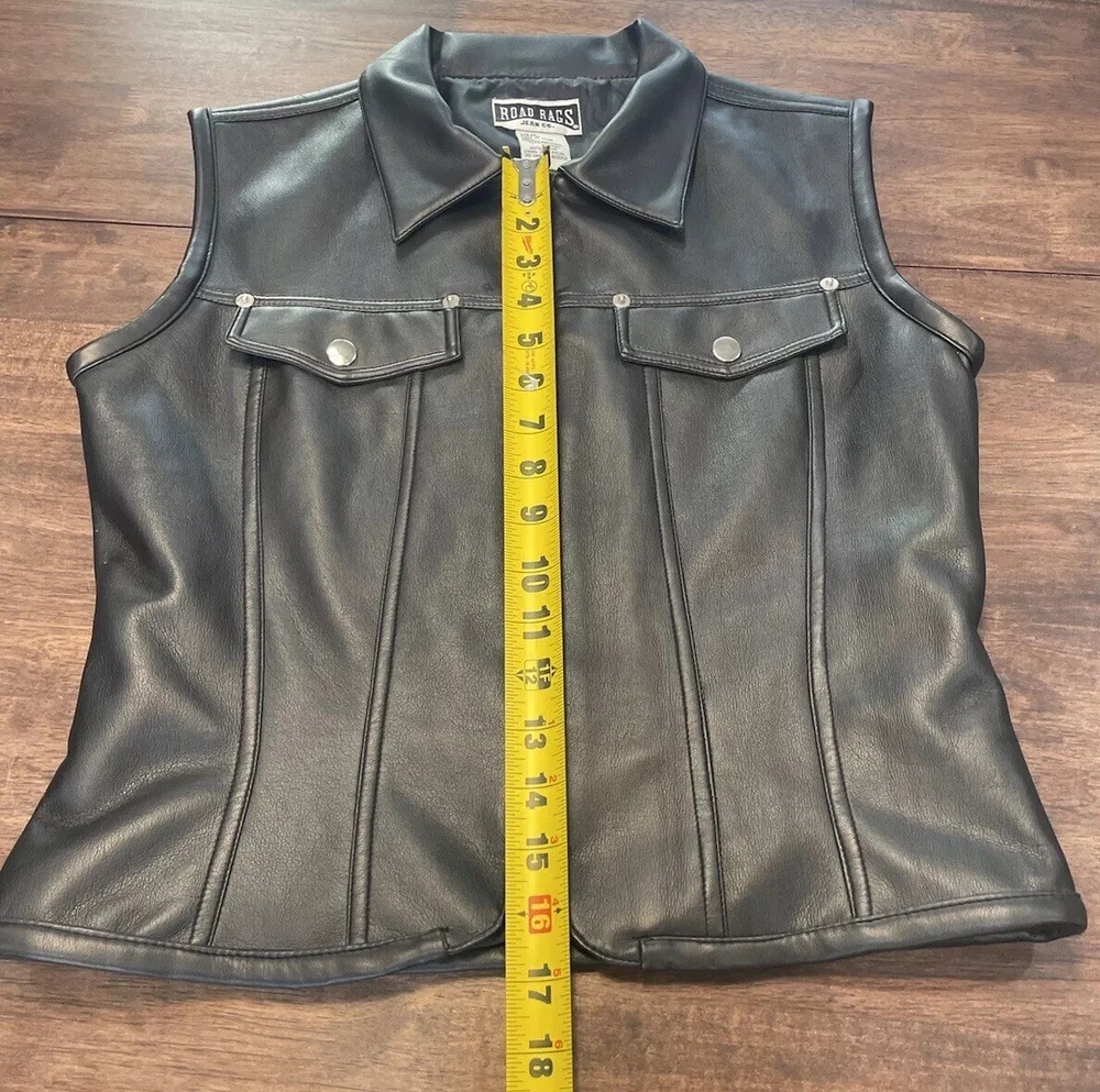 This is a black faux leather vest made by Road Rags, designed for women in size M. It has a vintage biker style with accents such as zippers and is made of polyvinyl cotton fabric. The vest is water-resistant and wind-resistant, with taped seams and a soft shell. It has zipped pockets and is lightweight and packable, suitable for all seasons.