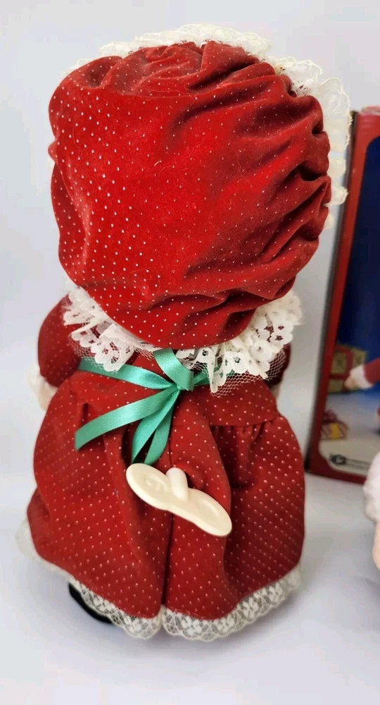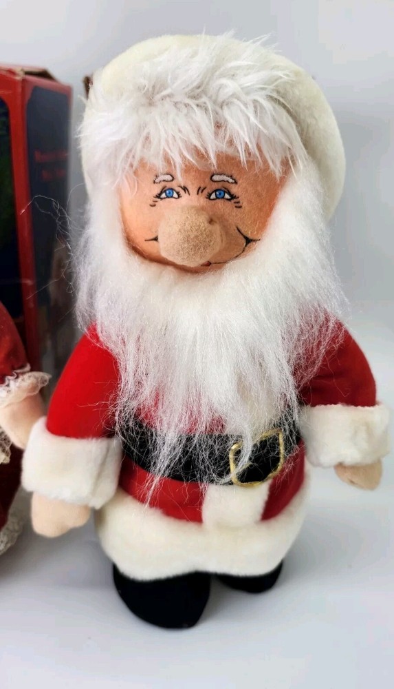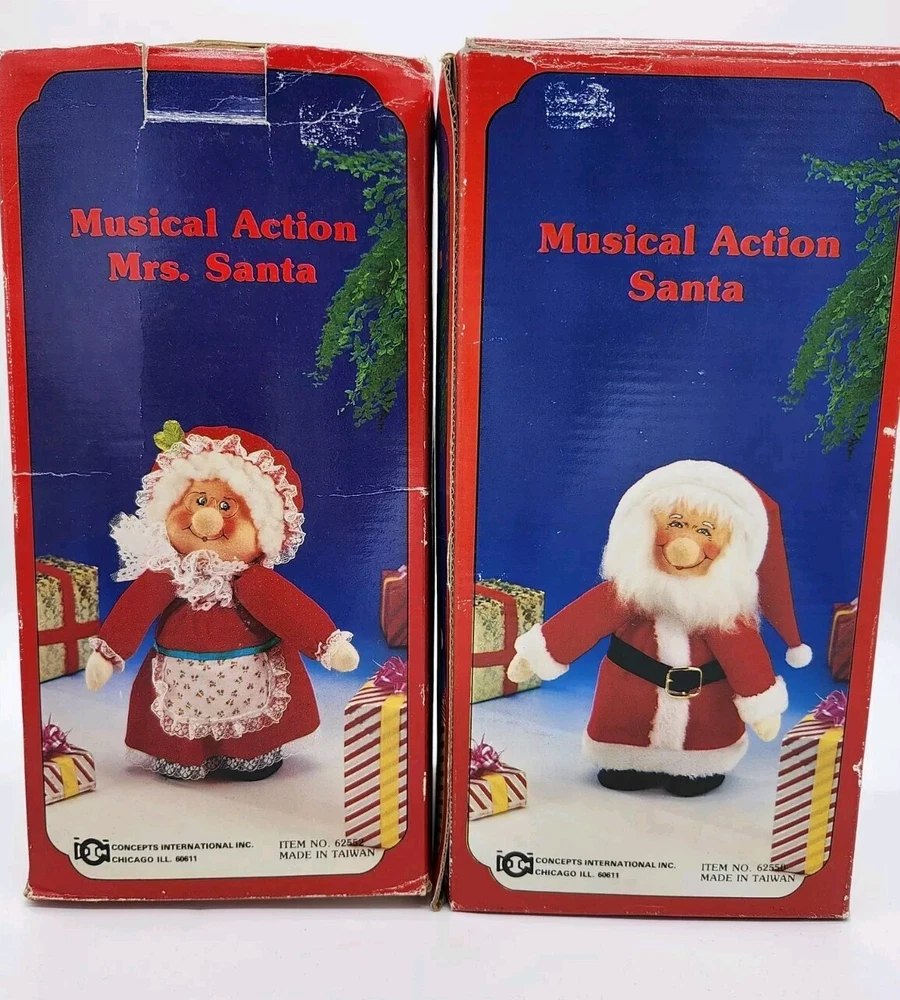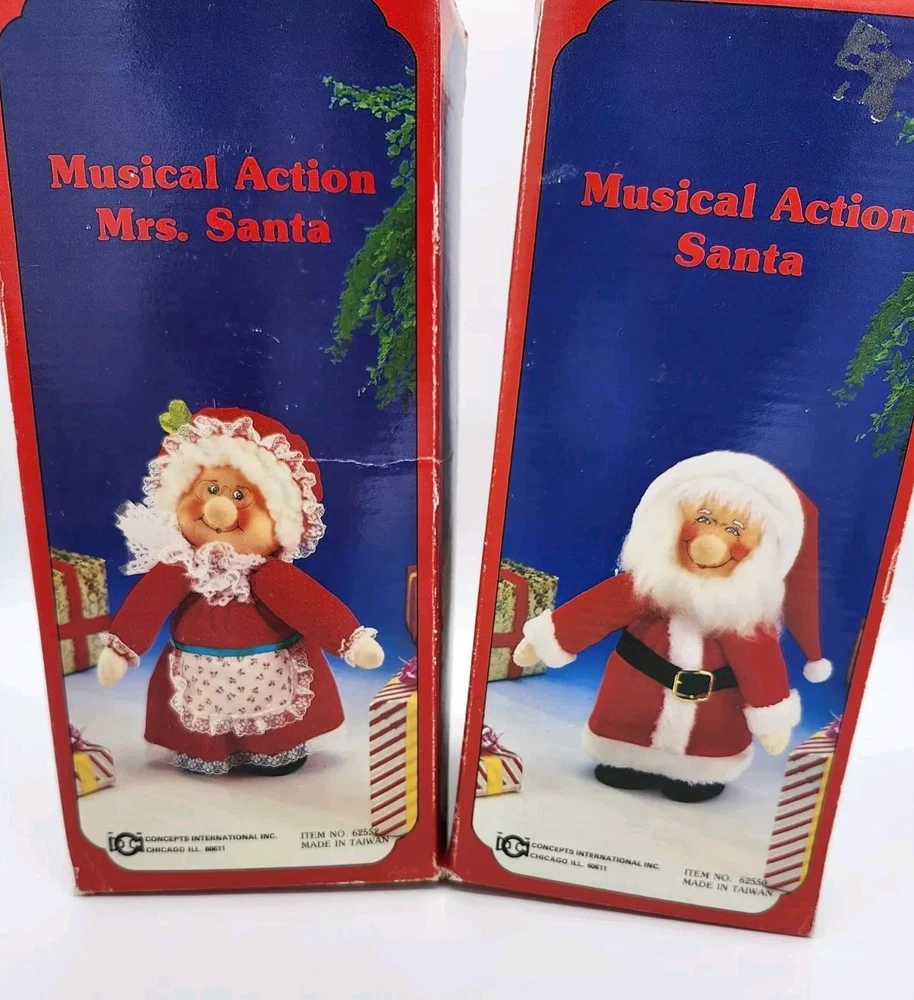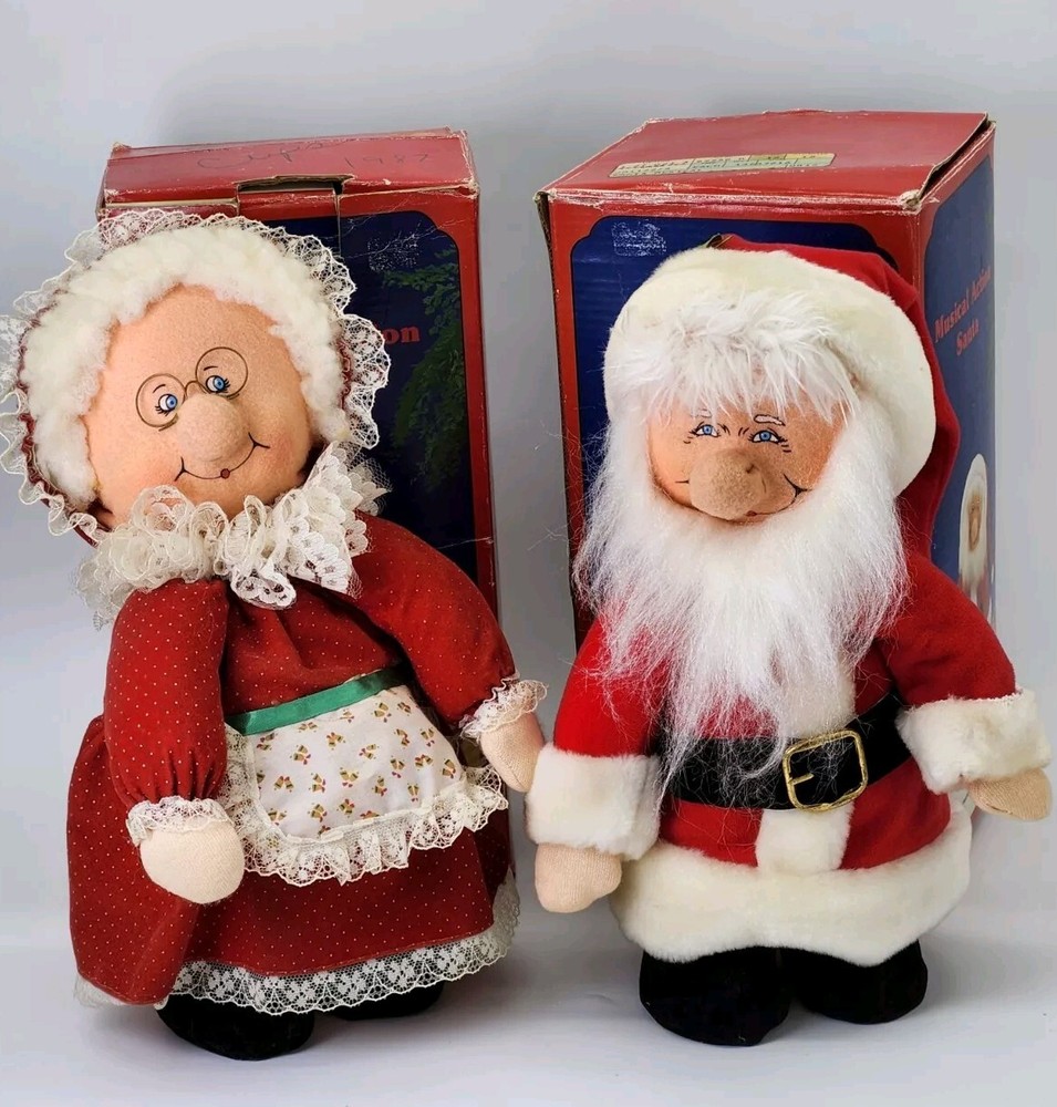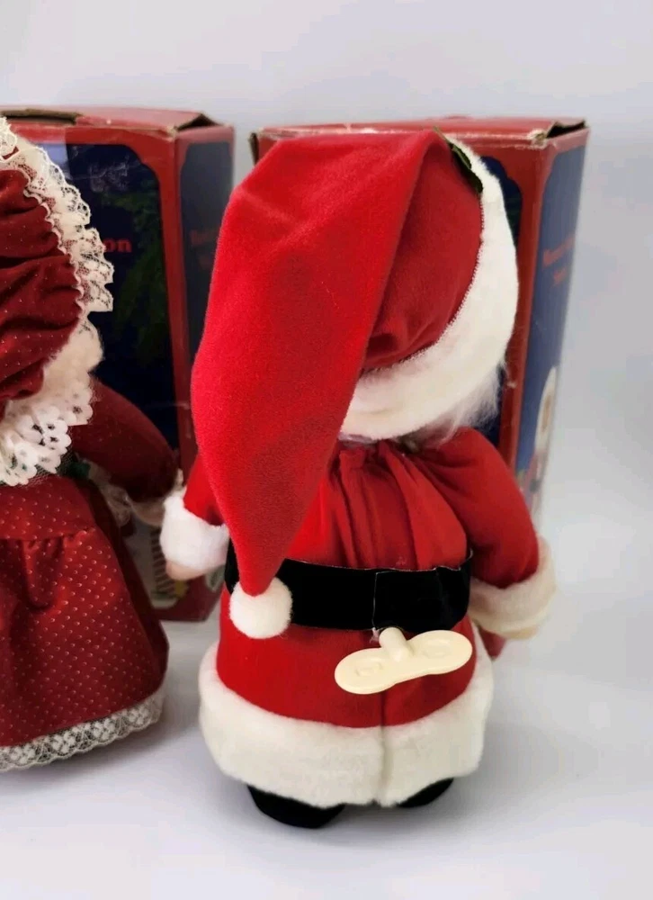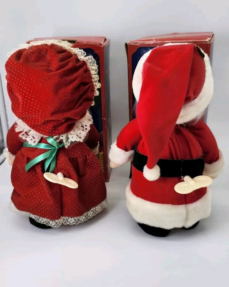 Mr.& Mrs.Santa Clause musical animation dolls. Wind-up Both dolls play Christmas music. Once wound up, they tilt their heads as the music plays. Both are approximately 10" in height Made in the 1980's IN GREAT GENTLY PRE-OWNED CONDITION. With original boxes. Fast secure shipping