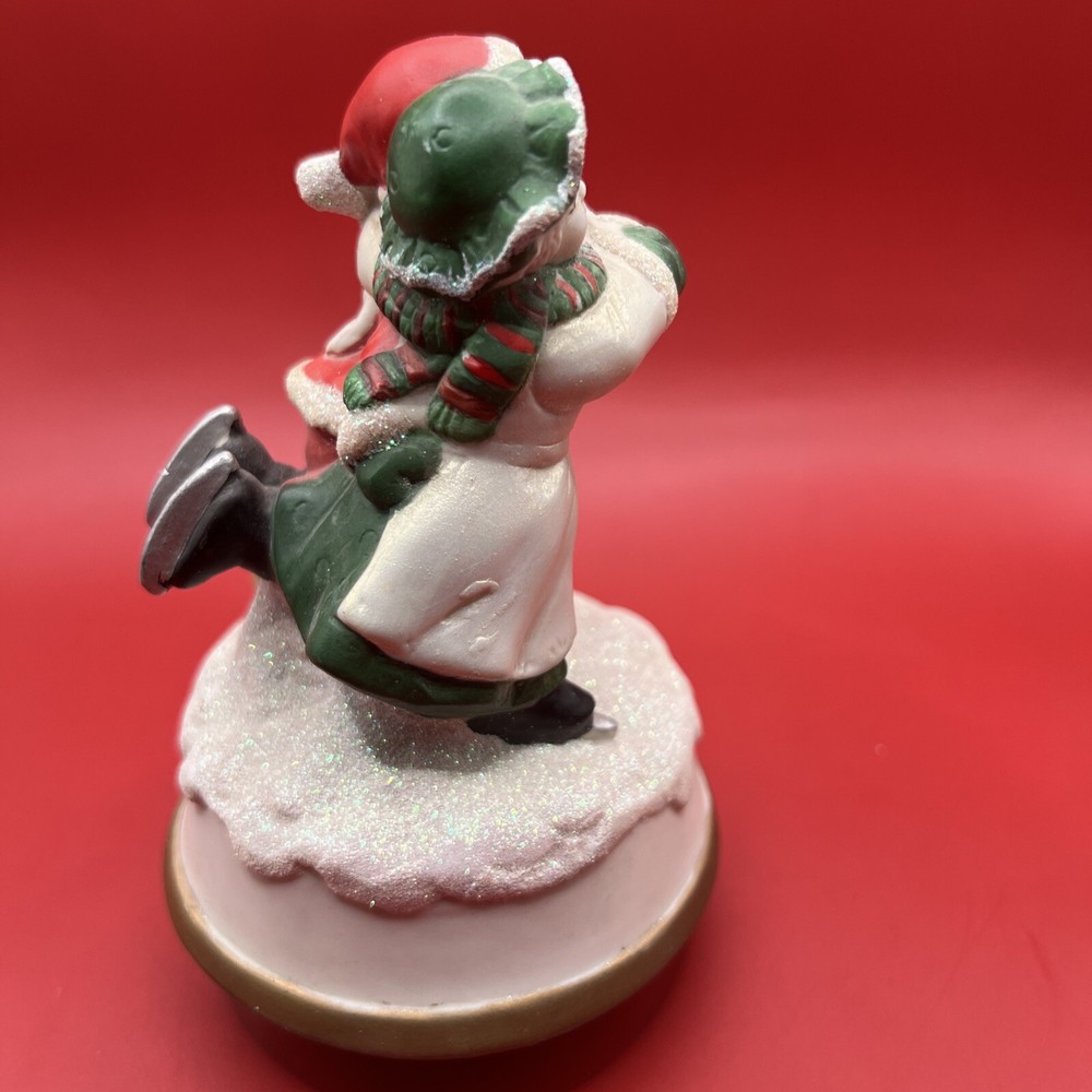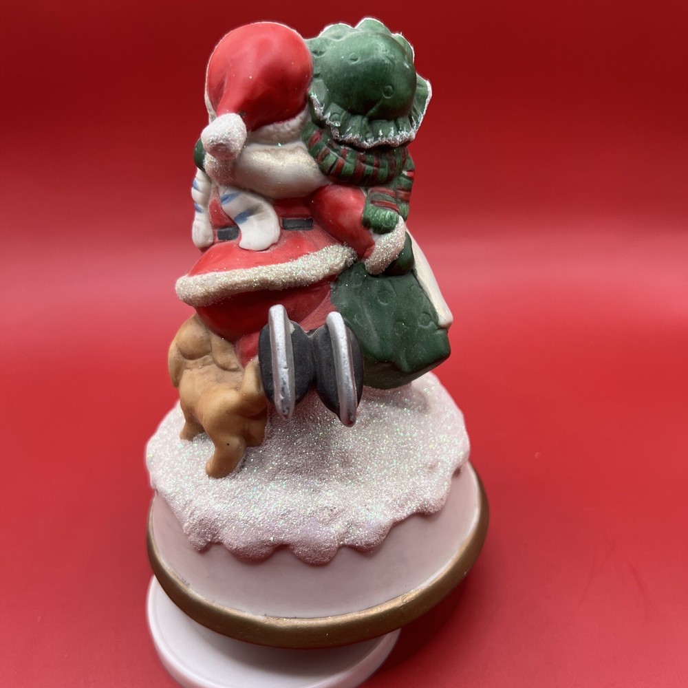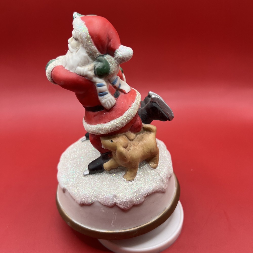 This vintage musical figurine features Santa and Mrs. Claus ice skating and playing the tune of "We Wish You A Merry Christmas." The hand-painted ceramic and porcelain figurine stands at 6 inches tall and 4 inches wide, with a weight of 12 ounces. The figurine is in excellent working order and features a 3D effect, making it a wonderful addition to any Christmas or holiday collection. The traditional style and Christmas theme of this figurine make it a great decoration for any season. It is a medium-sized unit that comes with one figurine, and it is an original piece from the mid-20th century. This collectible item is perfect for adults and children alike, and it is sure to bring joy and cheer to any room.