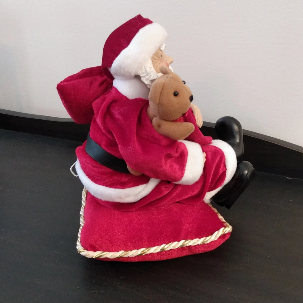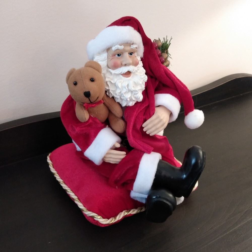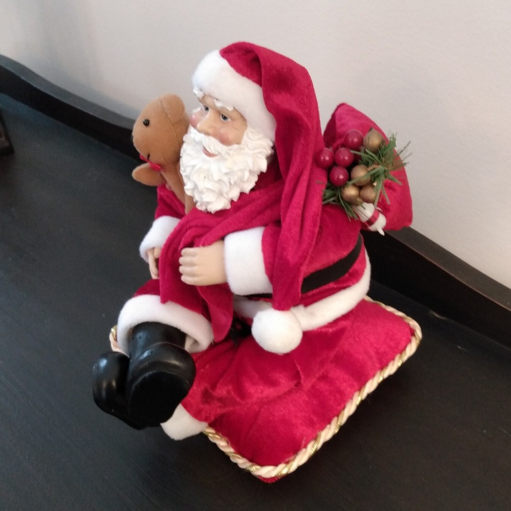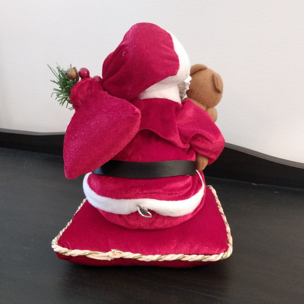 Beautiful Santa on velvet pillow. Santa is made of resin with plastic hands and shoes. Pillow is 7" square and Santa is 9" tall seated on the pillow. It has a wind up key and plays a Christmas tune. I...