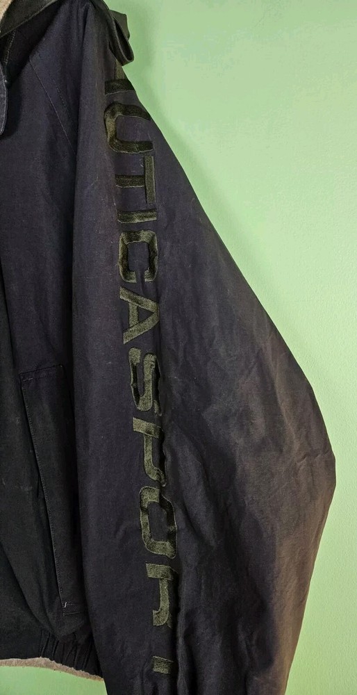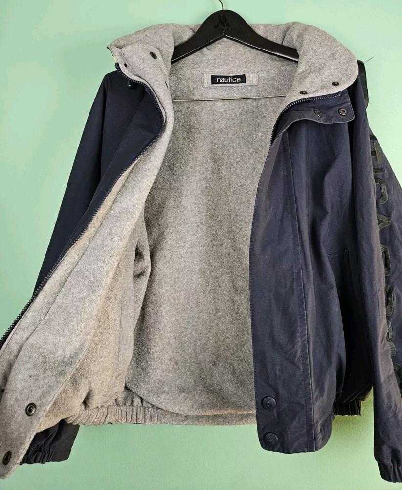 This vintage Nautica jacket is a versatile addition to any wardrobe. With a blue cotton blend outer shell and polyester lining, this mid-length jacket features a full zip closure and a removable hood. The jacket is reversible, making it suitable for different occasions and seasons. It is also lightweight, breathable, and water-resistant, making it perfect for outdoor activities such as walking. The jacket's accents include the Nautica logo and a classic, retro design that adds a touch of style to any outfit. It comes in a regular size type and is suitable for women. Whether you're going for a casual, formal, or business look, this jacket has got you covered. It is also suitable for travel and has pockets for added convenience.