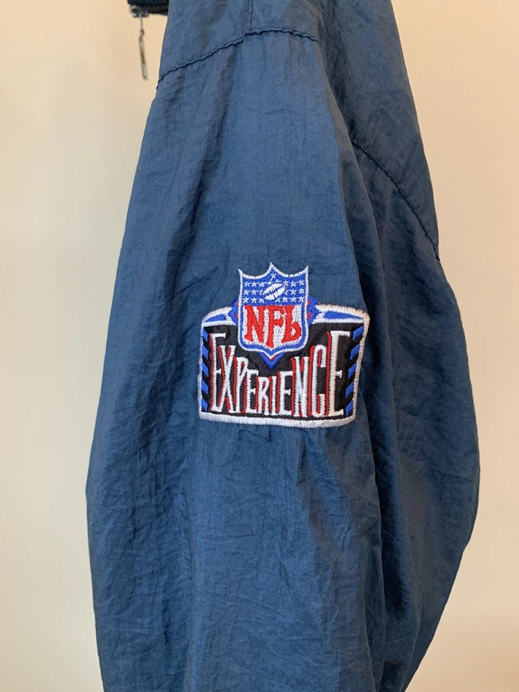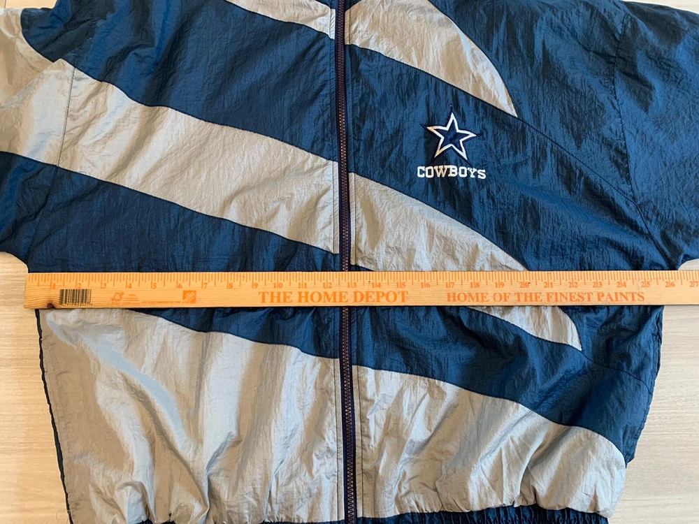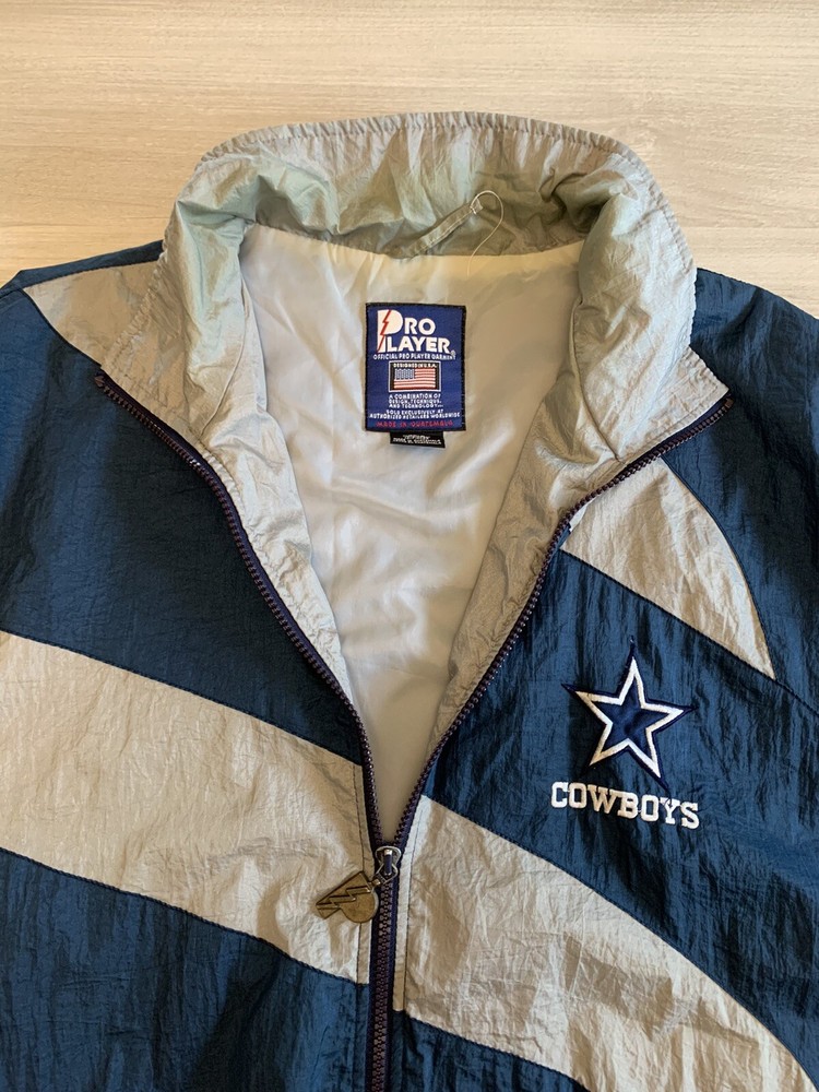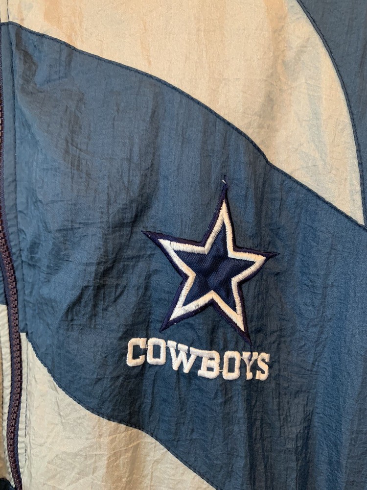 Embrace the spirit of America's favorite sport with the Vintage NFL Experience Dallas Cowboys Jacket by Pro Player. A must-have for any die-hard football enthusiast, this windbreaker is designed to keep you warm and stylish as you cheer on your team through the regular season. The jacket features a vibrant multi-color design that showcases your loyalty to the Dallas Cowboys, making it an ideal addition to any fan's wardrobe. Crafted for comfort and durability, this men's size large jacket is both officially licensed by the NFL and designed to provide a snug fit. Whether you're at the game or out and about, this Pro Player jacket is your go-to piece for showcasing your team pride while staying protected from the elements. It's a timeless piece of fan memorabilia that belongs in the collection of every dedicated Dallas Cowboys supporter. 0980