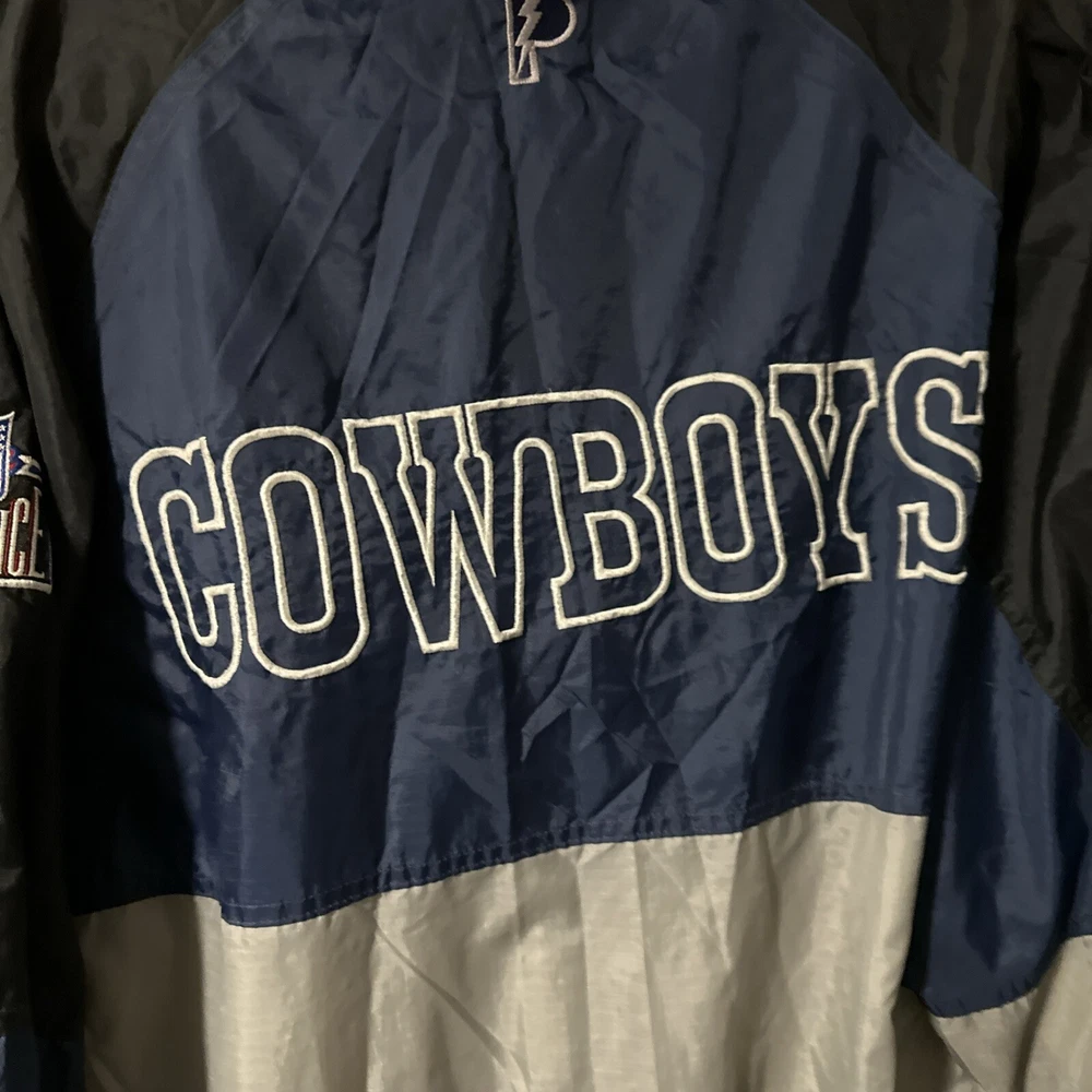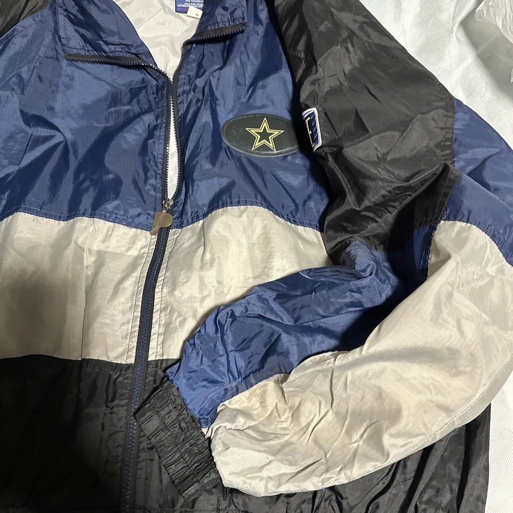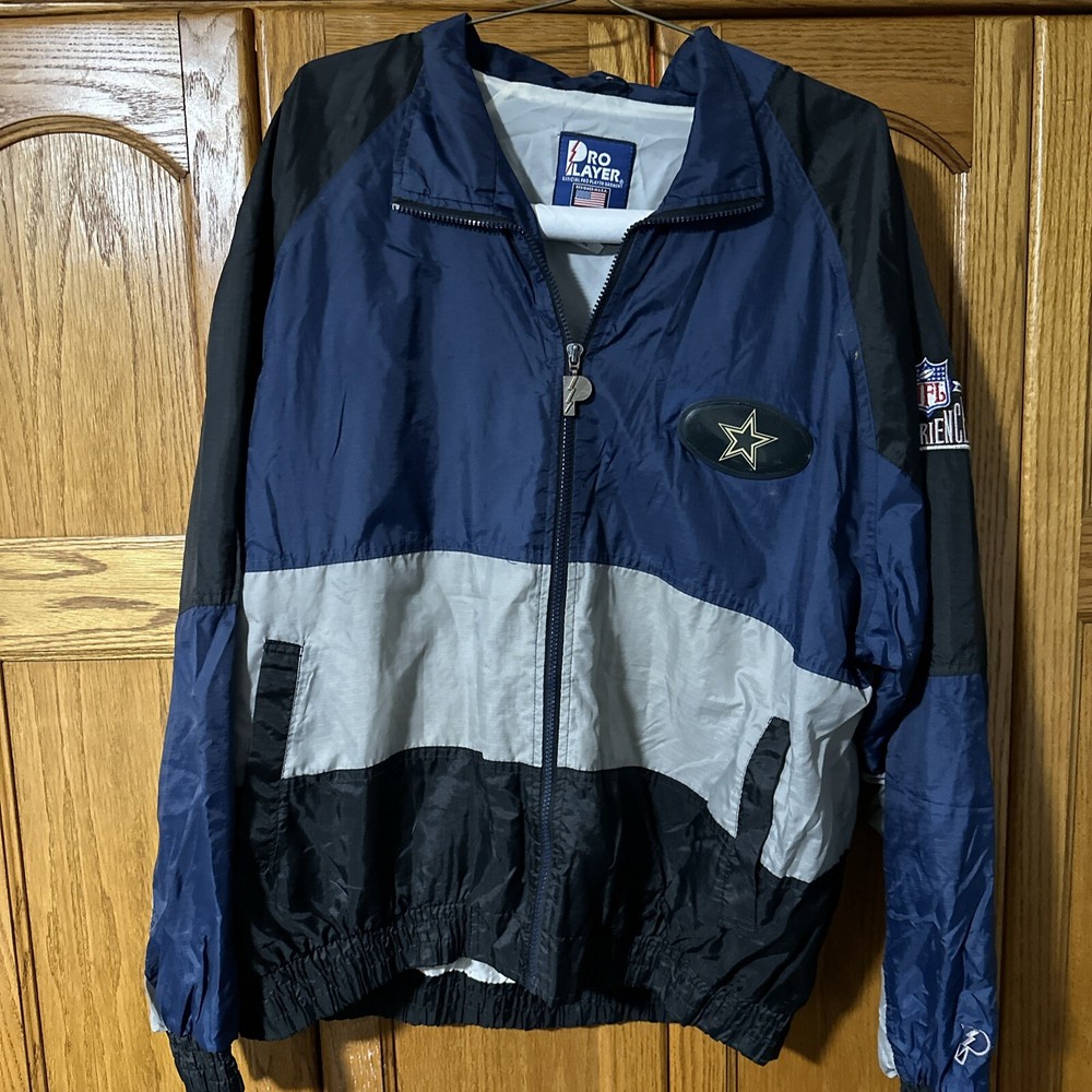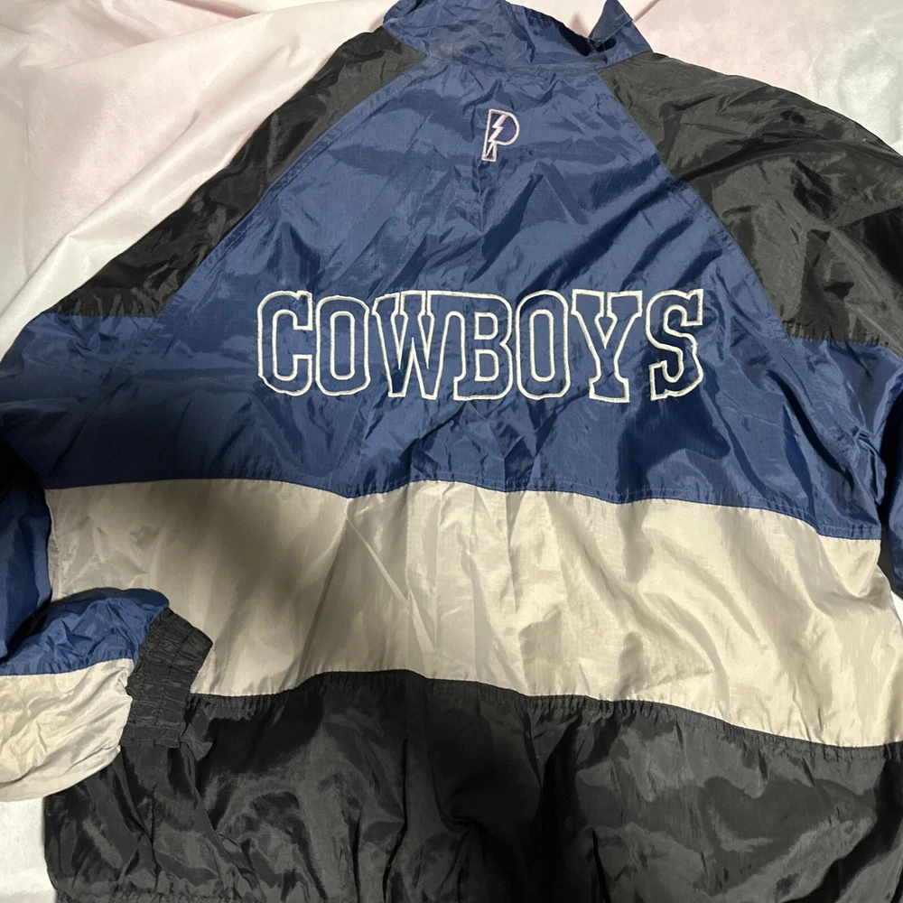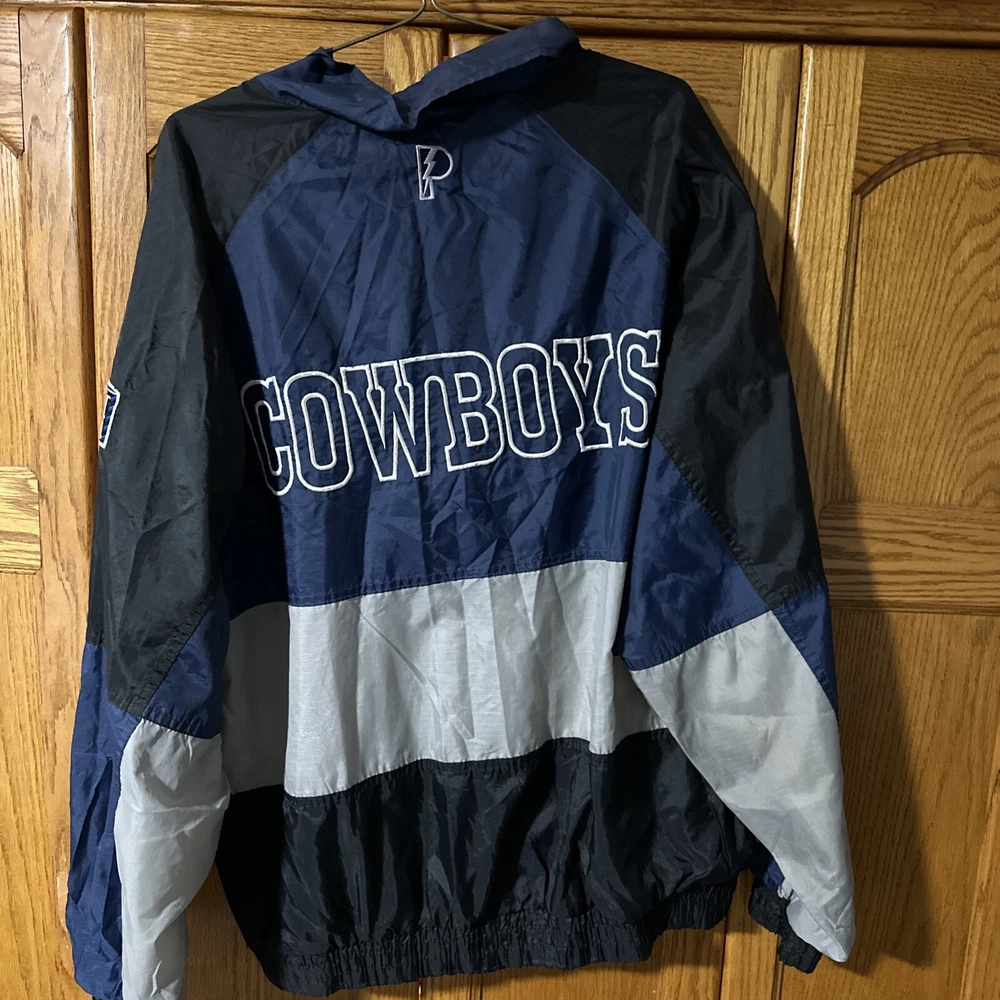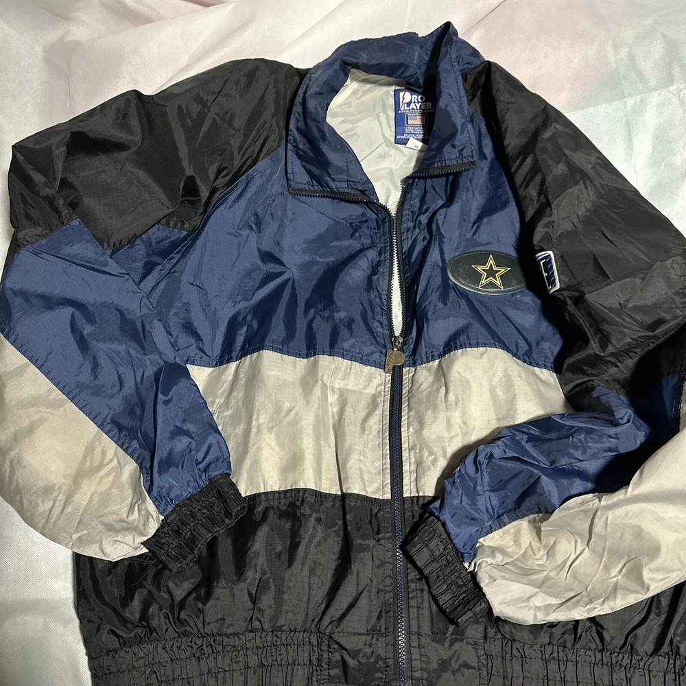 Vintage NFL cowboys pro player wind breaker size 2xl armpit to armpit hook 29 inch sleeves 26 inch top to bottom 28 inch 2 side pockets 1 inside elastic waist used but good condition no stains or tears shipping USPS ground Location room, one box 4