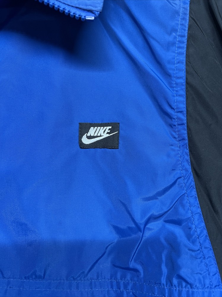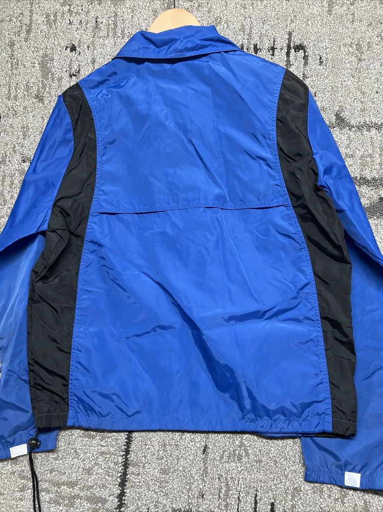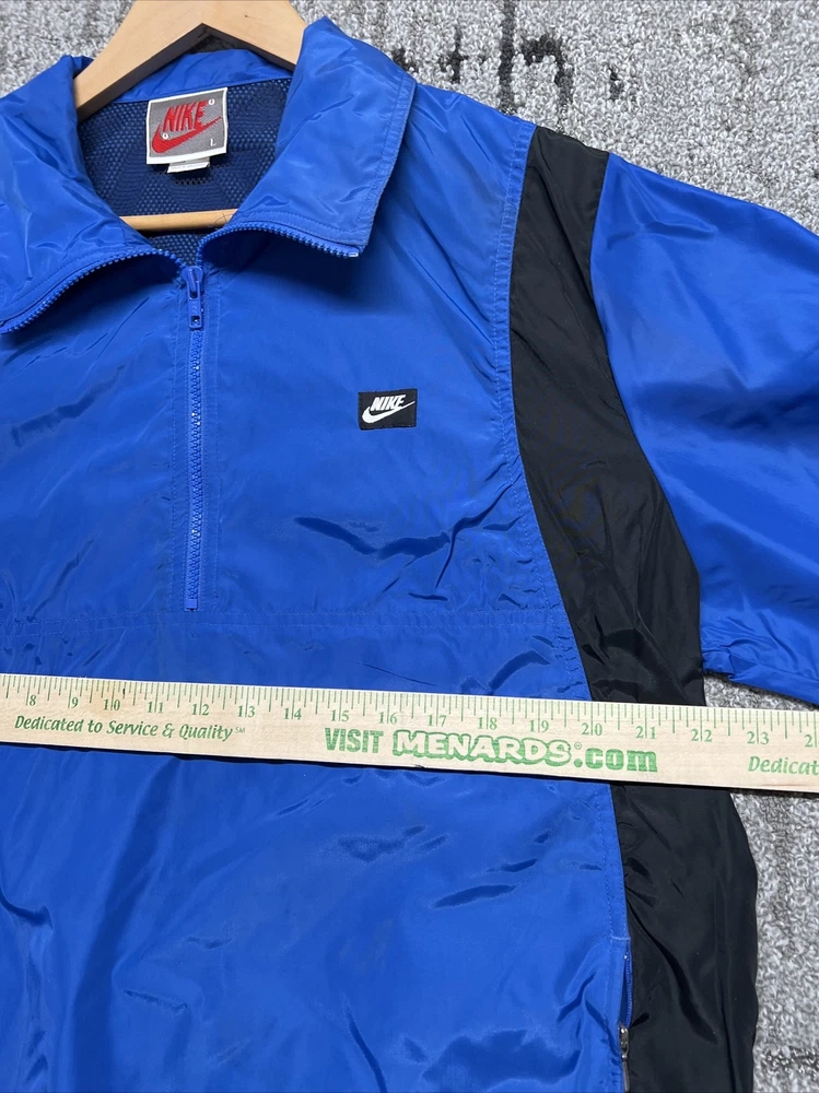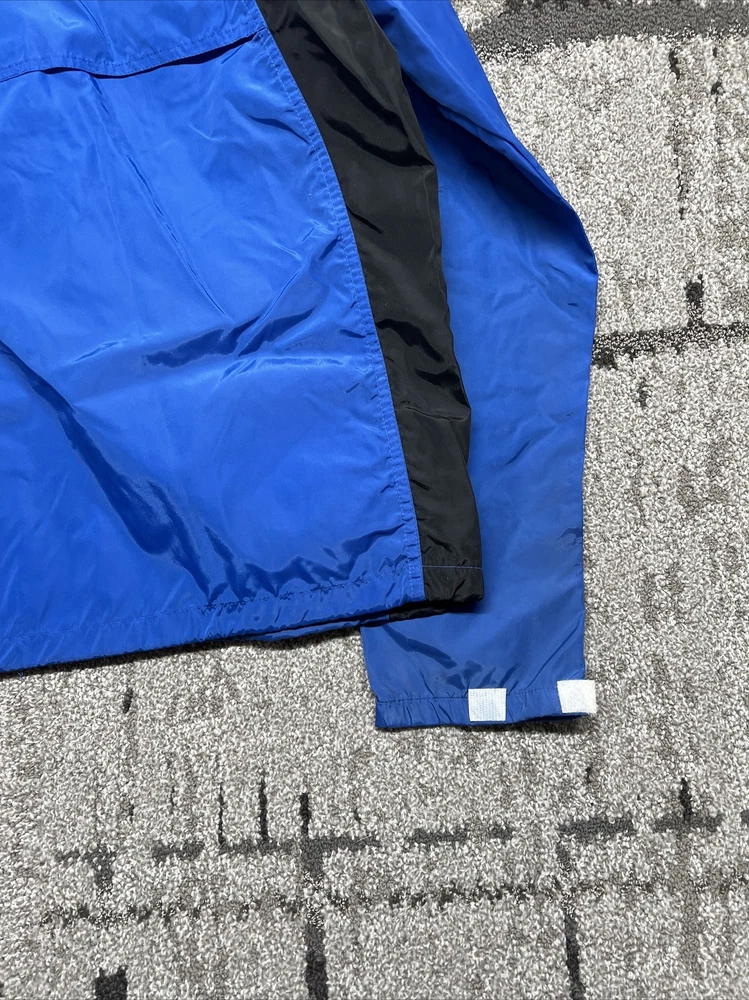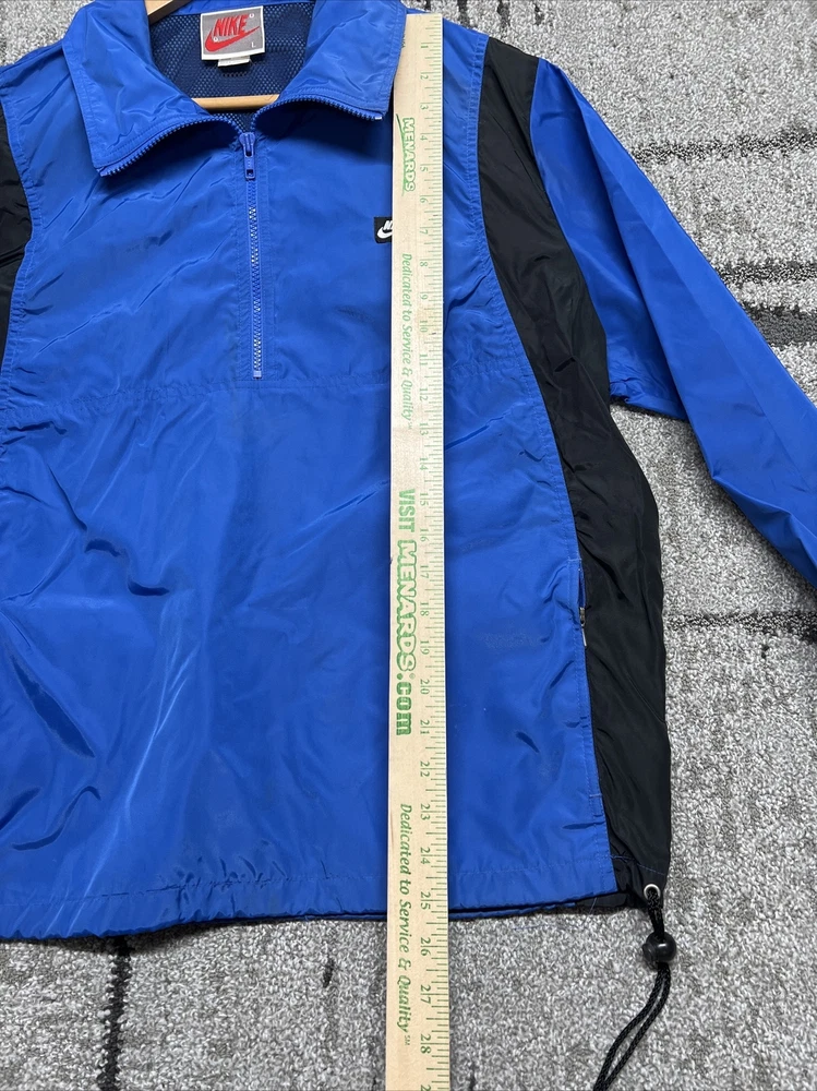 This vintage Nike windbreaker is a limited edition jacket that features an adjustable waist drawing string for all-season wear. The jacket is made of a blended fabric with a 100% Nylon outer shell material, and a 100% Polyester lining material. The jacket has a collared design and a zipclosure. There is also a drawstring waist adjustment and hook and loop Adjustment on the cuff/sleeves (someone added, could be removed) The wind-resistant jacket has a colorblock pattern with multicolor tones. The pullover jacket has long sleeves and is sized as a men's L with a relaxed fit. The 1/4 zip jacket has pockets and is suited for activewear occasions. The jacket is perfect for athleisure, sports, and casual wear. The left pocket won’t unzip,