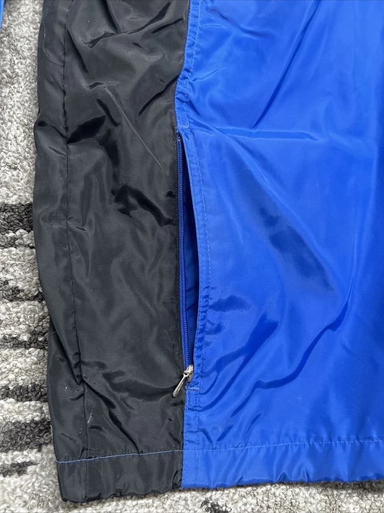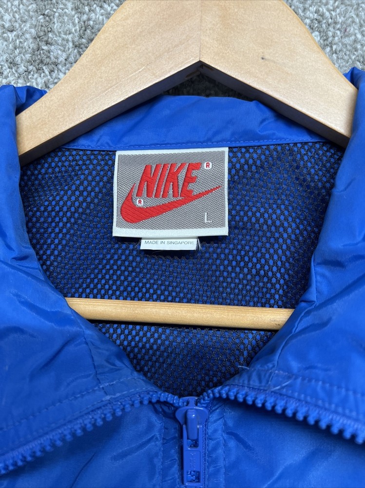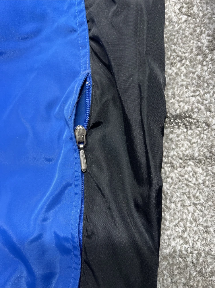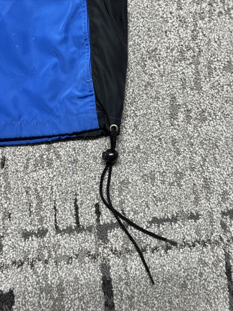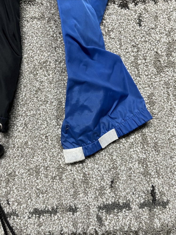 This vintage Nike windbreaker is a limited edition jacket that features an adjustable waist drawing string for all-season wear. The jacket is made of a blended fabric with a 100% Nylon outer shell material, and a 100% Polyester lining material. The jacket has a collared design and a zipclosure. There is also a drawstring waist adjustment and hook and loop Adjustment on the cuff/sleeves (someone added, could be removed) The wind-resistant jacket has a colorblock pattern with multicolor tones. The pullover jacket has long sleeves and is sized as a men's L with a relaxed fit. The 1/4 zip jacket has pockets and is suited for activewear occasions. The jacket is perfect for athleisure, sports, and casual wear. The left pocket won’t unzip,