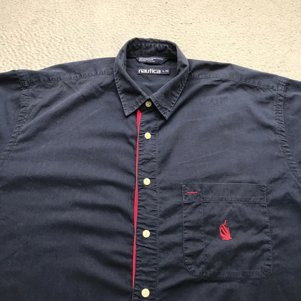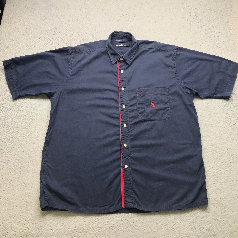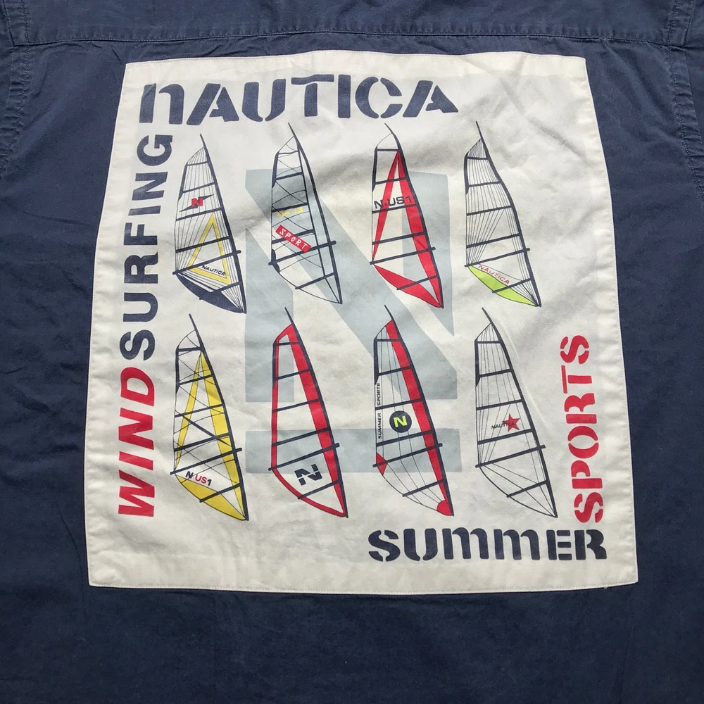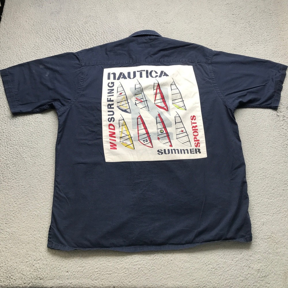 <![CDATA[<div>Vintage Nautica Wind Surfing Summer Sports Button Up Shirt Men's Size Large L Short Sleeve Pocket Graphic Embroidered Logo Navy *ITEM HAS FLAWS: Please review the label in the 2nd photo. Flaw types and location will be stated on the bottom half of the label. All flaws are pictured with arrows. Measurements are in the 2nd photos and taken in inches with the item laid flat. Please review all measurements to ensure an expected fit. Used Condition Washed and ready to wear We ship daily so expect a quick delivery Please feel free to ask any questions you may have