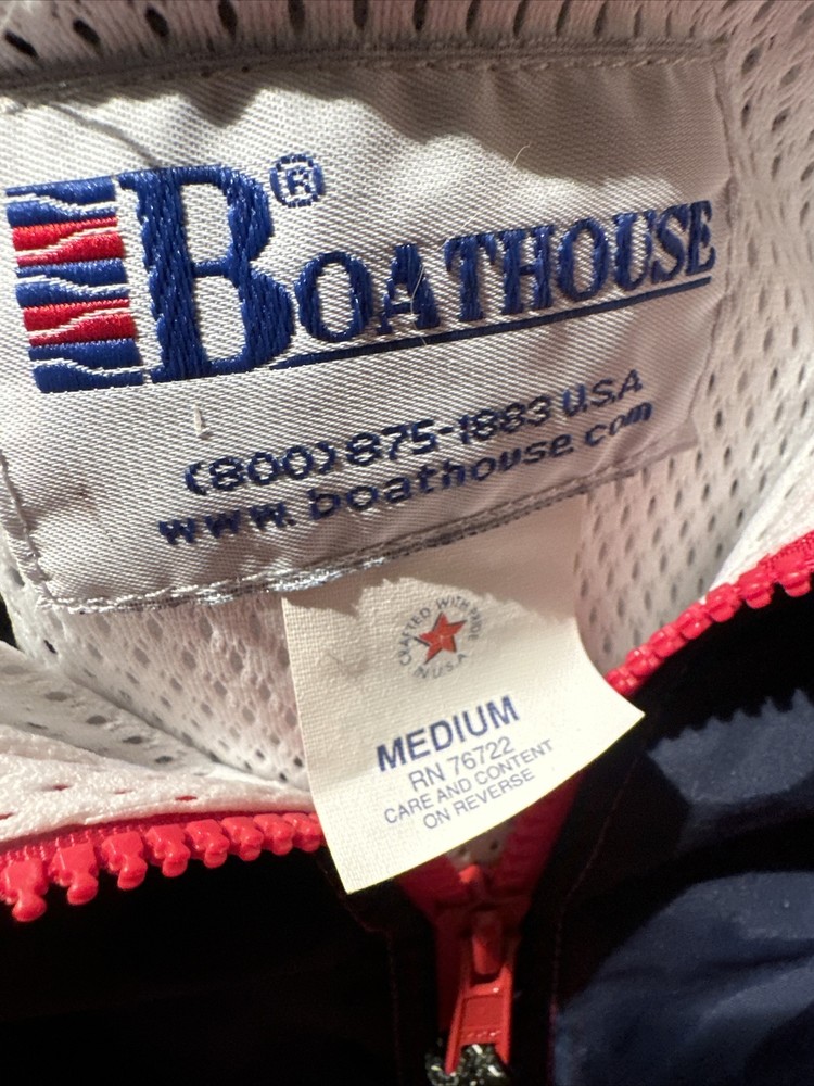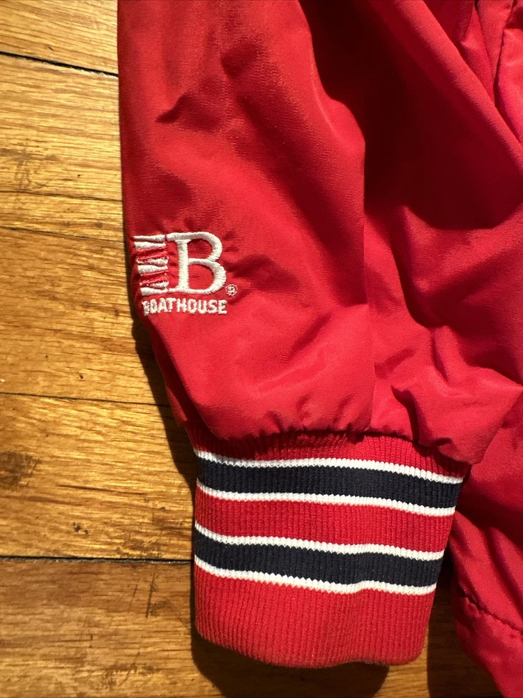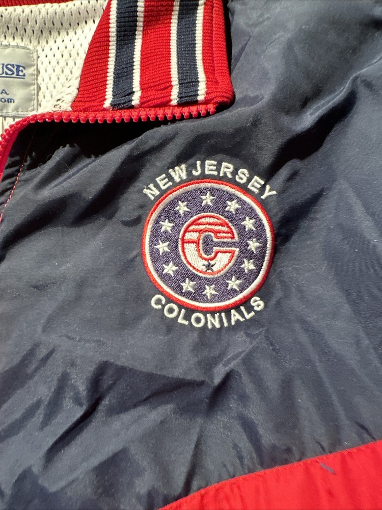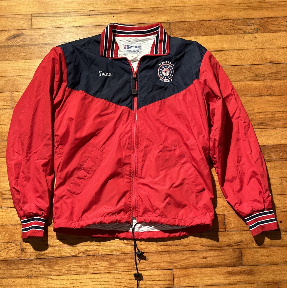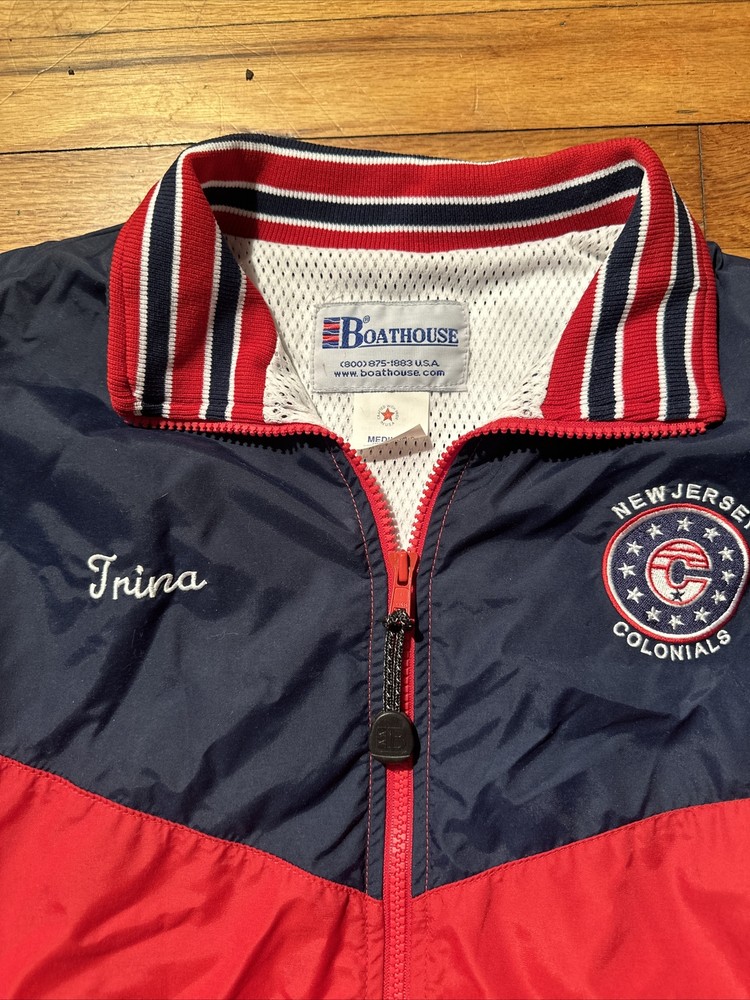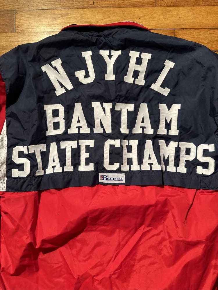This vintage Boathouse jacket is a must-have for any 90s enthusiast. The red solid nylon outer shell is accented with embroidered logos and features a classic anorak style with a mid-length zipper closure. It's perfect for any occasion, whether it's a casual day out or a party/cocktail event. The unisex M-sized jacket is windproof, breathable, and wind-resistant, making it suitable for all seasons. With its jersey fabric type, it's comfortable and easy to care for with machine washable options. The New Jersey Colonials Bantam State Champion Hockey Jacket is perfect for hockey fans and anyone looking for a unique vintage piece to add to their collection.