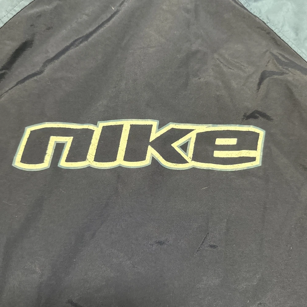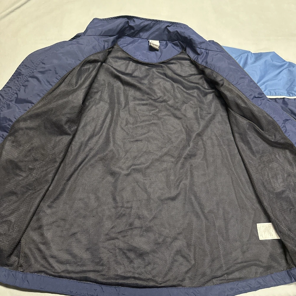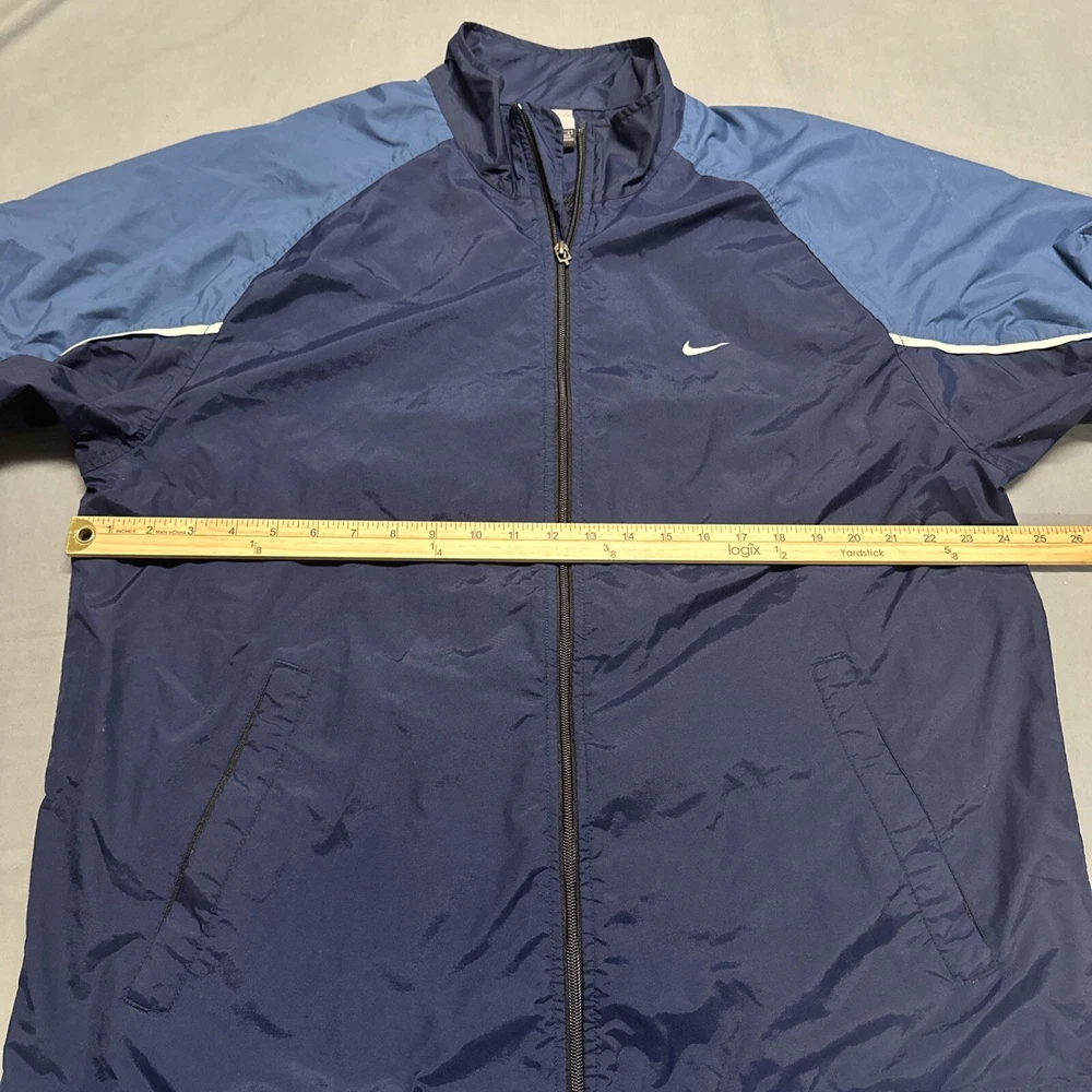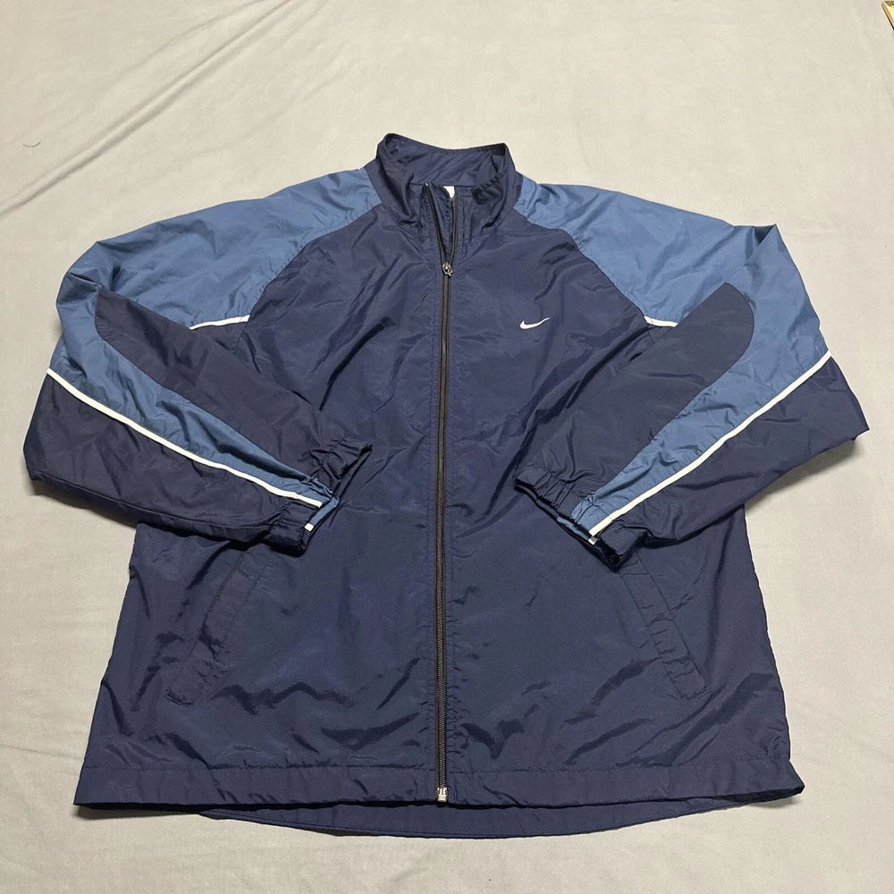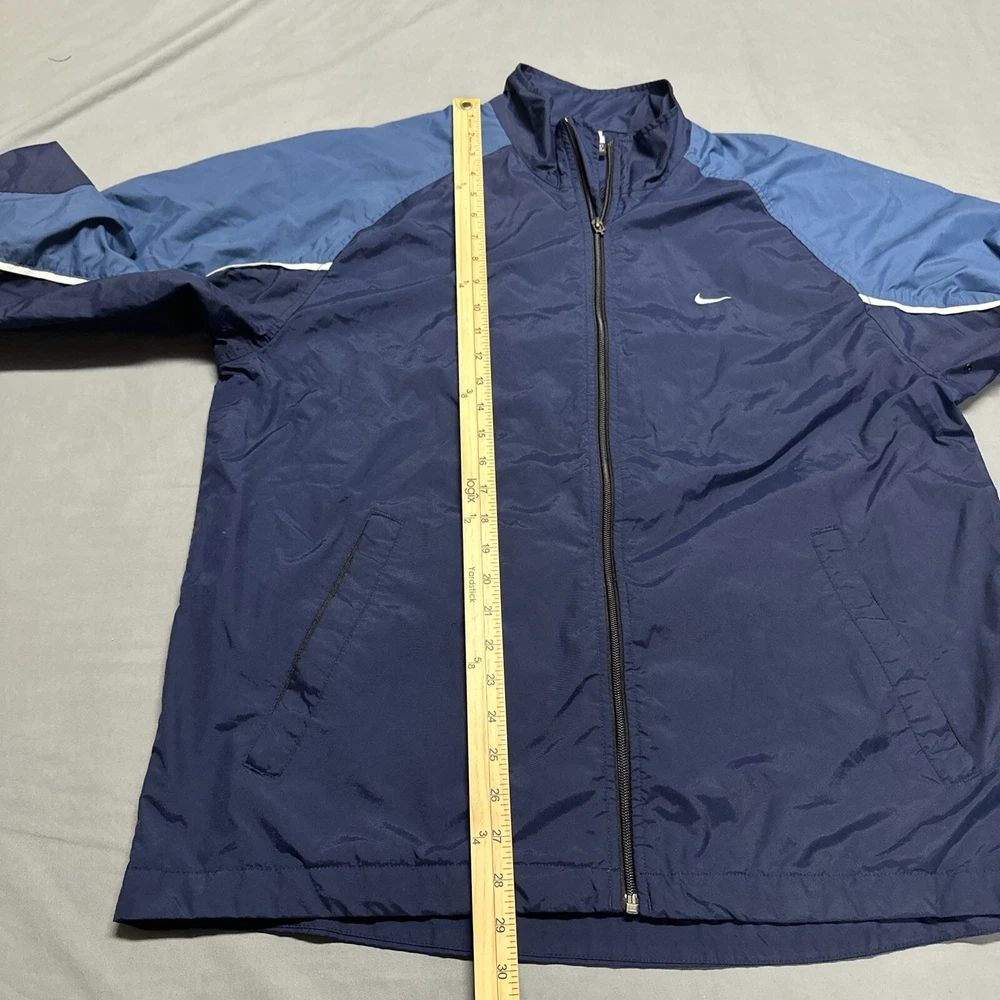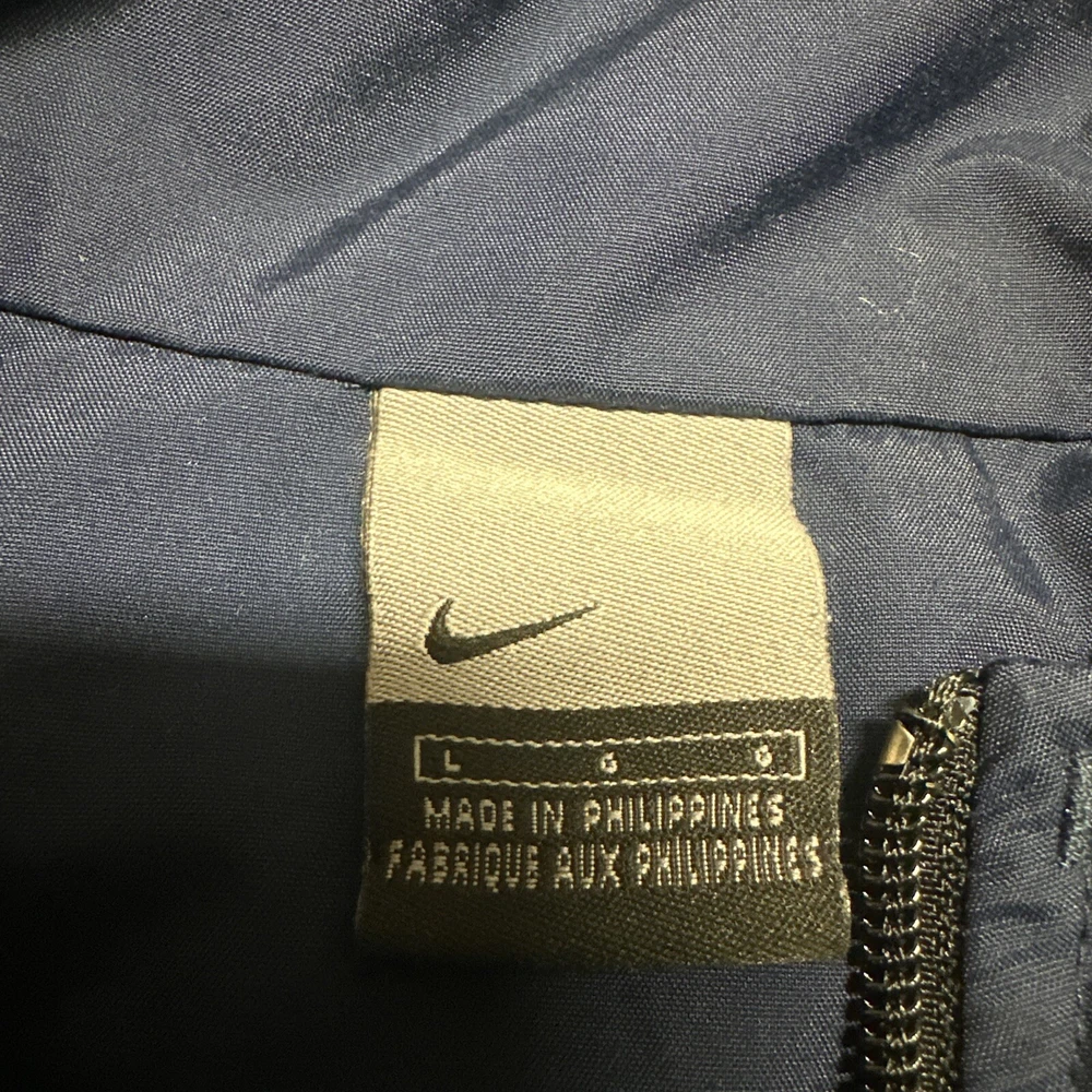Jacket in great preowned condition See pics for accurate measurements and condition See zipper tab is missing I ship every day Item # 487 This is a vintage men's windbreaker jacket from Nike. It is made of lightweight and breathable blue nylon material with a polyester lining. The jacket features a full zip closure, a hood, and pockets. It is water-resistant and wind-resistant, making it suitable for all seasons. The jacket has a big spellout on the back and is vented for added comfort. It is a size large and has a regular fit. This jacket was made in the Philippines.