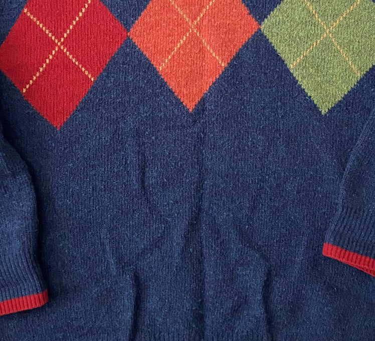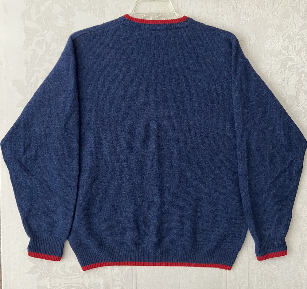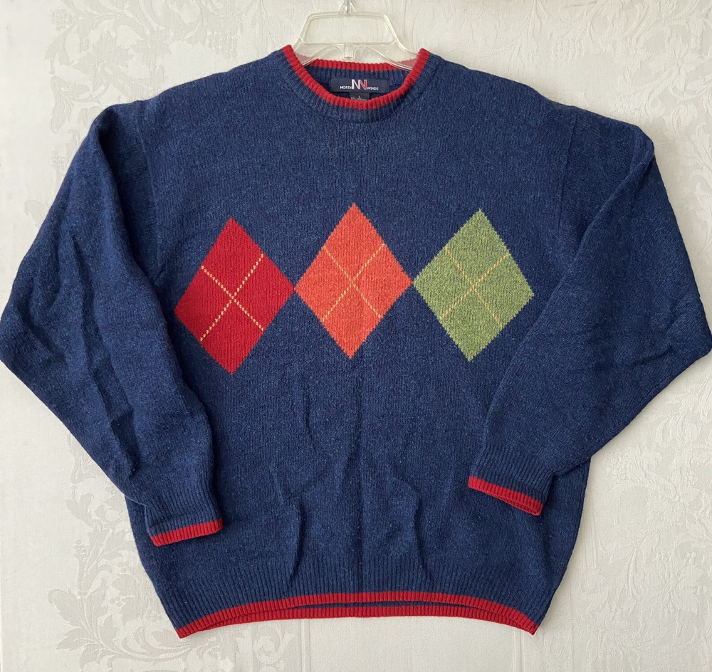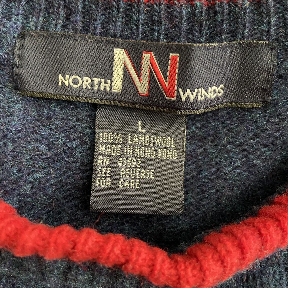 This vintage North Winds sweater is crafted from high-quality lambswool in a classic argyle diamond pattern. With a crew neck and long sleeves, it's perfect for all seasons and occasions, from casual wear to workwear and travel. The tight-knit fabric ensures durability and a comfortable fit, while the hand-wash-only care instructions protect the sweater's integrity. This blue pullover sweater has a regular fit and is size L, with a chest measurement of 48 inches and a length of 28 inches. Its 90s style and performance features make it suitable for outdoor activities like walking, golf, and hiking. Made in Hong Kong, this sweater is a timeless addition to any wardrobe, without mentioning its condition.
