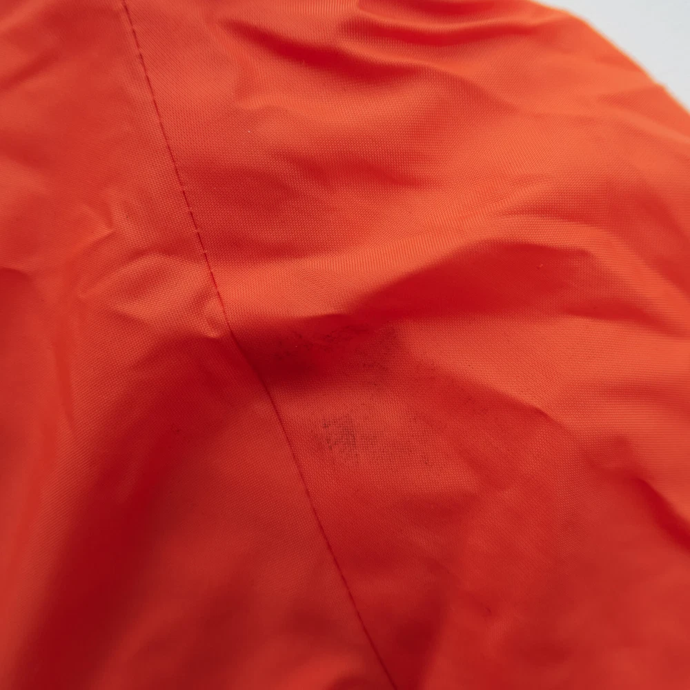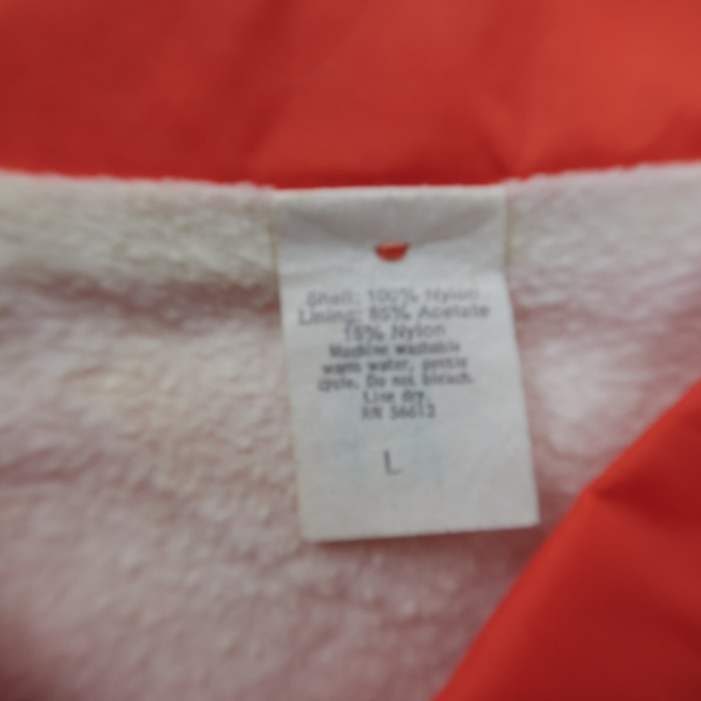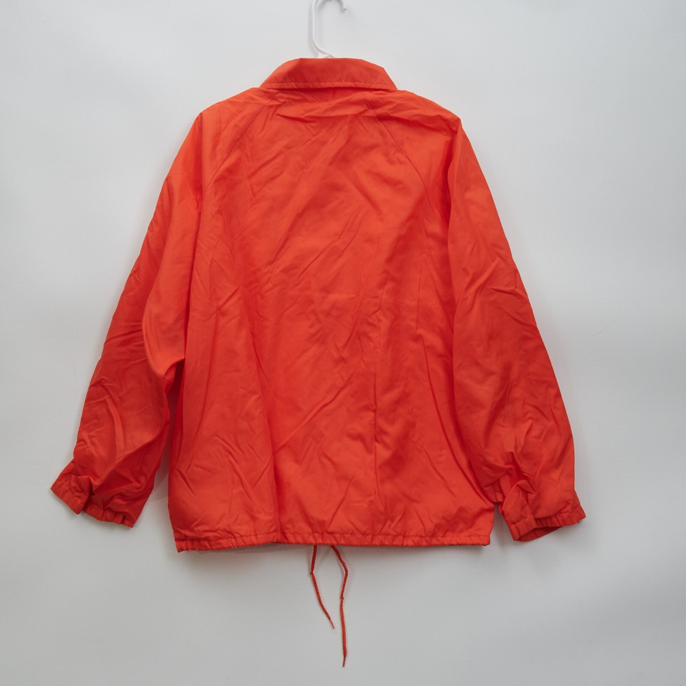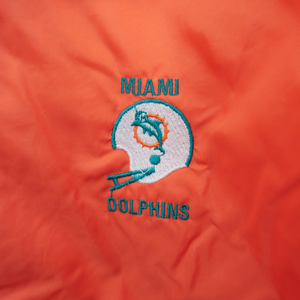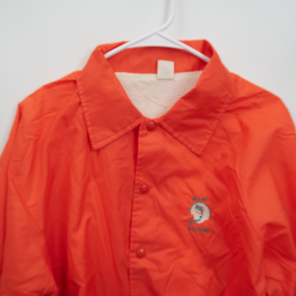 Vintage Orange Miami Dolphins Lined Wind Breaker Size Large Used. No rips or holes. There are a few stains on the upper back. See photos. Pit to pit - 21.5" Neck to bottom hem - 27.5" Neck to wrist - 29"