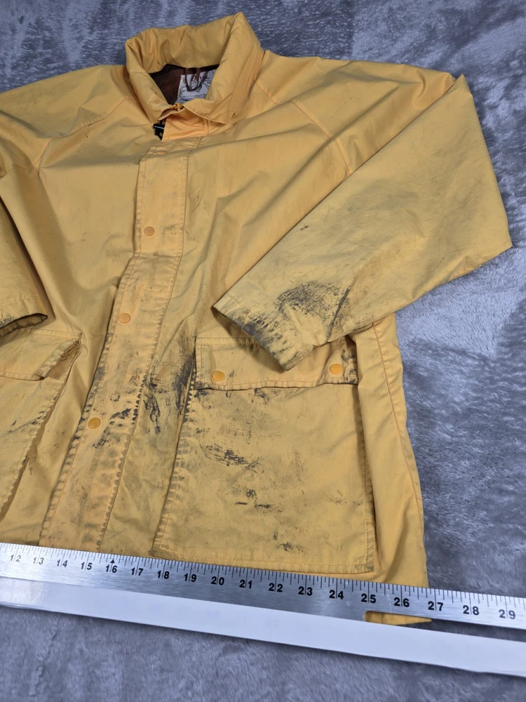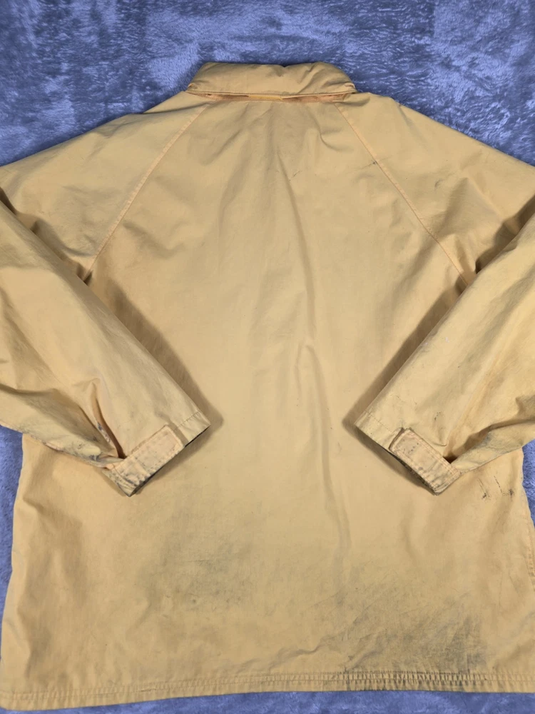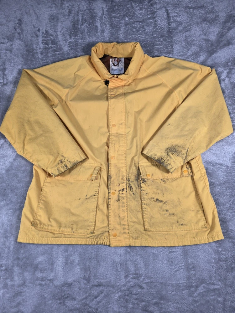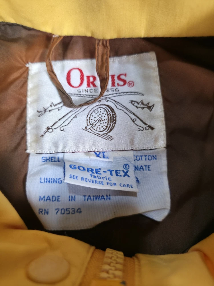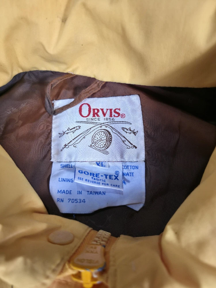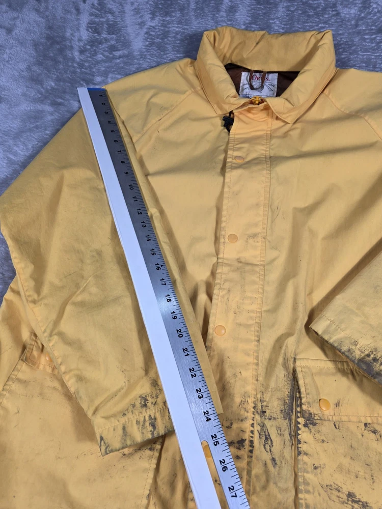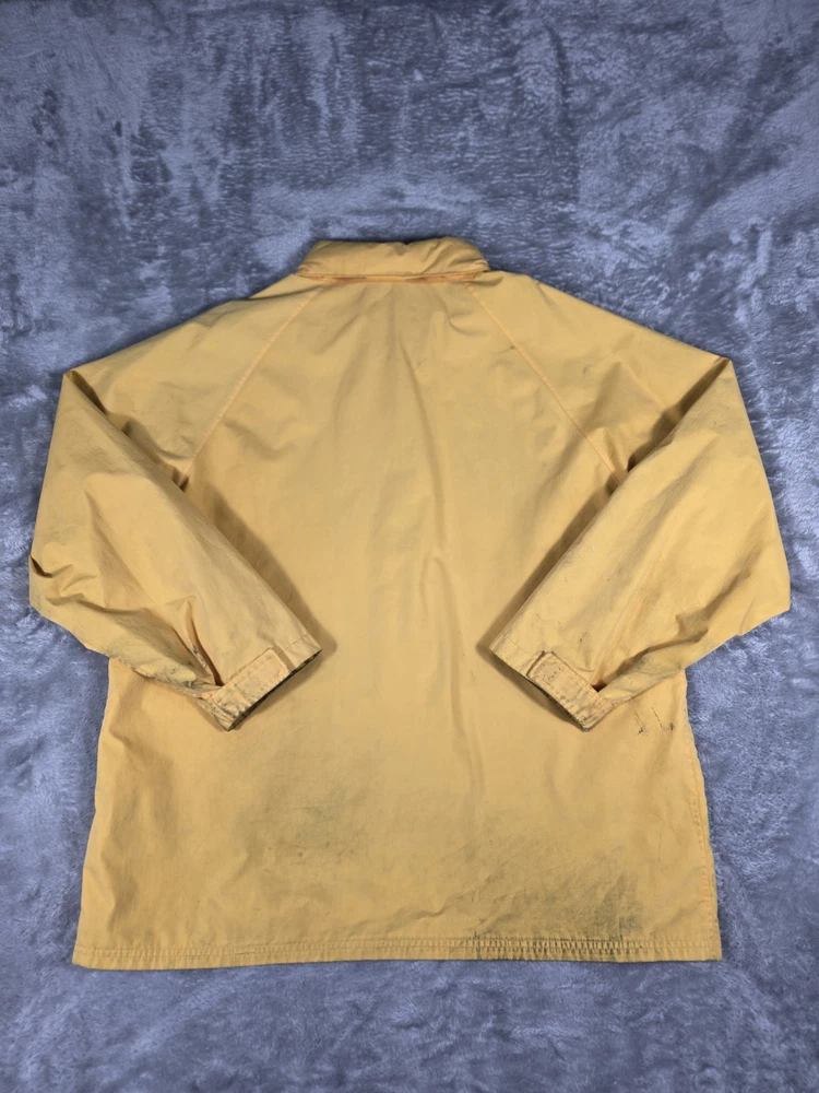 This vintage Orvis raincoat is a must-have for any outdoor enthusiast. Made with Gore-Tex, it is water and wind-resistant, making it perfect for any rainy or windy day. The jacket features a full zip closure with additional snap buttons, elastic waist, and lightweight material, making it comfortable and practical for everyday wear or outdoor activities such as camping, hiking, and fishing. This is a pre owned item and will have some staining and wear.