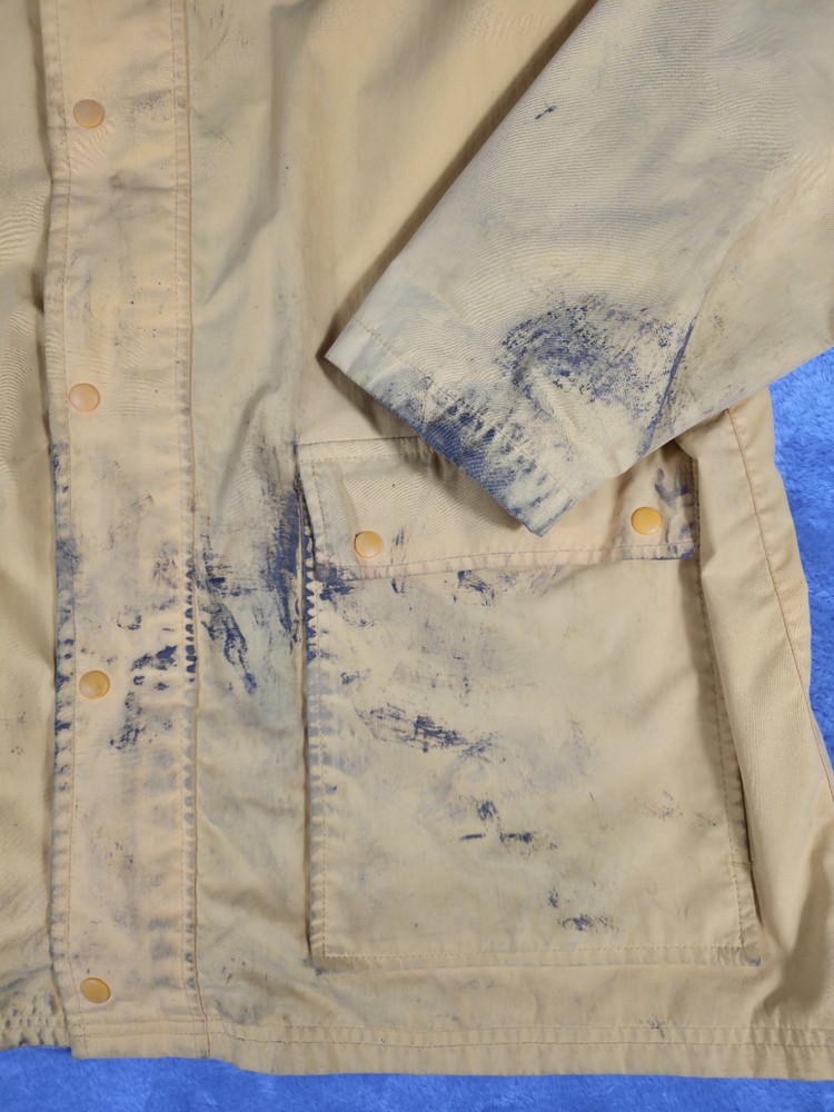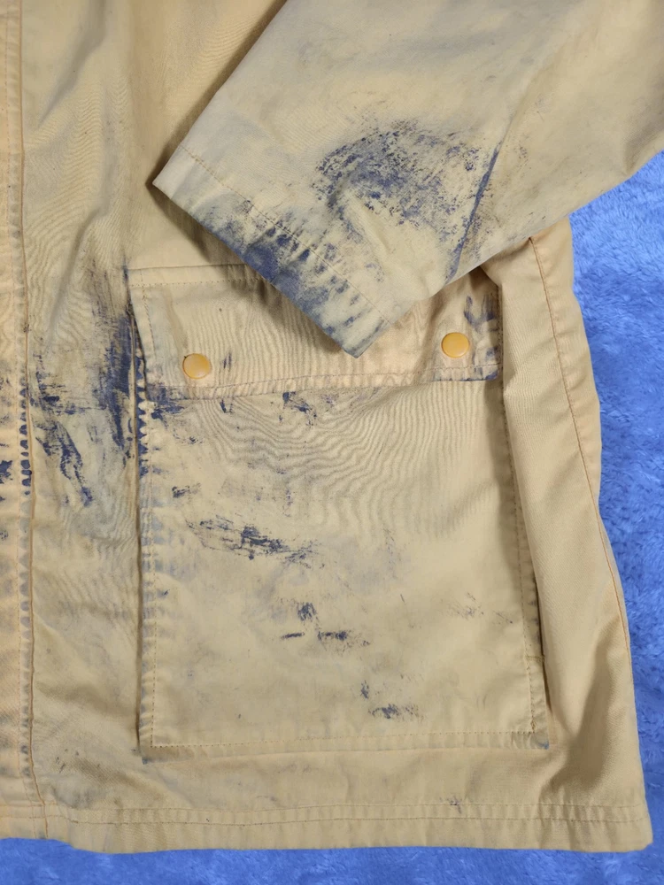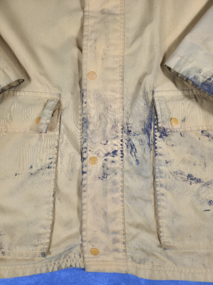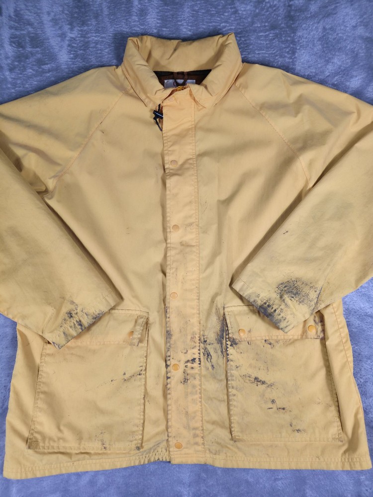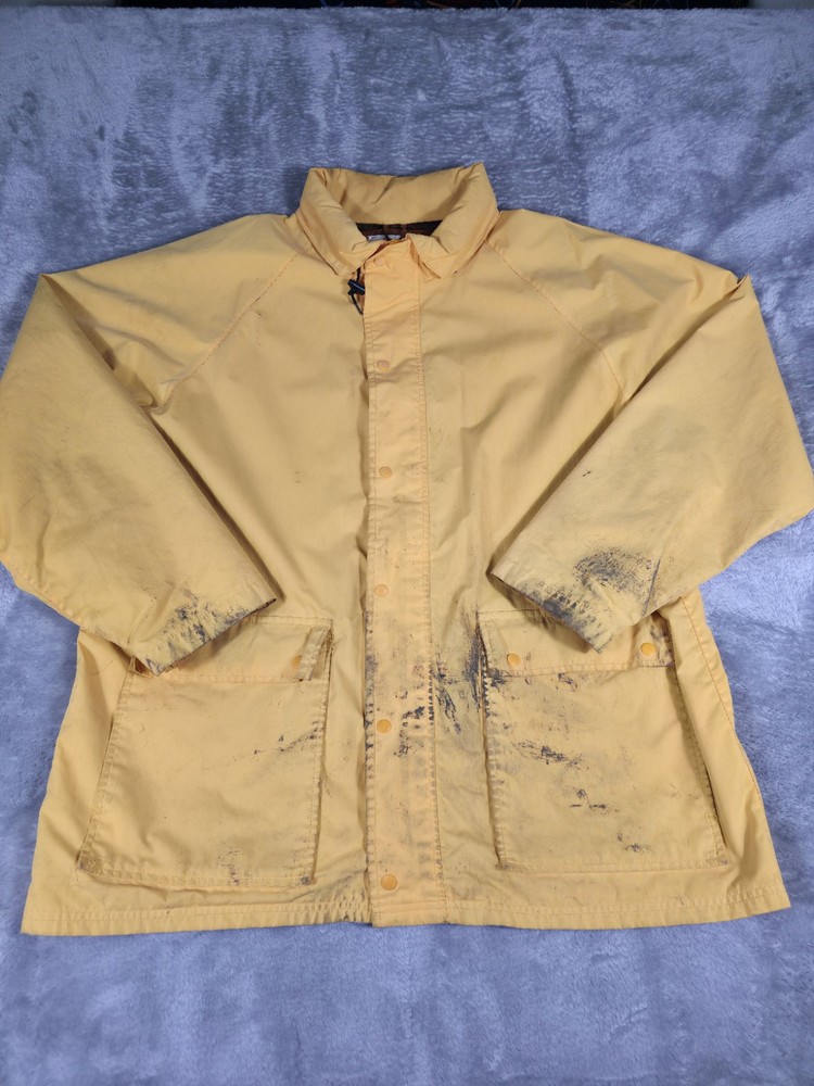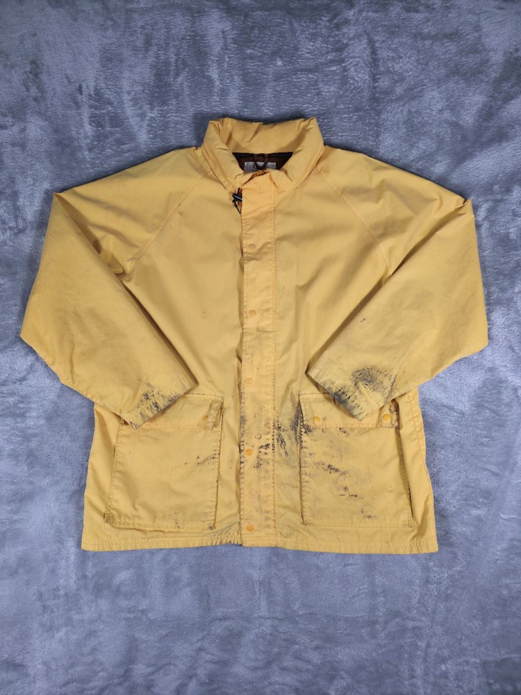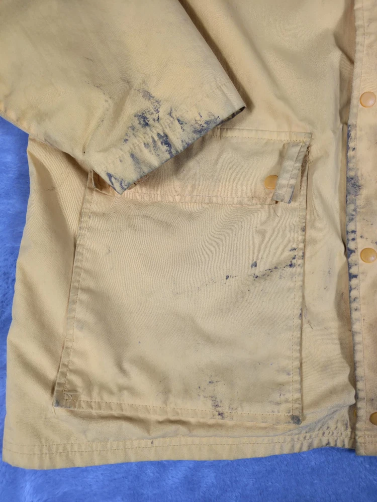 This vintage Orvis raincoat is a must-have for any outdoor enthusiast. Made with Gore-Tex, it is water and wind-resistant, making it perfect for any rainy or windy day. The jacket features a full zip closure with additional snap buttons, elastic waist, and lightweight material, making it comfortable and practical for everyday wear or outdoor activities such as camping, hiking, and fishing. This is a pre owned item and will have some staining and wear.