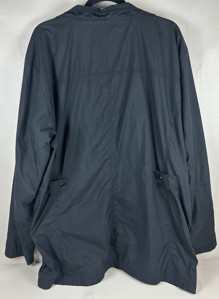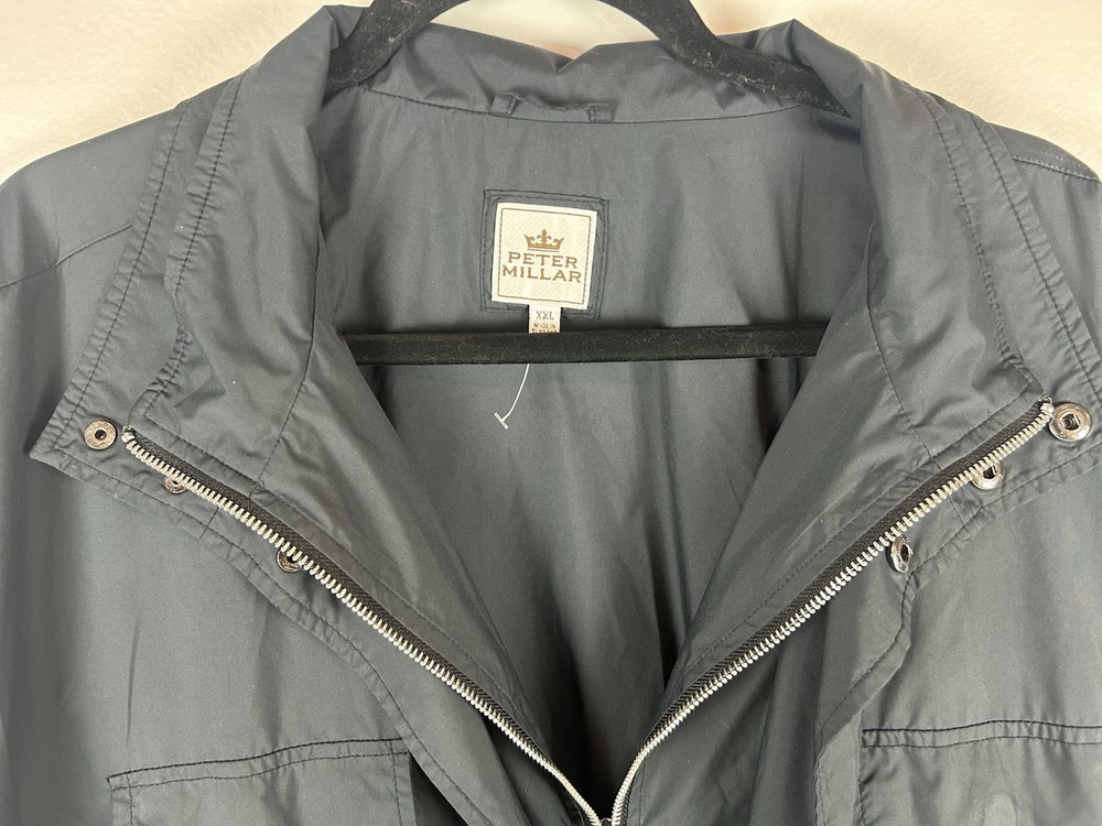 Crafted for the discerning gentleman, this Peter Millar Windbreaker Jacket combines functionality with classic style. The sleek black jacket is made from durable polyester, ensuring a comfortable experience that endures various outdoor activities such as golf, hiking, and walking. With a versatile mid-length cut and a practical elastic waist, the coat adapts to your form for a flattering fit. The jacket features a full zip closure with a stand-up collar, providing essential protection against the elements. Lined with polyester and featuring zipped pockets, the design ensures your essentials stay secure and dry. The lightweight yet wind-resistant and water-wicking qualities make it an ideal choice for all seasons, whether you're braving the wind or light drizzle. JACKET DOES HAVE A FEW STAIN ON THE INSIDE WHICH ARE PICTURED PLEASE REFER TO PICTURES CONDITIONS OF ITEM FEEL FREE TO REACH OUT FOR FURTHER QUESTIONS THANKS FOR LOOKING!