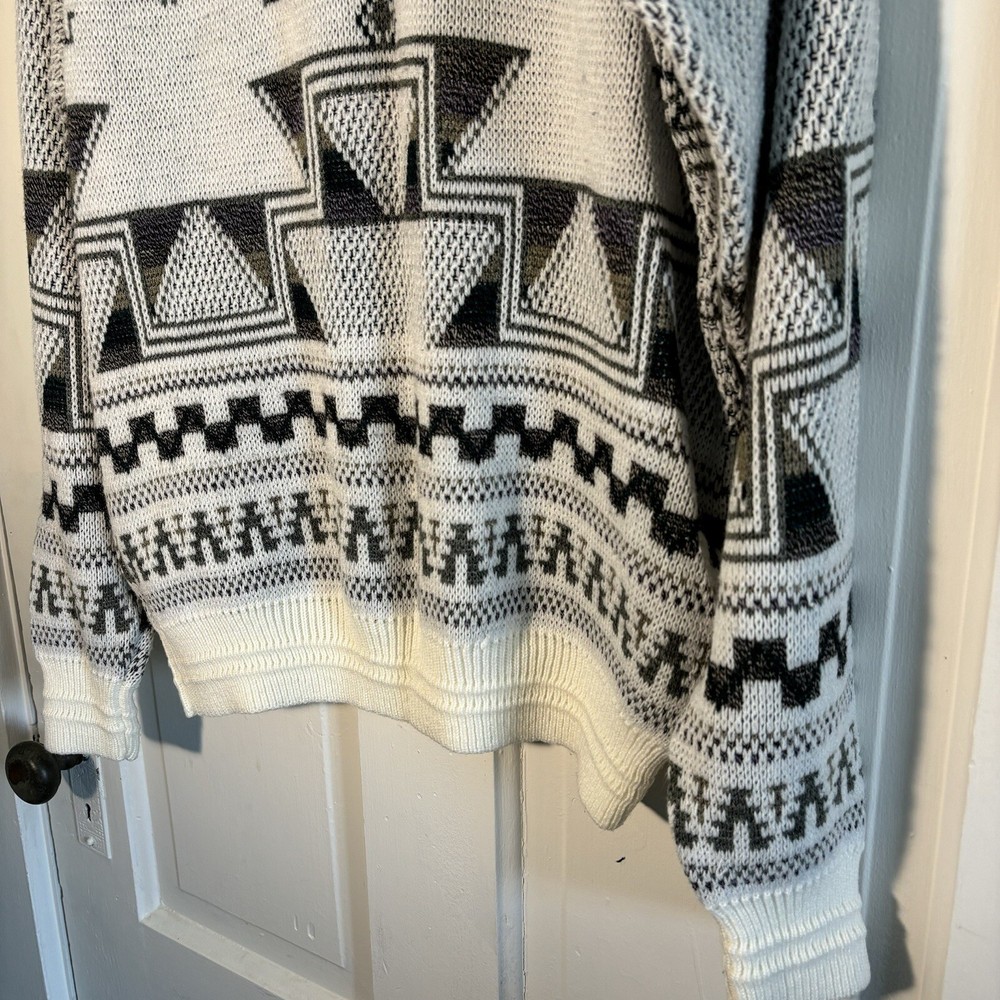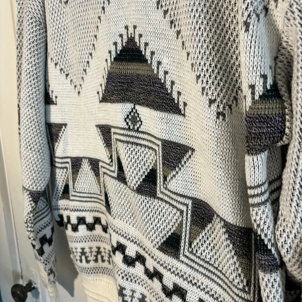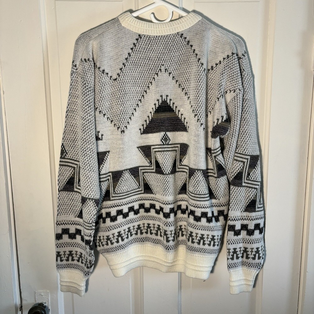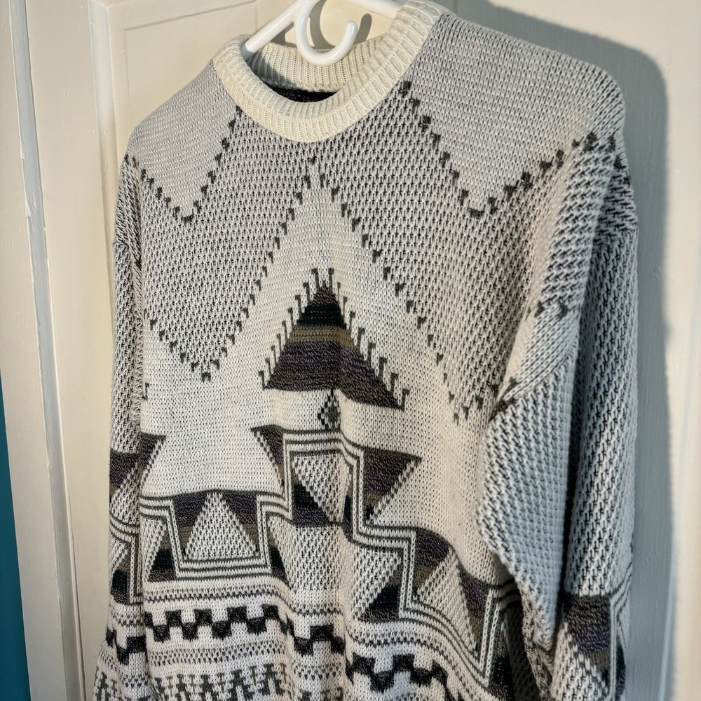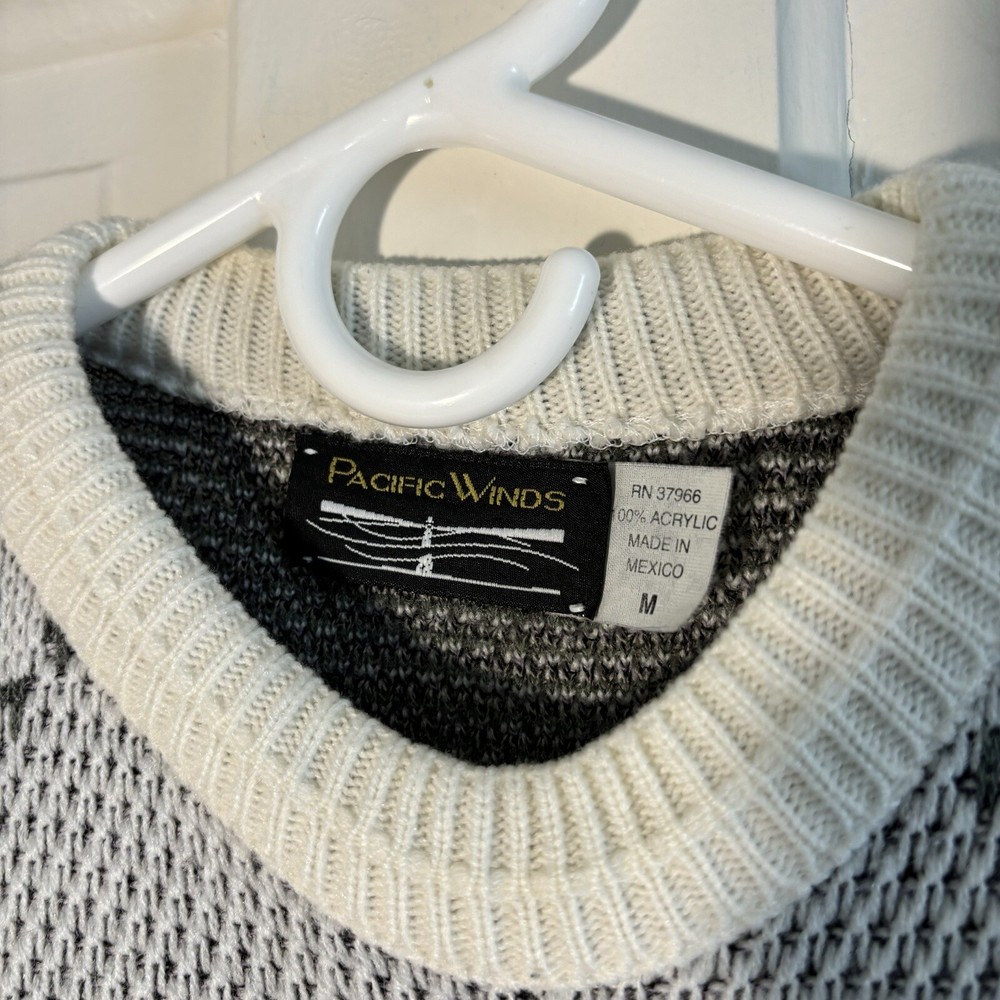 This vintage Pacific Winds sweater is a true gem for any 90s enthusiast. The sweater features a unique geometric pattern in purple and white, and fits a size M with a regular fit. Made of acrylic knit fabric, this sweater is machine washable and perfect for all seasons. The crew neck and long sleeves make it ideal for casual occasions, while the tight-knit style and knitted accents add a touch of vintage charm. The sweater is in great condition and ready to be worn by its new owner. Don't miss out on the chance to add this rare piece to your collection.