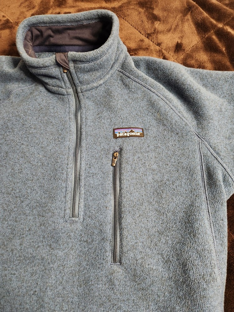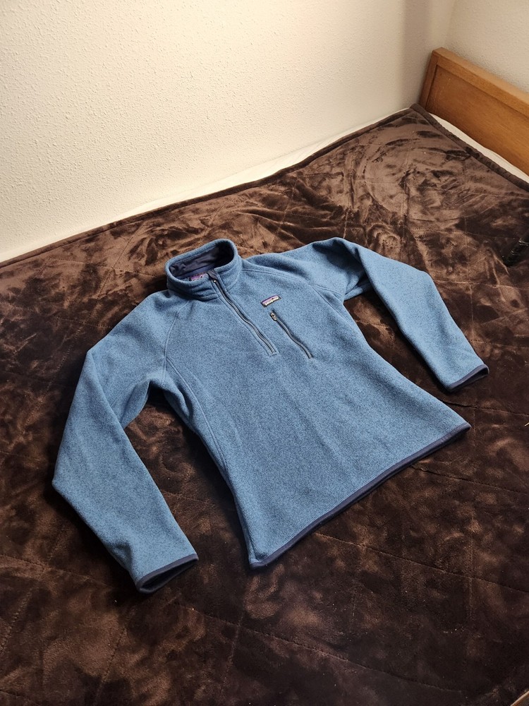 For sale is a vintage Patagonia Better Sweater Fleece Jacket in a men's size small. This blue jacket features a 1/4 zip closure, stand-up collar, and zipped pockets. It is made of polyester and has a solid pattern. The jacket is perfect for travel, casual wear, and workwear. This limited edition jacket is wind-resistant and breathable, making it suitable for all seasons, including winter, fall, and spring. It is packable and has a bodywarmer feature, making it ideal for outdoor activities such as walking, golf, hunting, skiing, and hiking. The jacket is machine washable and has a vintage look.