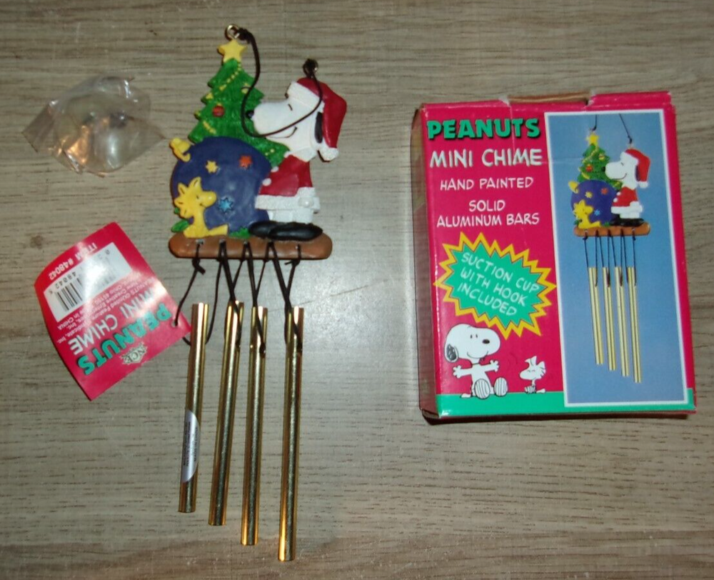 Vintage Peanuts Snoopy Woodstock Christmas Mini Solid Bars Wind Chime NEW IN BOX Dated 1996. Hand painted, solid aluminum bars, suction cup with hook included bin j...