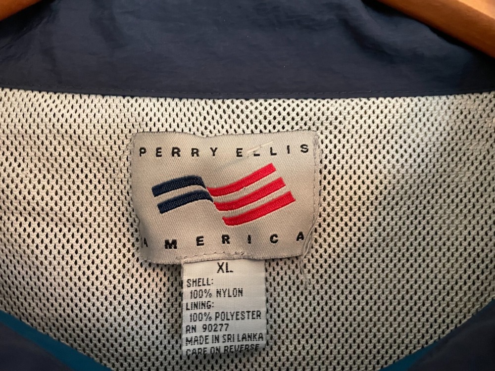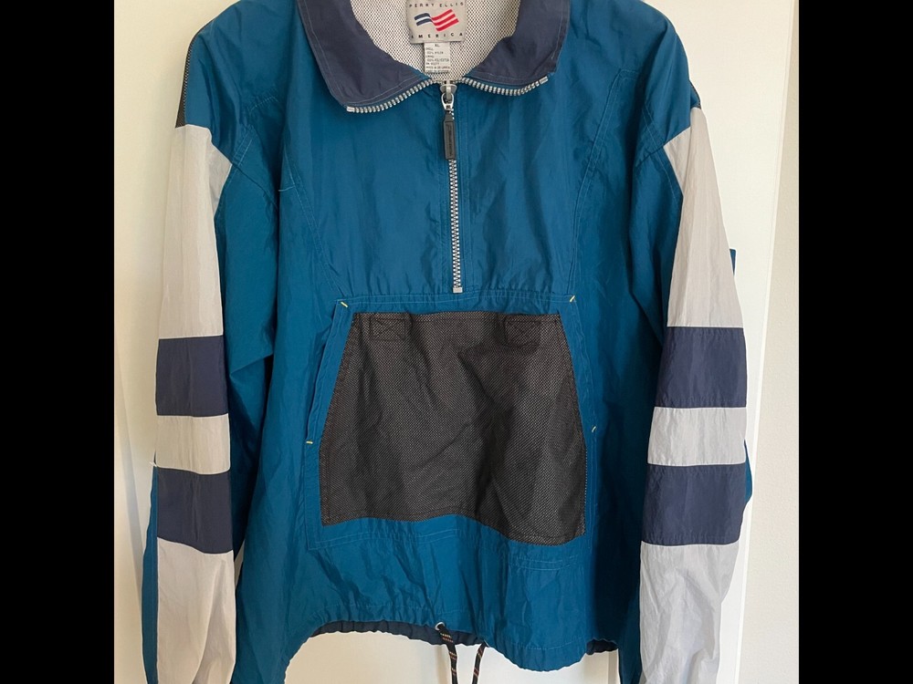 Vintage 90s Perry Ellis America Sailing Windbreaker XL Jacket Blue, Grey, White, with yellow logo box on back. Condition is "Pre-owned" as brand new. Nylon with mesh lining Partial Zip down "AMERICA" ...