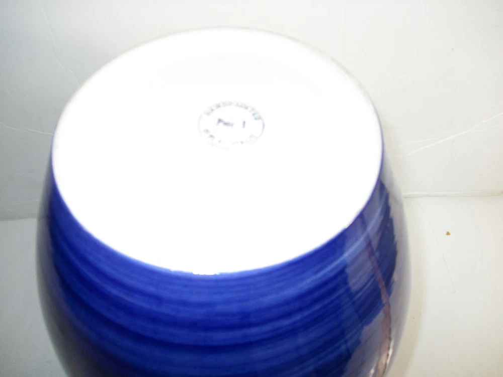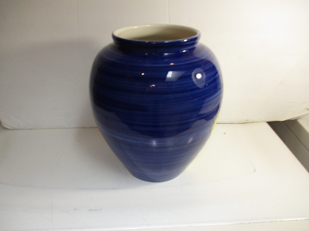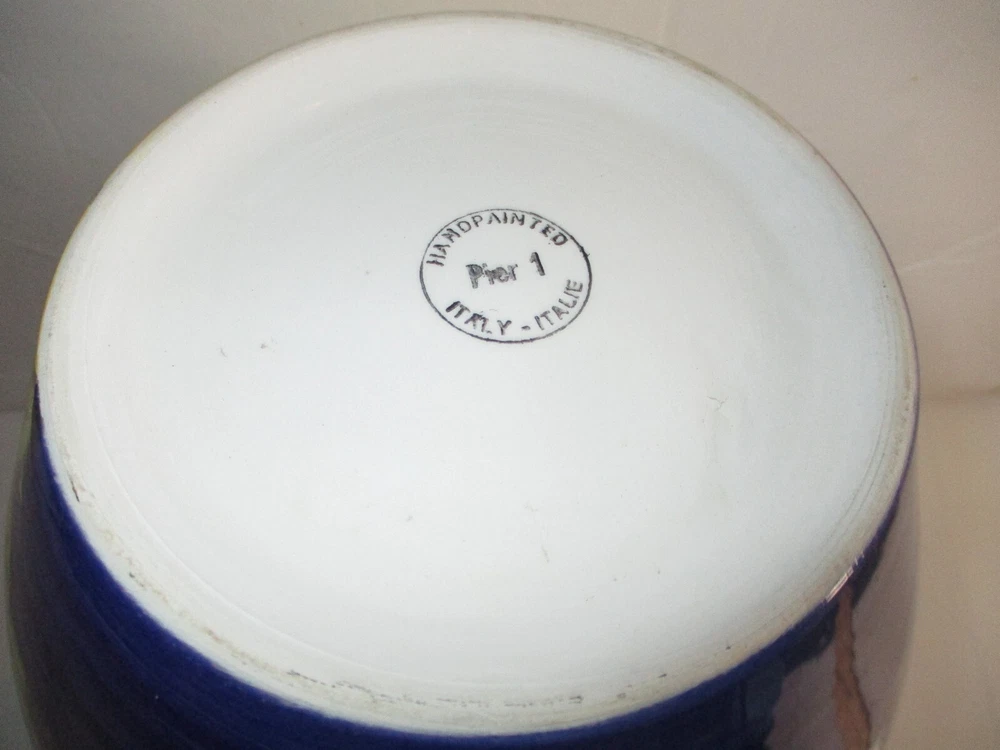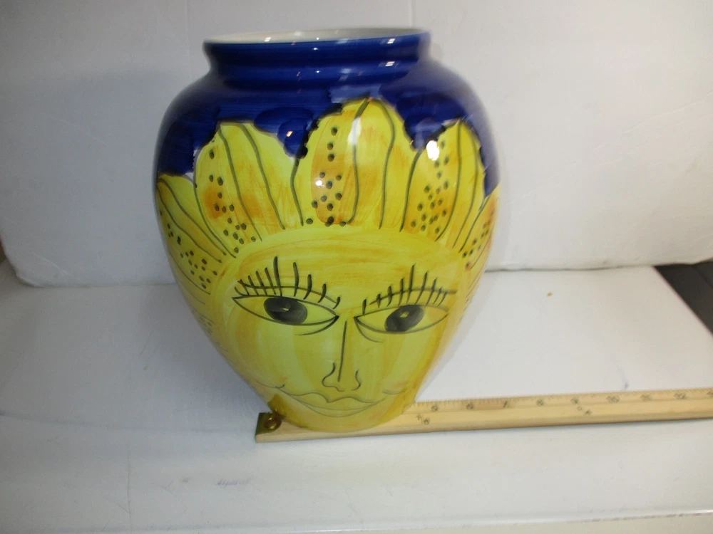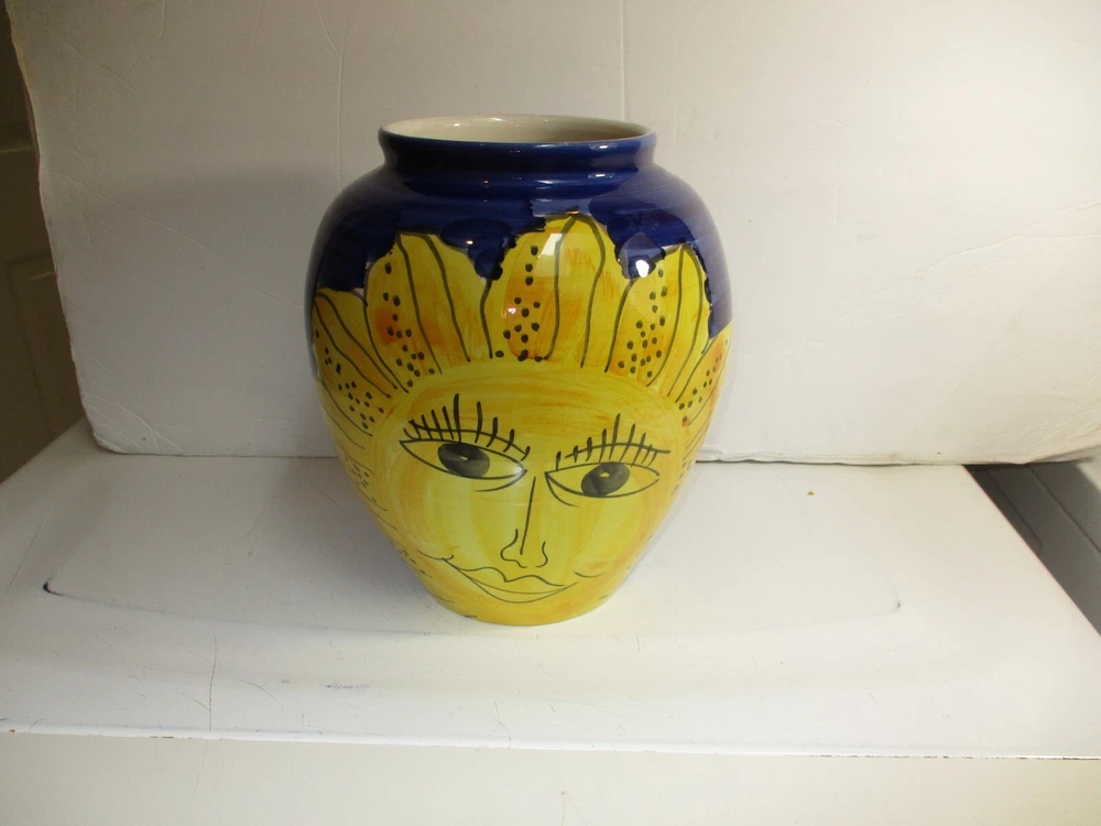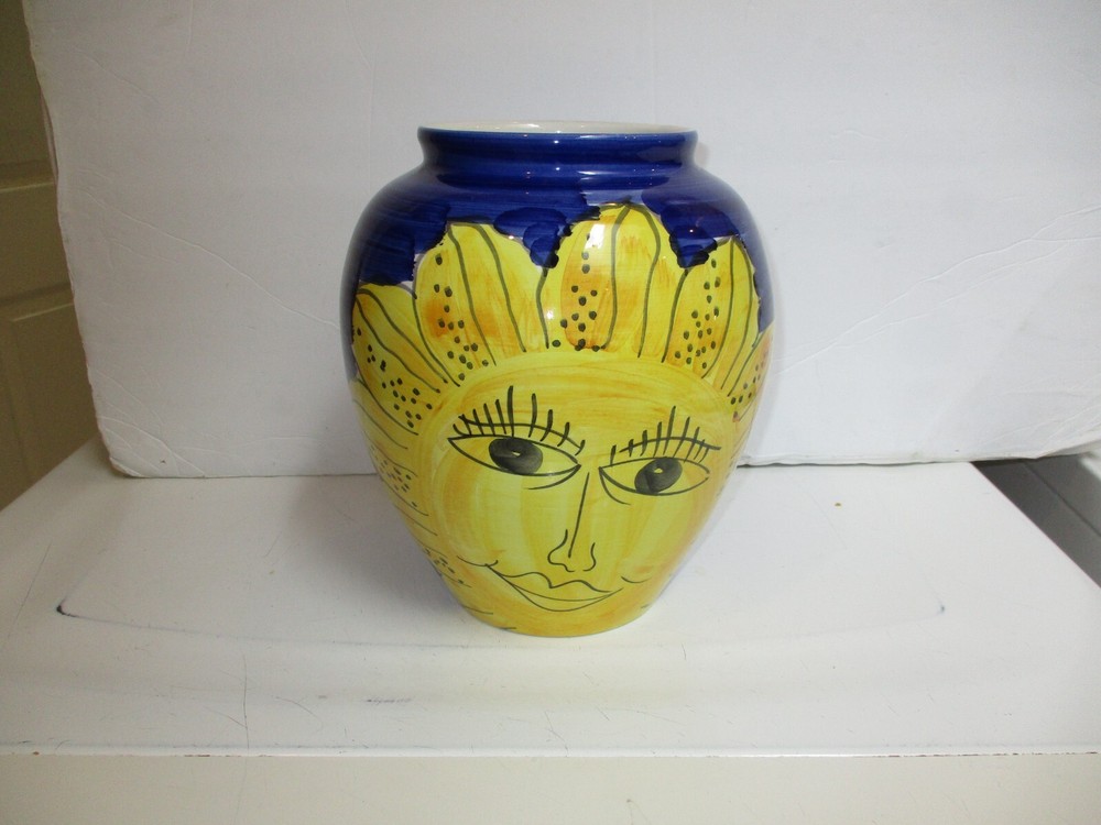Vintage Pier 1 Ceramic Pitcher Vase Sun Flower or Sunshine Design Blue & Yellow Made in Italy 11". Super awesome late 1980s- 19990s design, hand painetd Italy for Pier 1, bottom is markerd. Large vase, pretty blue with bright yellow sun flower sun shine face. Glossy finish, bright colors, no chips or cracks, small flaw on bottom ** see last picture. 11" high, bottom base is 5" and top is over 7", measurements are approx. Item is large and heavy, will be packed with care but due to size shipping will run high. USPS or UPS shipping will be 28.99 the best price and best service will be used and this item will be packaged very carefully for safe shipping. I am unable to ship overseas, and international and I do not use freight forwarding. I have several other clothing items, vintage and collectibles , tea cups, jewelry, collectibles , book lots and DVDs, please visit my page and check back for updates. Please feel free to ask questions and thanks for looking. *