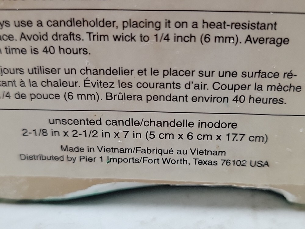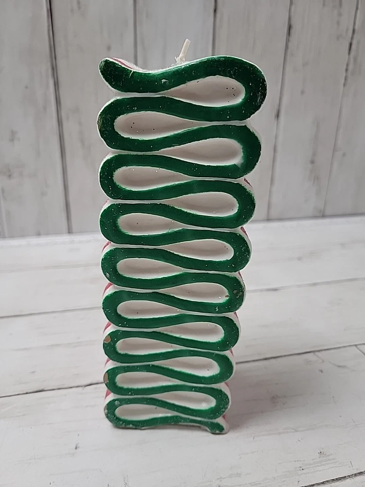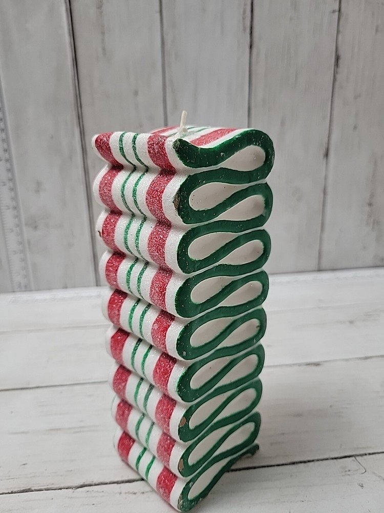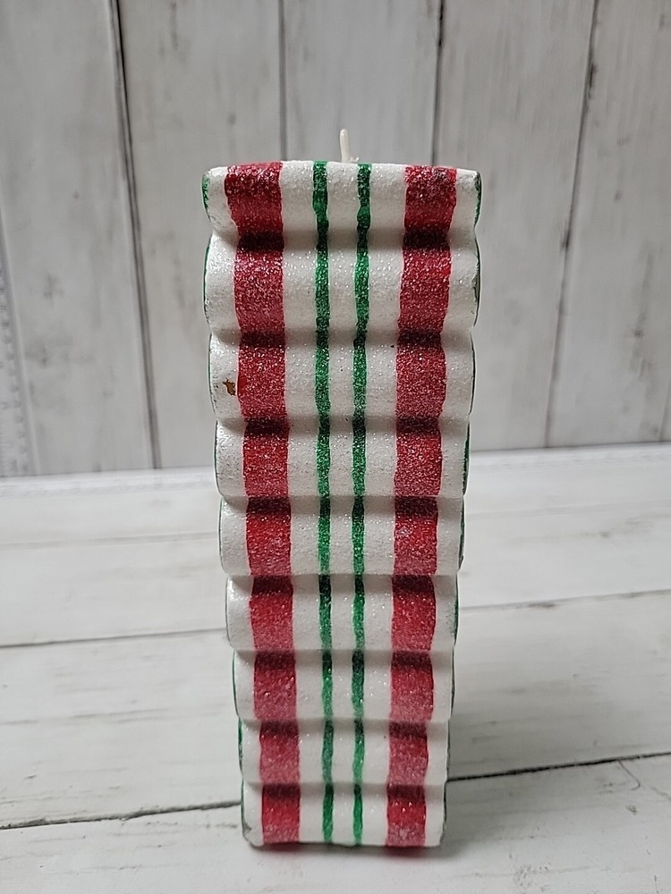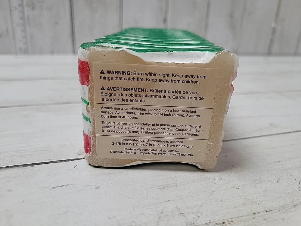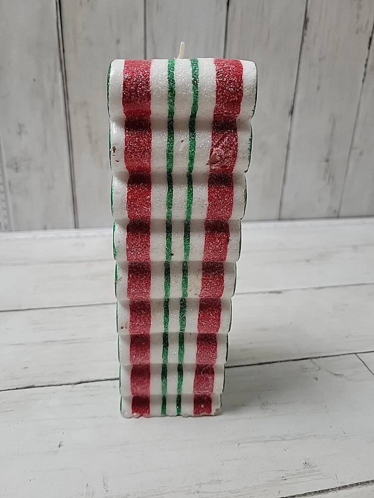 Vintage Pier 1 Imports Christmas Candle White With Red & Green Candy Design 7"x 2.25". It has a couple of nicked spots. See photos and zoom in for preowned condition. We combine shipping....