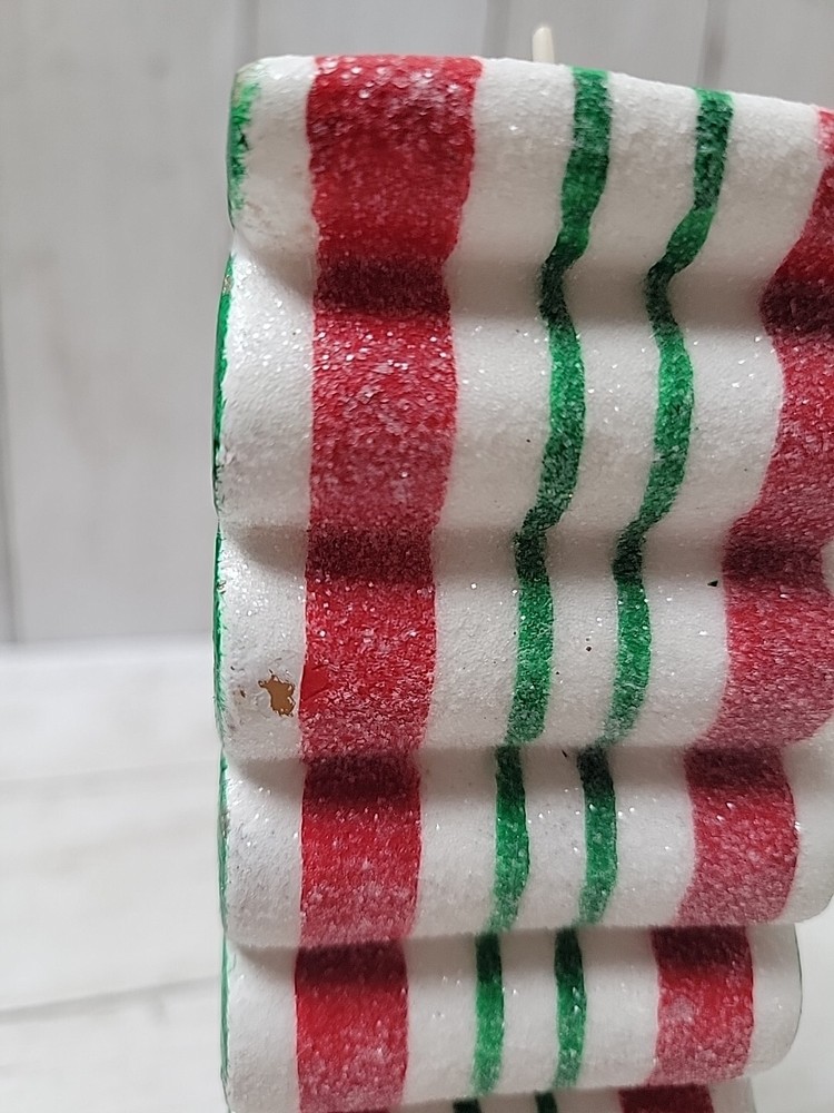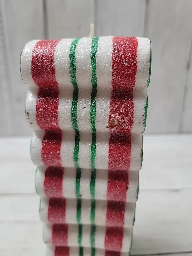 Vintage Pier 1 Imports Christmas Candle White With Red & Green Candy Design 7"x 2.25". It has a couple of nicked spots. See photos and zoom in for preowned condition. We combine shipping.