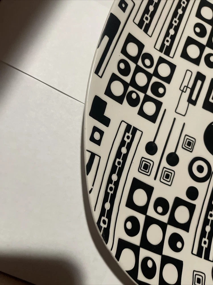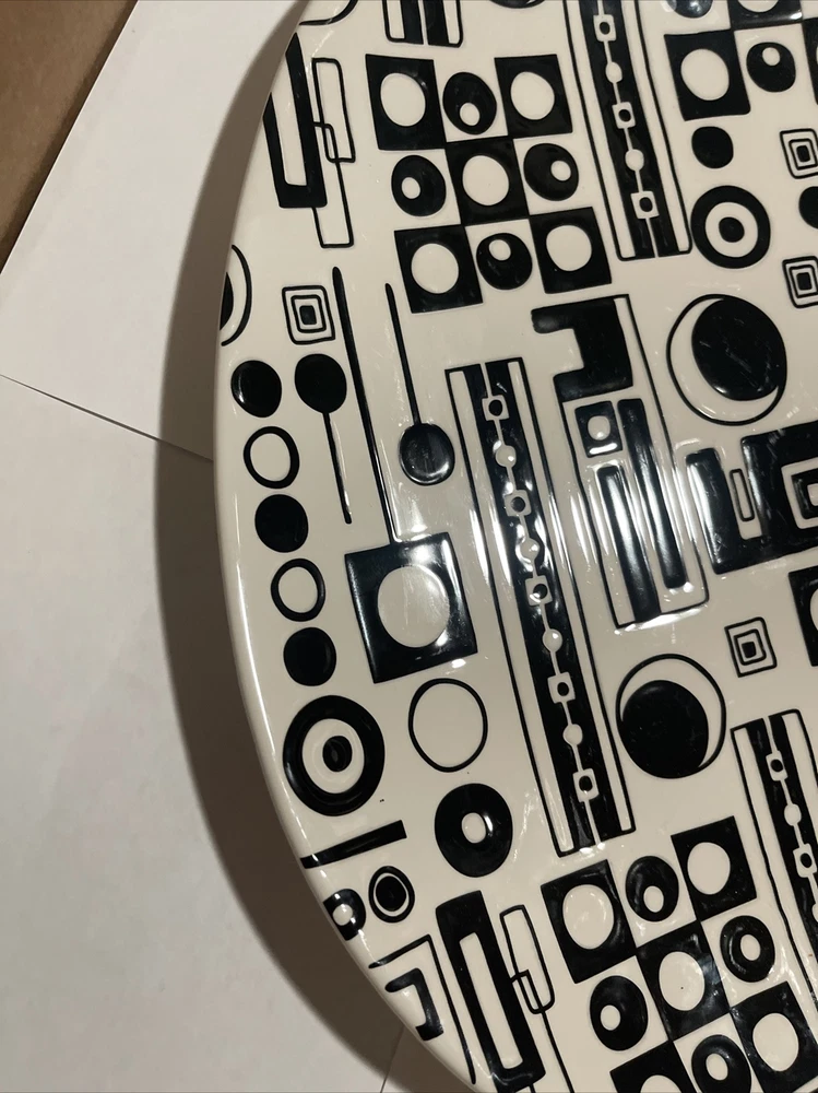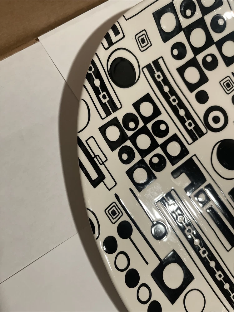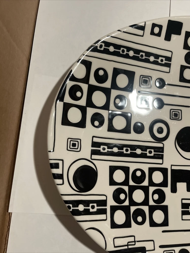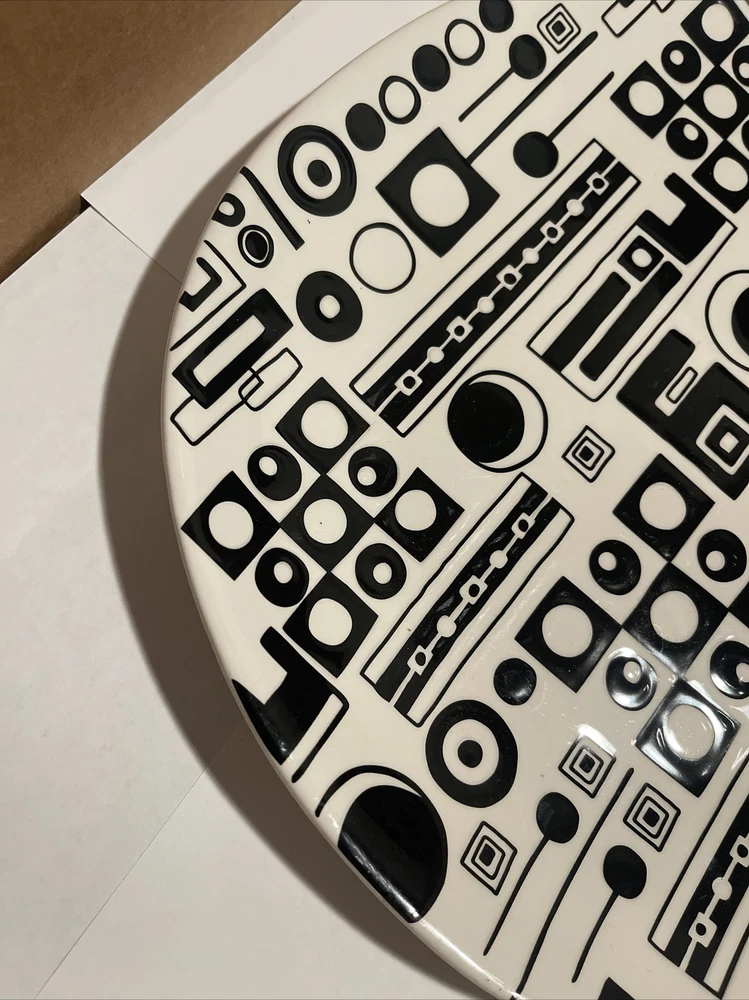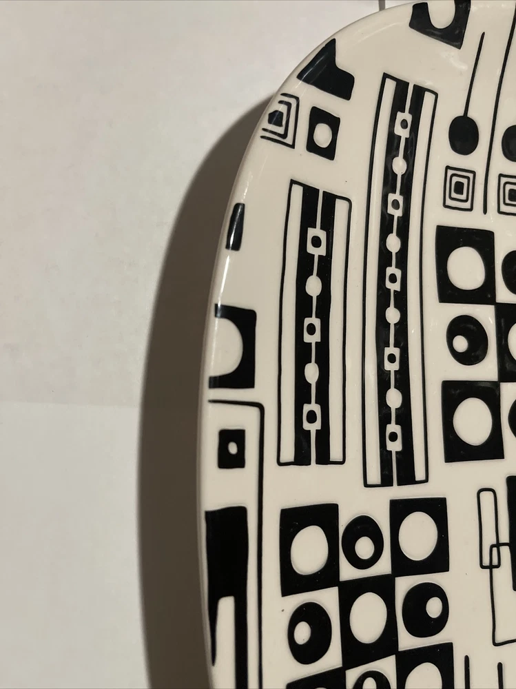 NO CHIPS , NO SCRATCHES , NO CRACKS Complete your set!! Add a touch of vintage to your dinnerware collection with this Pier 1 Imports Traffix oval plate. The black and white art/geometric design adds a unique touch to your dining experience. This earthenware plate has a shiny finish and measures 12 inches in length. Its oval egg shape makes it a great addition to your dinner table. Use it to serve appetizers or desserts to your guests. The plate is in great shape and ready to be used for your next gathering.