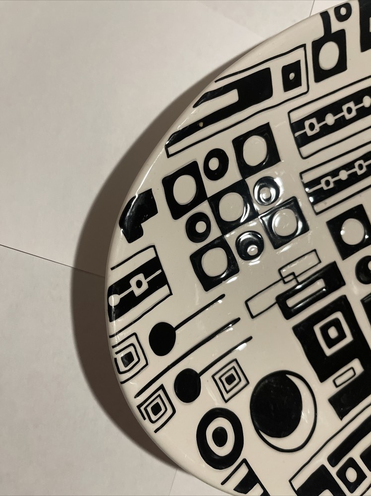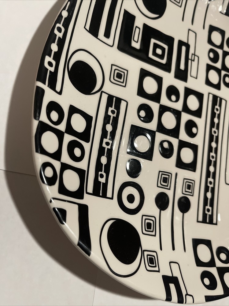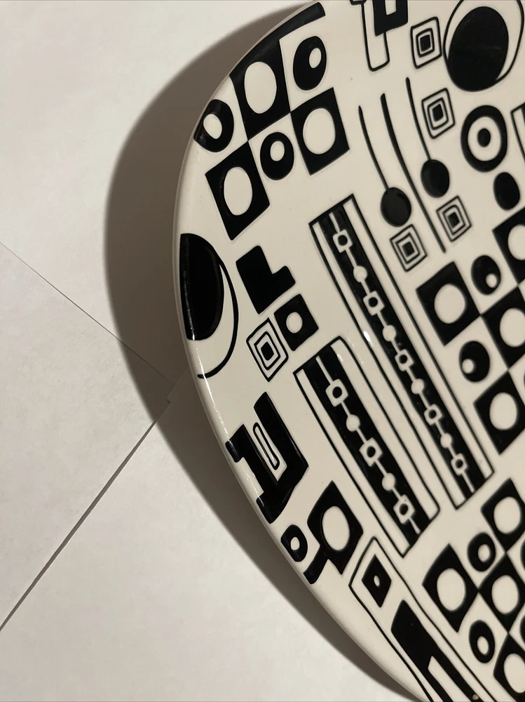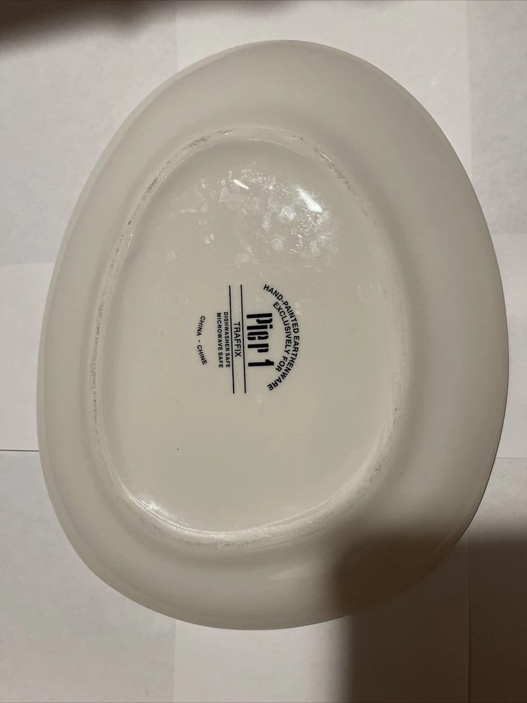 NO CHIPS , NO CRACKS , NO DAMGE . Complete your set :) Add a touch of vintage charm to your dinnerware collection with this oval plate from Pier 1 Imports. The plate features a unique traffix design in black and white, adding an artistic touch to your dining experience. Crafted from high-quality earthenware with a shiny finish, this plate is perfect for serving up your favorite meals and snacks. Measuring 9.5 inches in length, this oval plate is perfect for any occasion, whether it's a casual family dinner or a formal dinner party. The retro style and art theme make it a great addition to any kitchen or dining room. Bring home this vintage Pier 1 Imports plate today and add a touch of elegance to your dining experience.