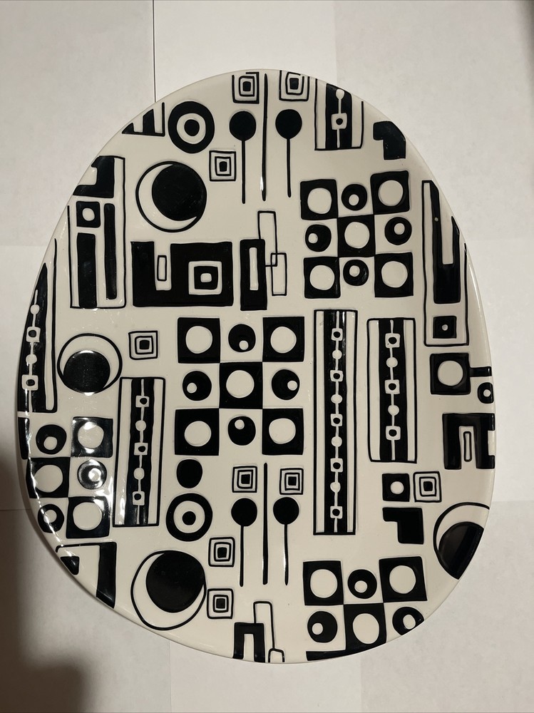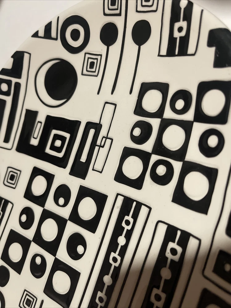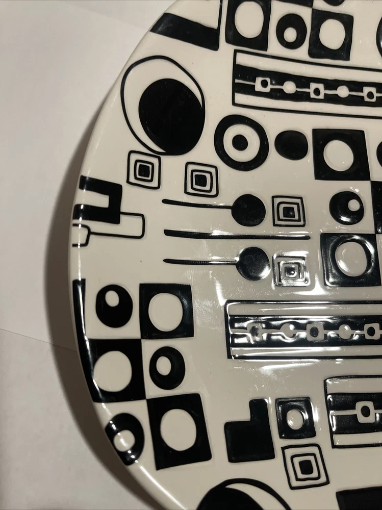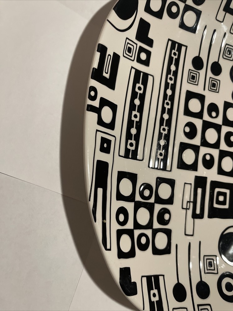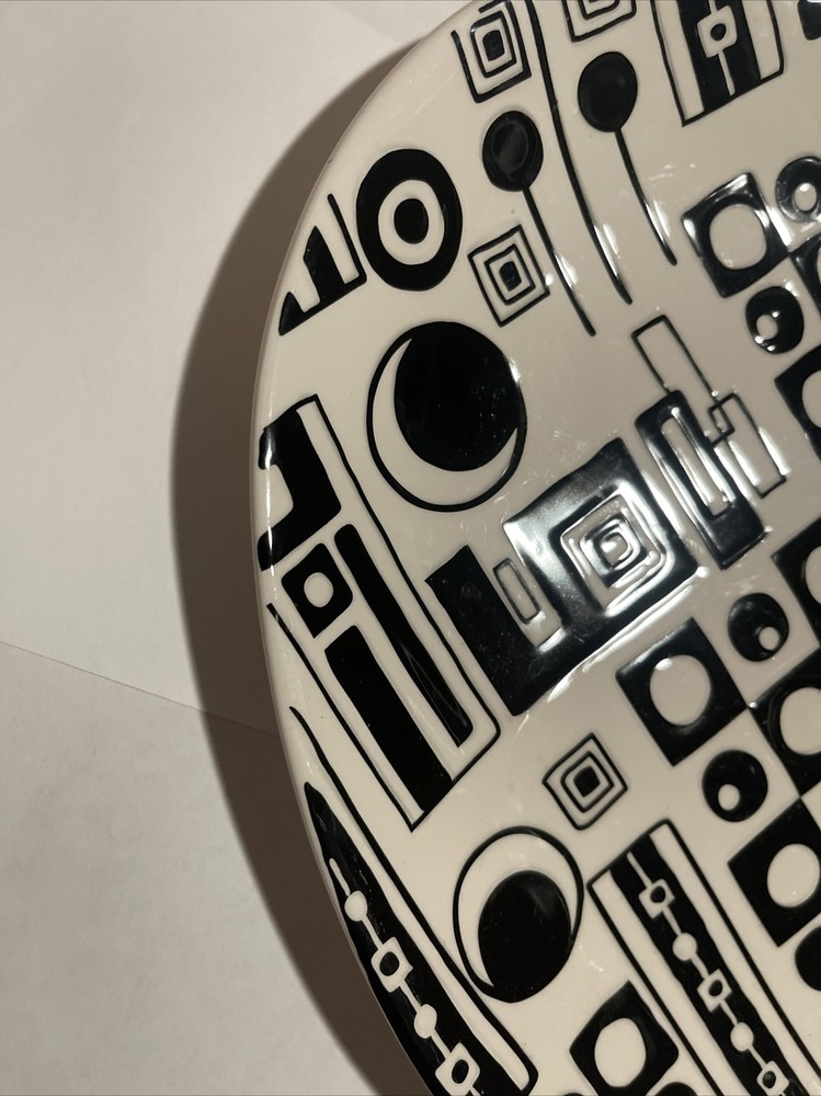NO CHIPS , NO CRACKS , NO DAMGE . Complete your set :) Add a touch of vintage charm to your dinnerware collection with this oval plate from Pier 1 Imports. The plate features a unique traffix design in black and white, adding an artistic touch to your dining experience. Crafted from high-quality earthenware with a shiny finish, this plate is perfect for serving up your favorite meals and snacks. Measuring 9.5 inches in length, this oval plate is perfect for any occasion, whether it's a casual family dinner or a formal dinner party. The retro style and art theme make it a great addition to any kitchen or dining room. Bring home this vintage Pier 1 Imports plate today and add a touch of elegance to your dining experience.