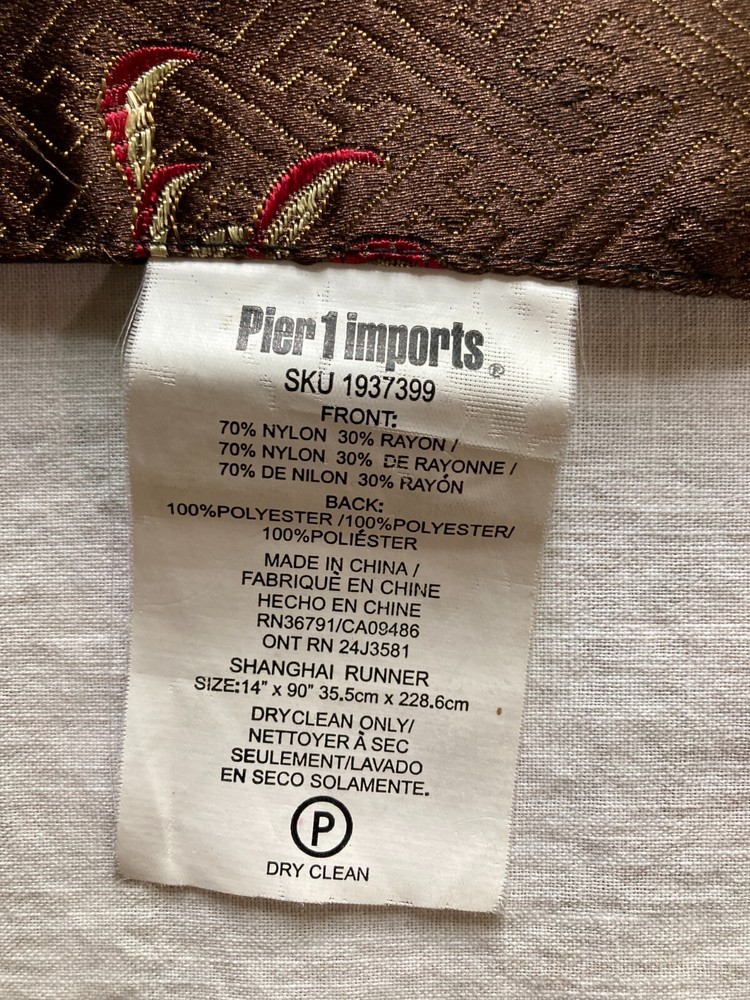 For sale is a Pier 1, "Shanghai", table runner in good, used condition. It is 90" x 14" and I didn't see any noticeable issues. It is a nylon rayon blend. Please view photos for details. Thank you for looking. Please contact us with any questions or issues through Ebay messages. We are a pet and smoke free home and will combine ship.